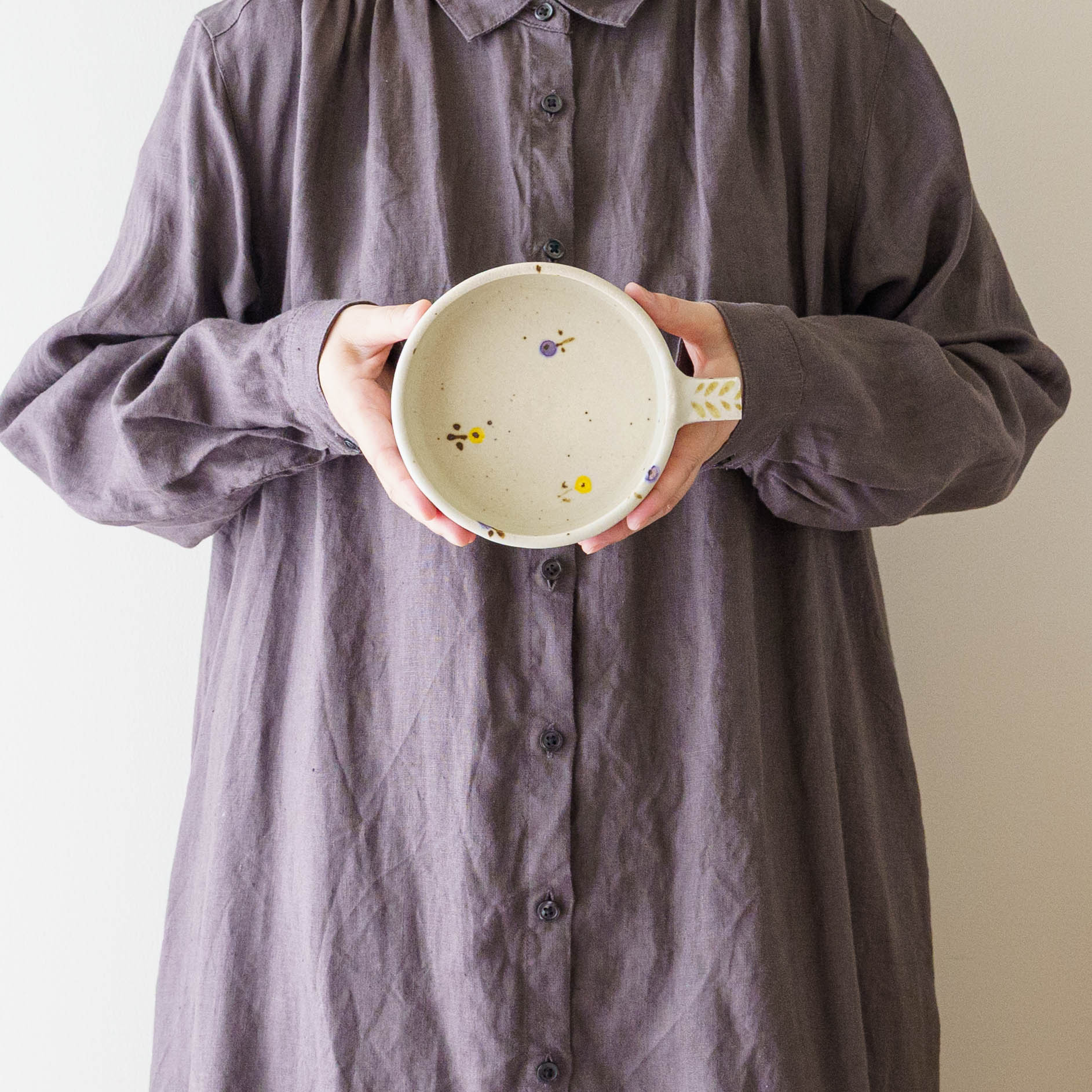 ざらりとした小さな質感。土の中の鉄分が焼成中に浮かび上がる黒点やうつわが呼吸したようなピンホール。ひとつひとつに手しごとの小さな物語が宿っています。たくさん使っても飽きのこない、でも見るたびちょっと気持ちが浮き立つ。そんな自分だけのうつわをぜひ楽しんでください。