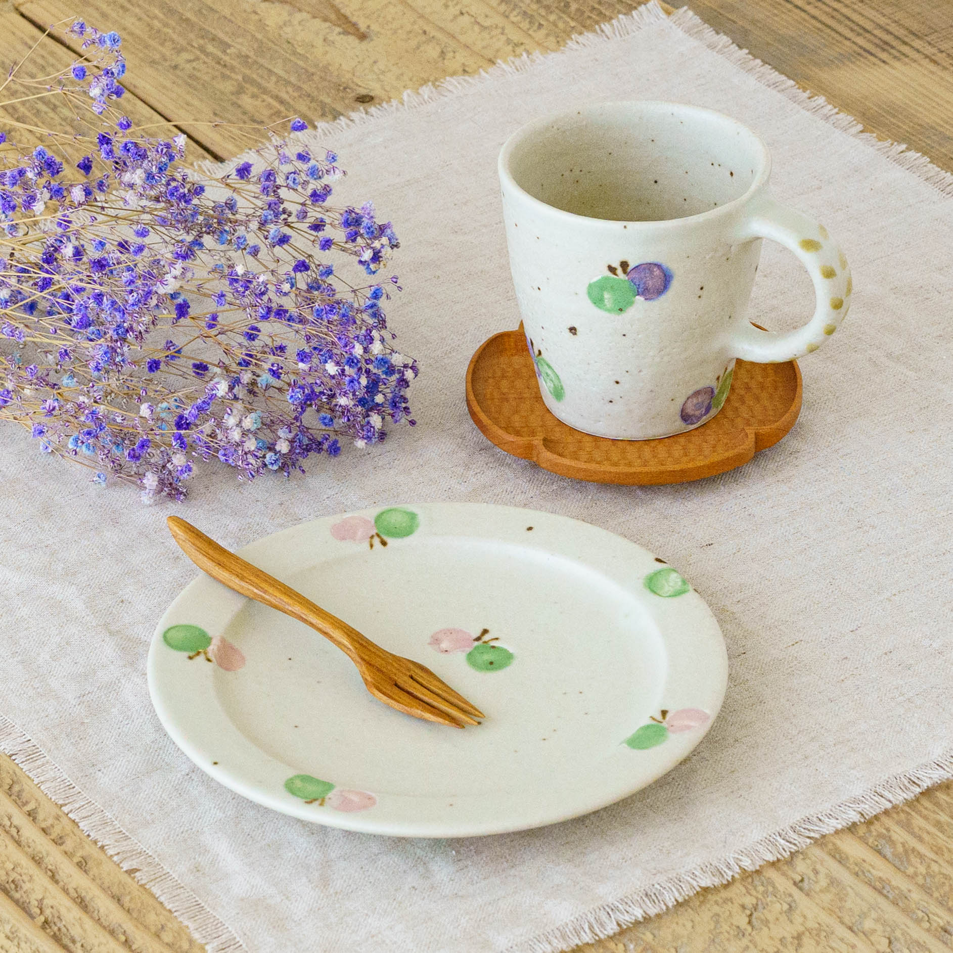 淡くやさしい色合いと、思わず微笑んでしまう愛らしい佇まい。どこか懐かしく、心あたたまる絵柄は見ているだけでいろいろな表情を見せてくれます。土のぬくもりや存在感を感じられて、ふわっとあたたかな気持ちにしてくれます。