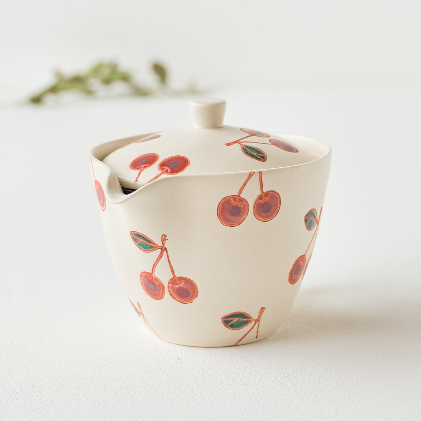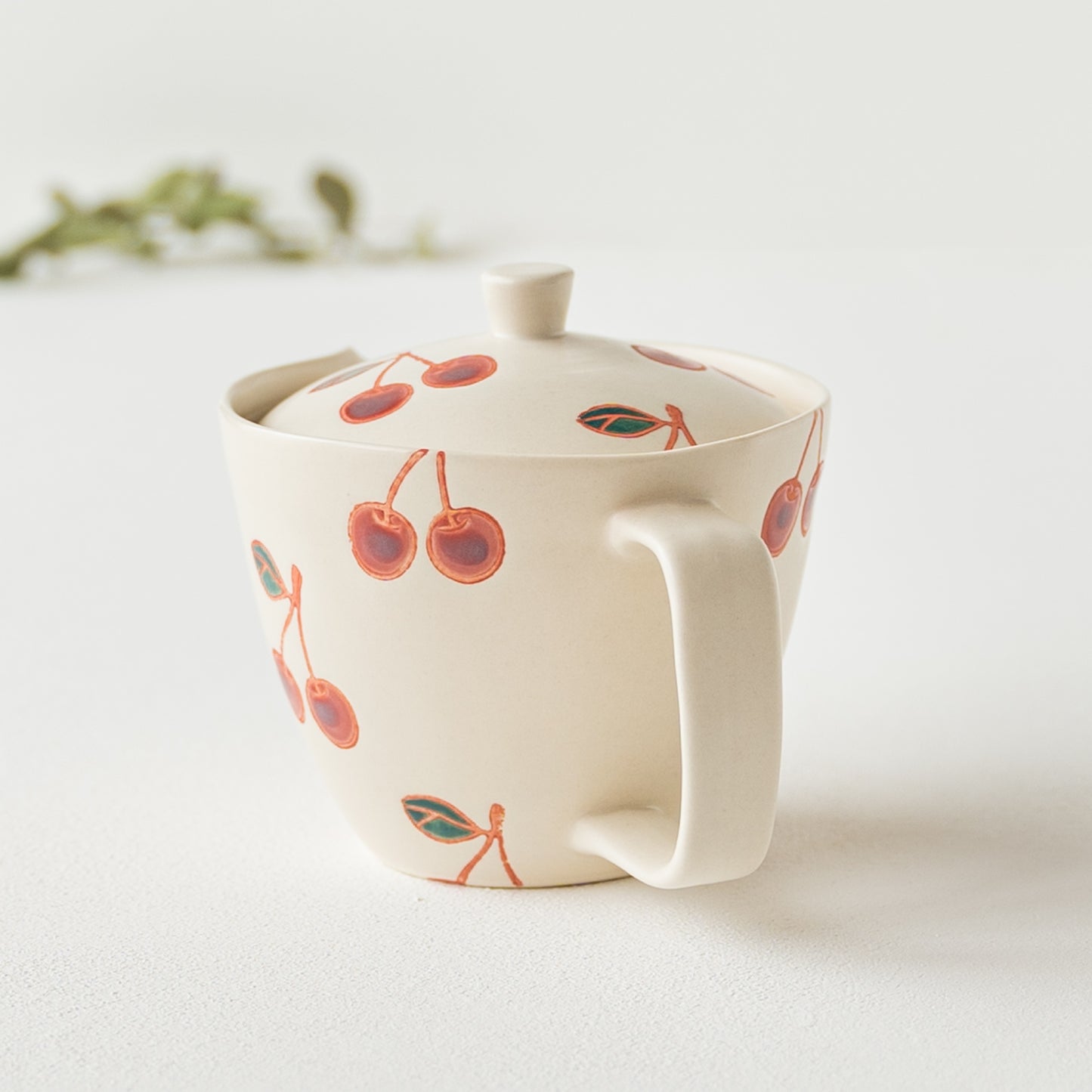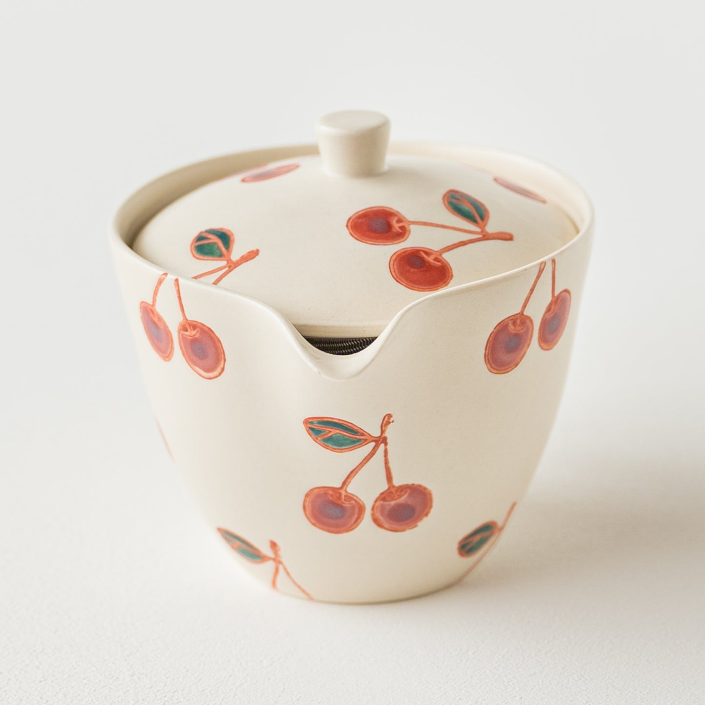 ポット全体に描かれた目を引くかわいいサクランボ。見ているだけで元気が湧いてきます。すべて手作業で描かれているので、ひとつひとつ違った表情のサクランボに優しさを感じます。