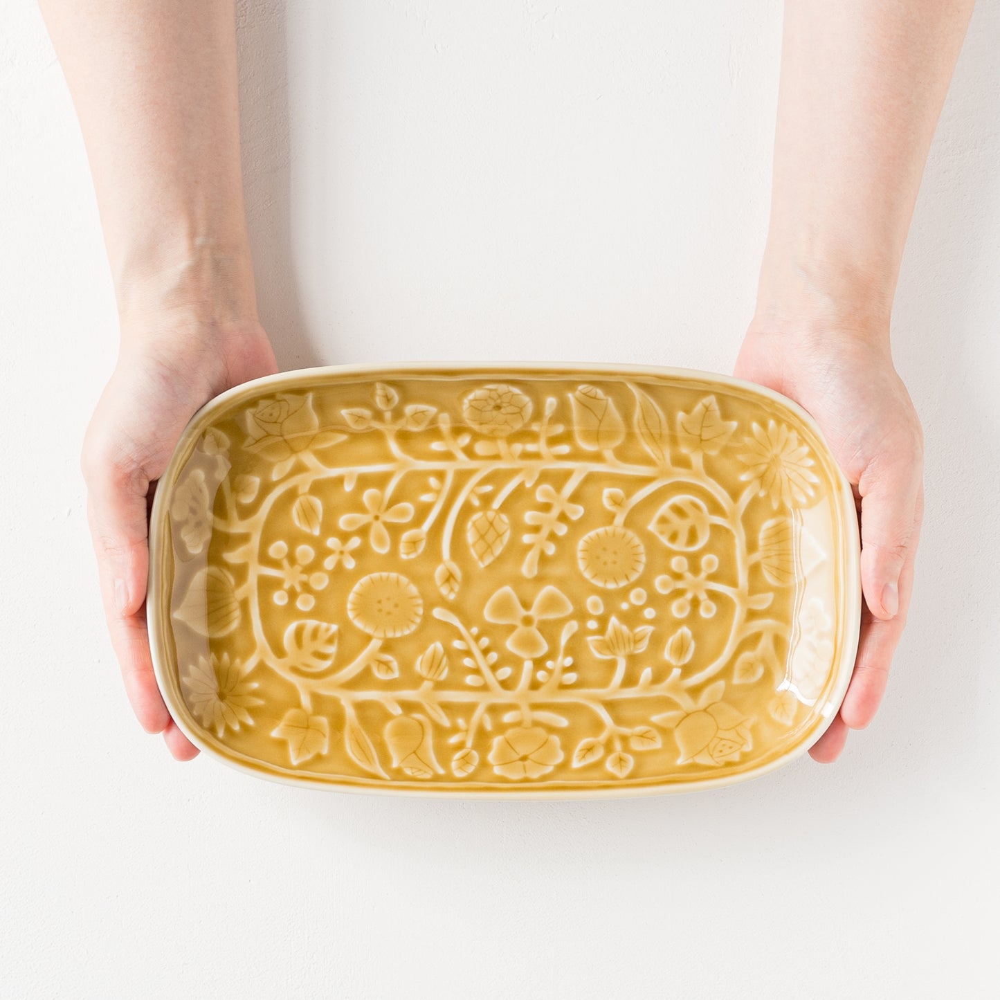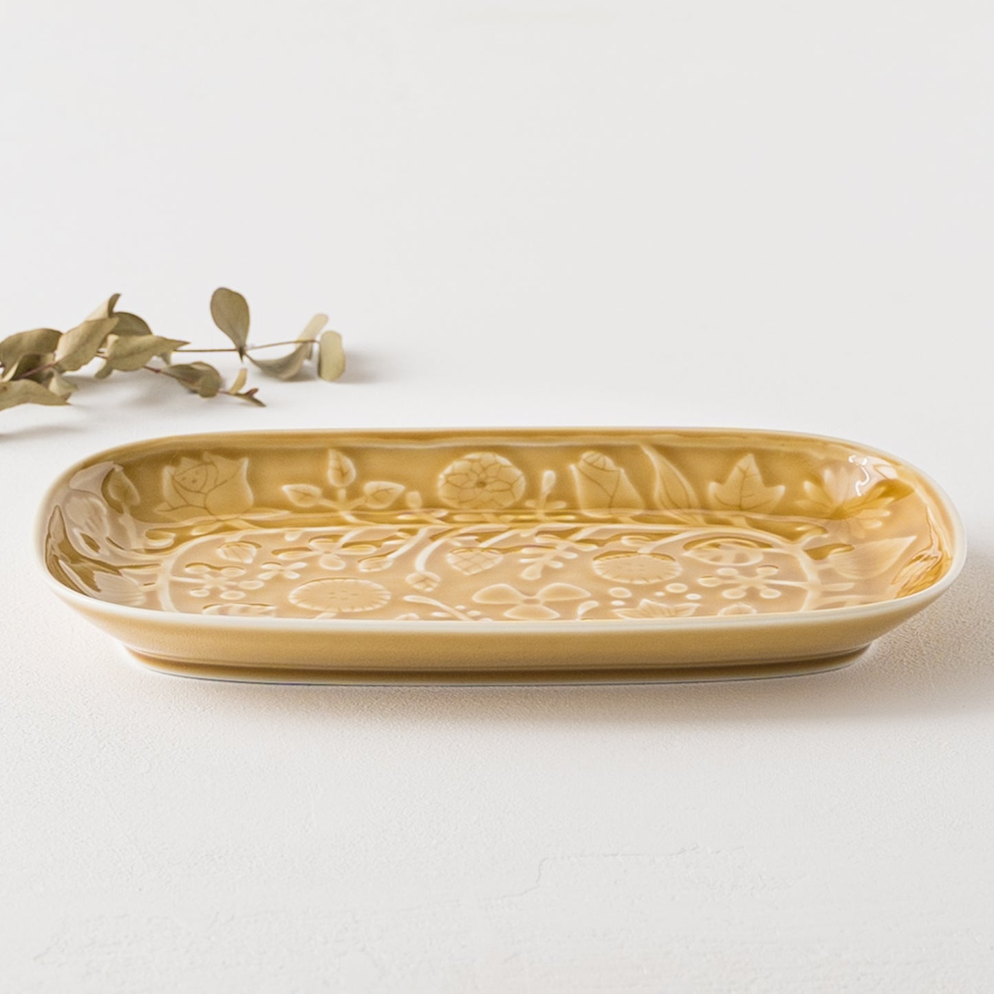プレートの表面いっぱいにお花が施されているので盛り付けたお料理が素敵に引き立ちます。丸みを帯びた長四角のフォルムにも温かみのある柔らかさを感じます。