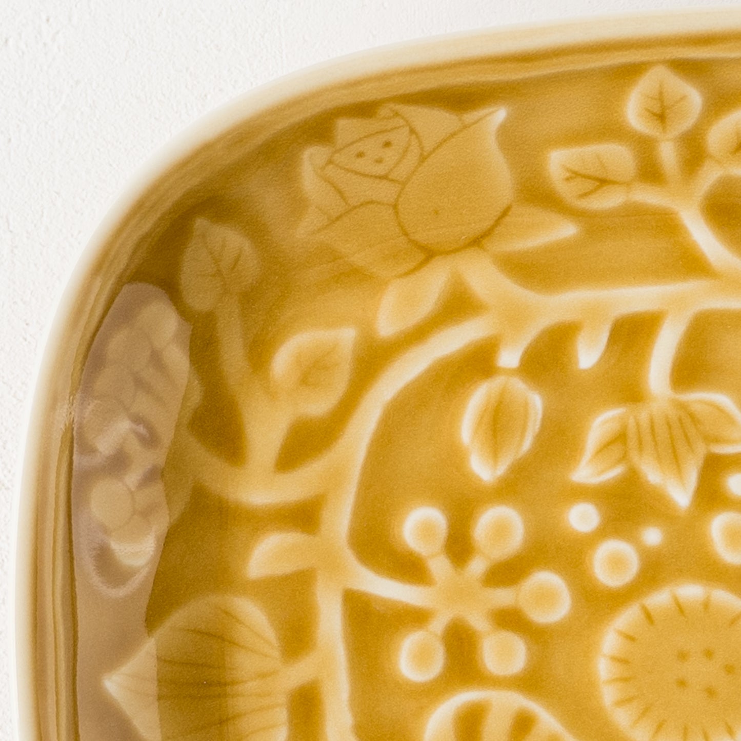 ほんのりと浮き上がったお花の模様。釉薬をかけることによってレリーフ部分に濃淡が表れて素敵な表情に仕上がっています。