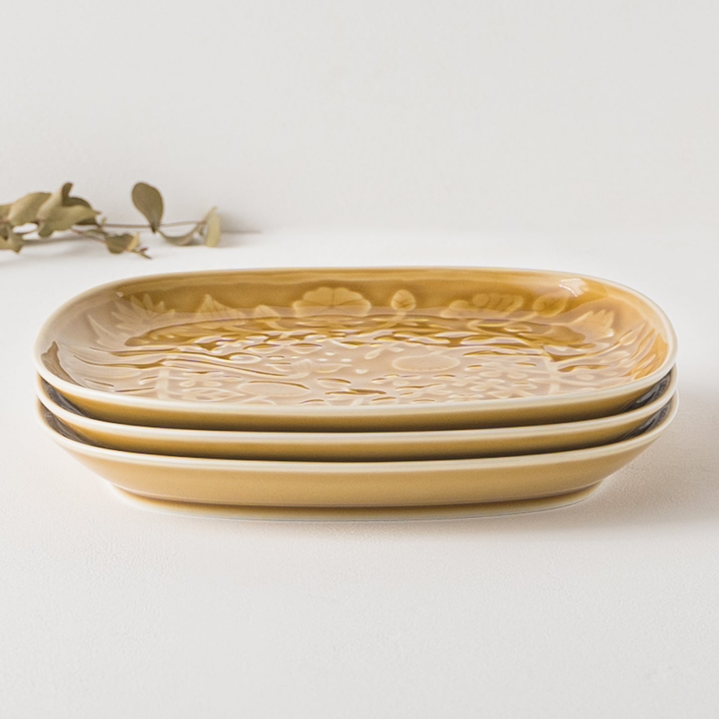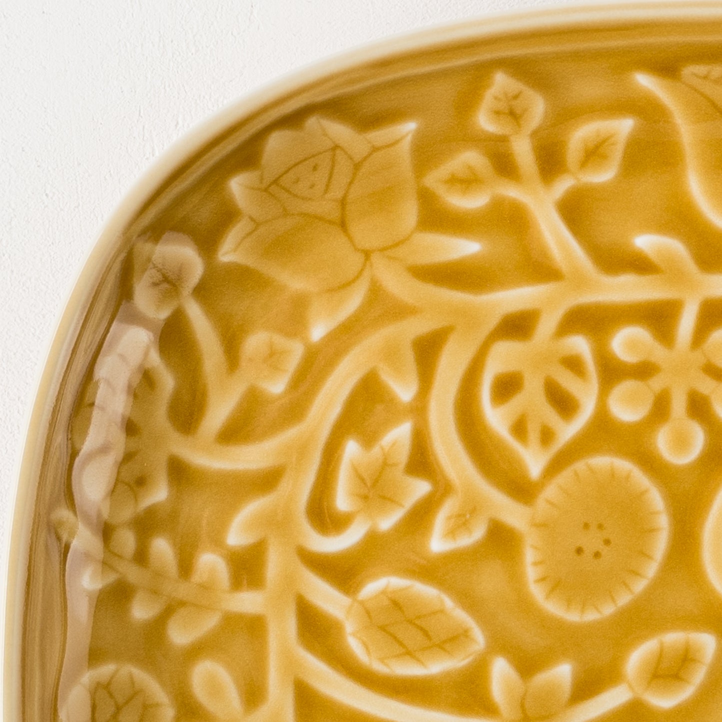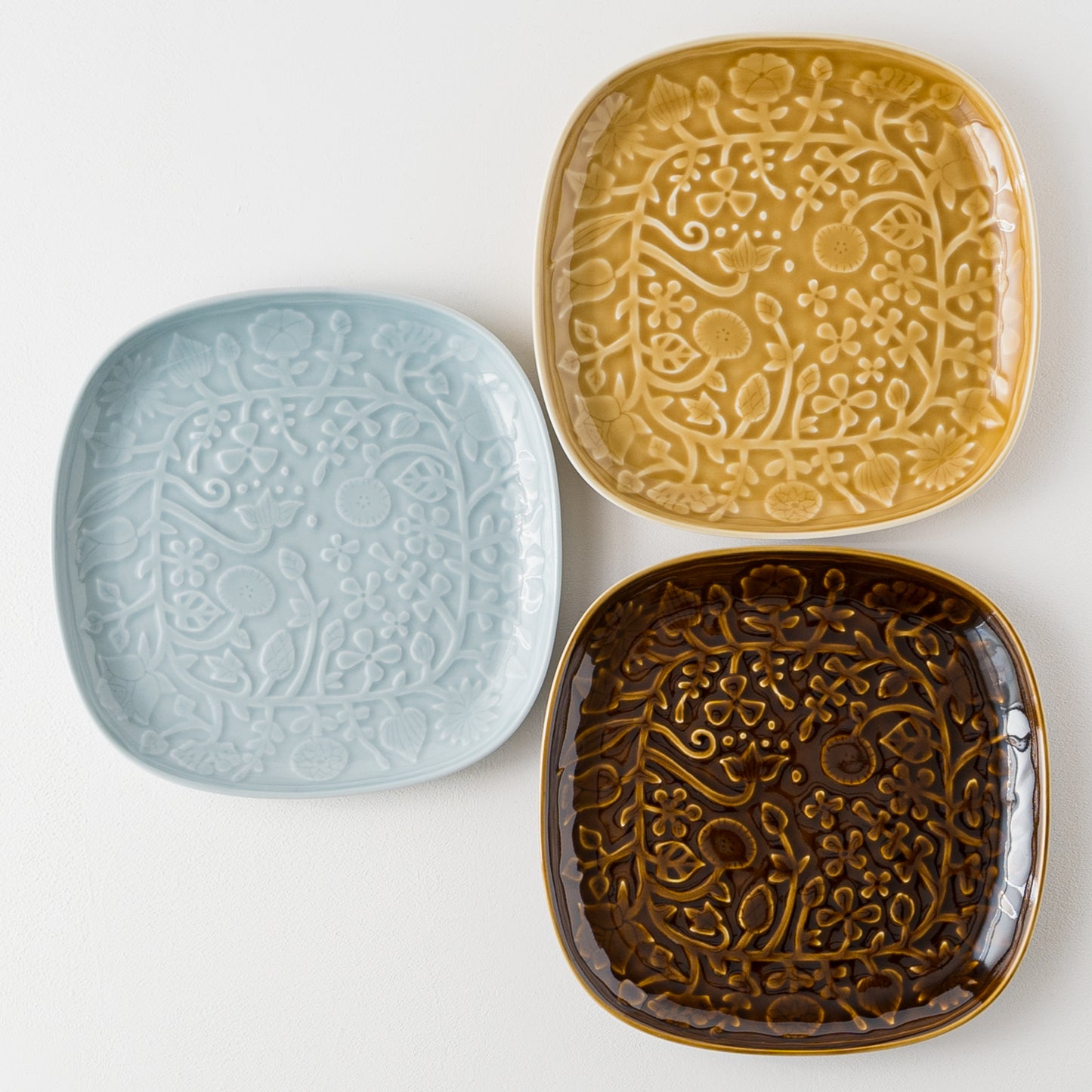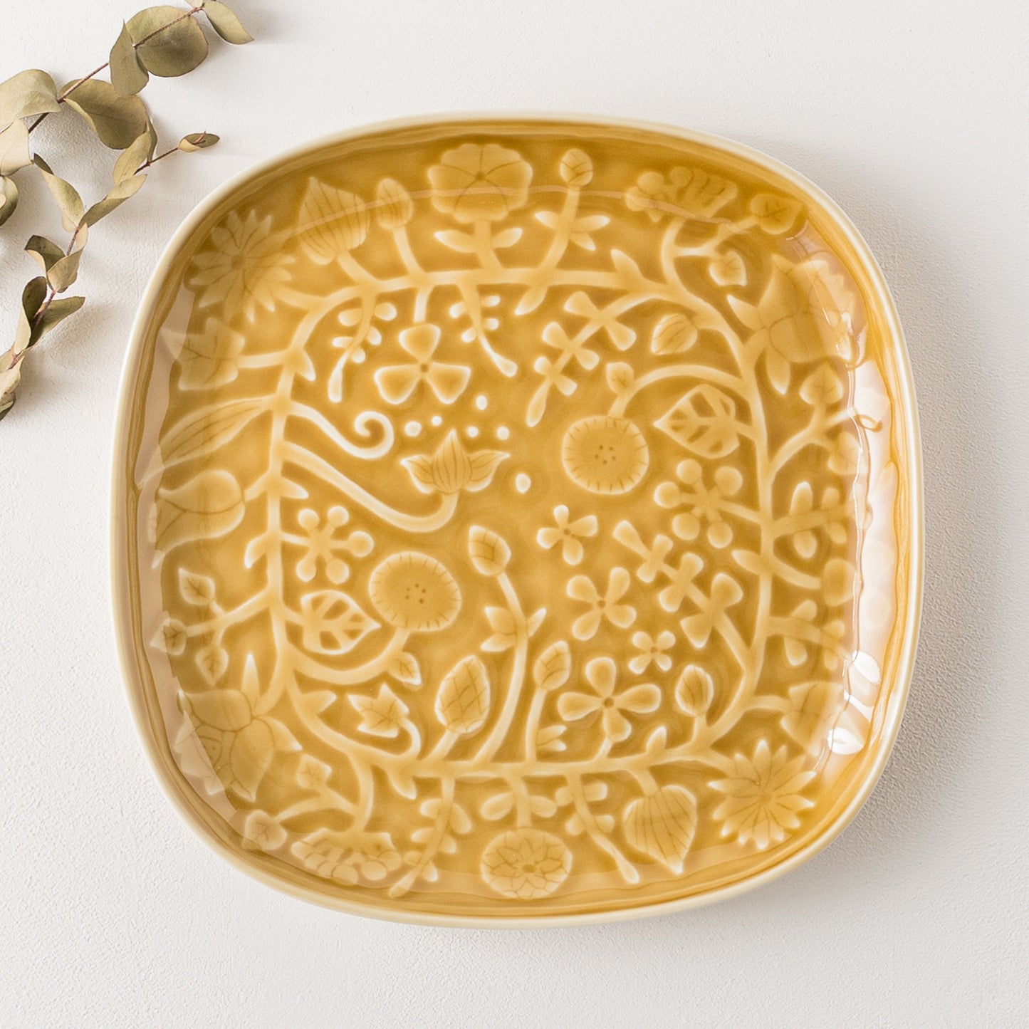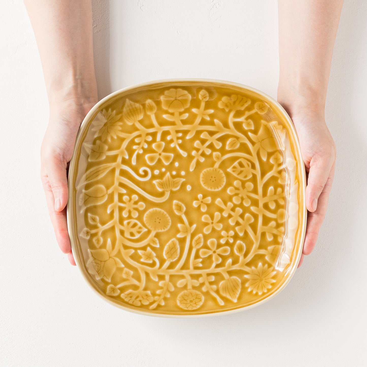 プレートの表面いっぱいにお花が施されているので盛り付けたお料理が素敵に引き立ちます。丸みを帯びた四角いフォルムにも温かみのある柔らかさを感じます。