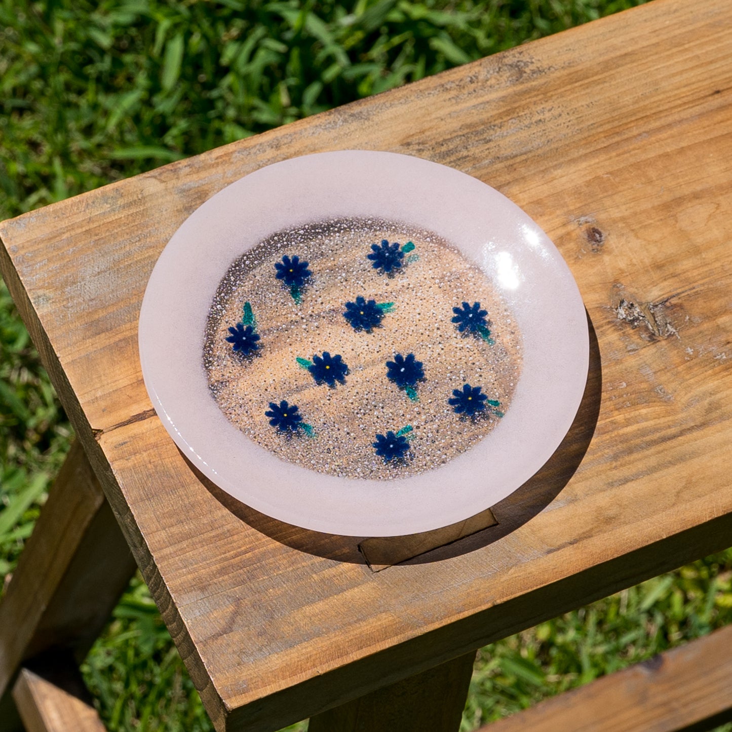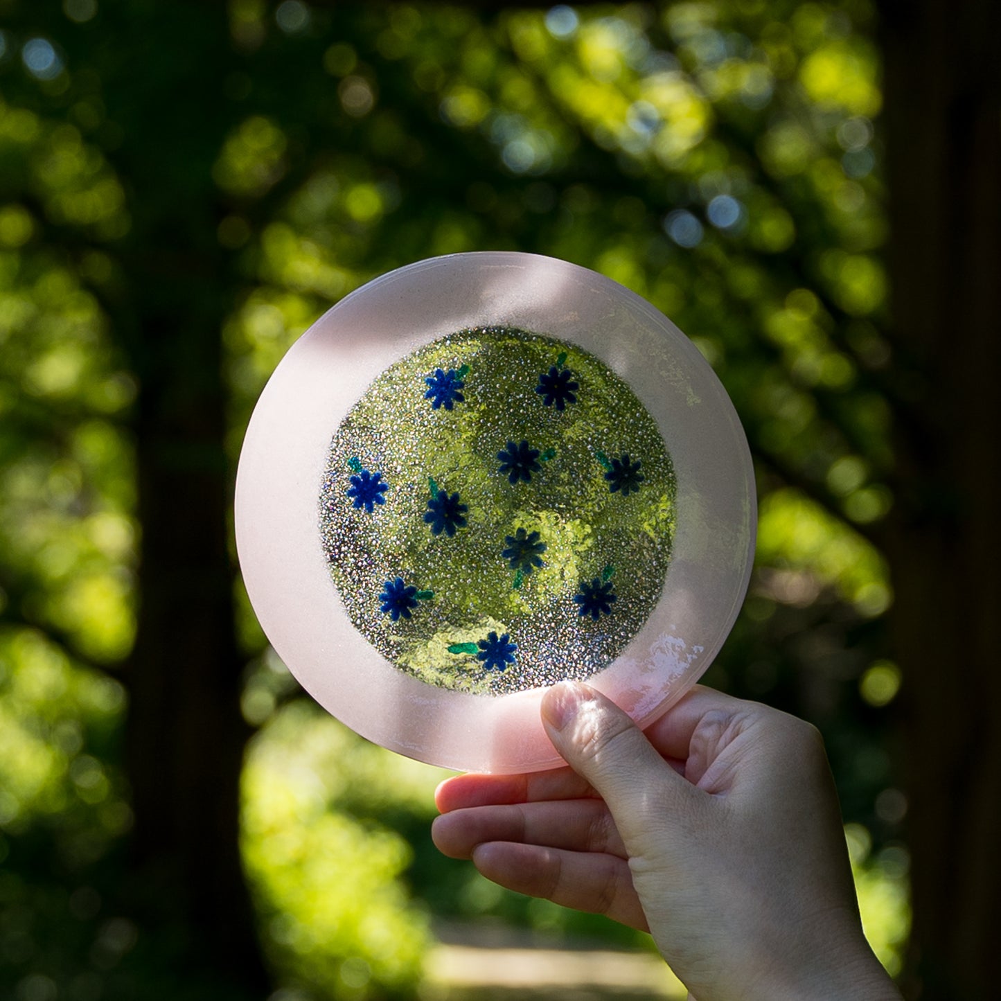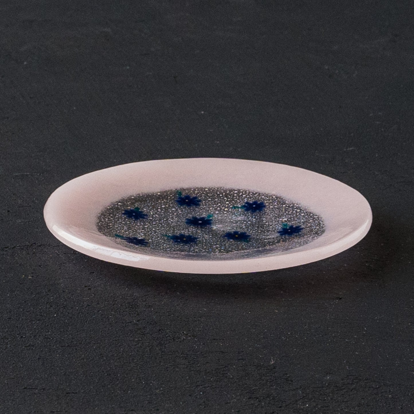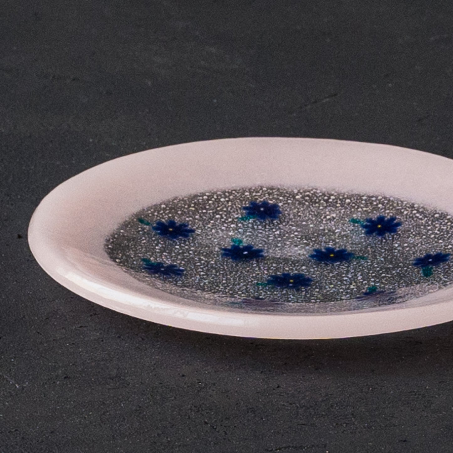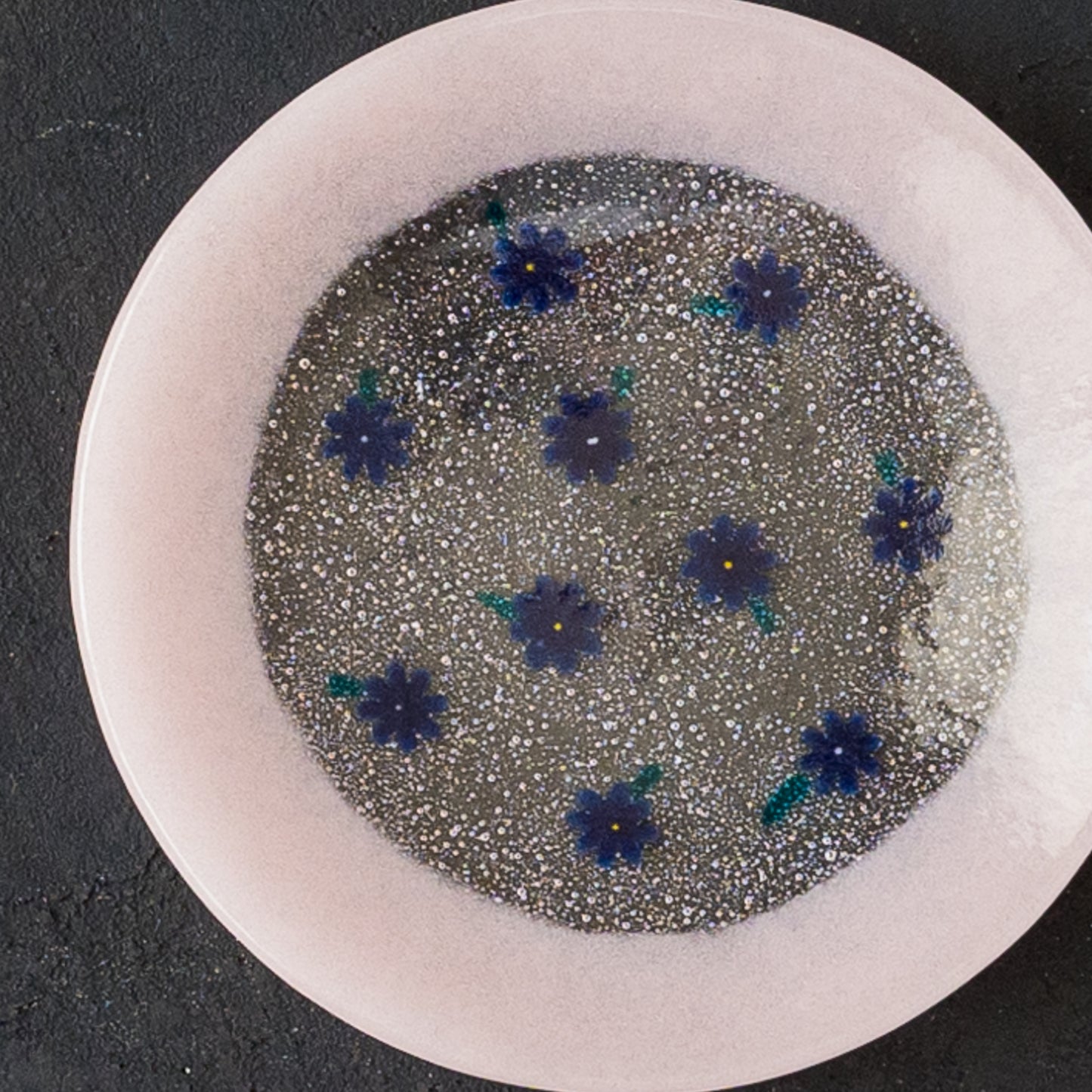 紫のお花が表面に散りばめられた愛らしい小皿。やさしく柔らかなパステルピンクが可愛さを増していて眺めているだけでほっこり癒されます。透明の粉を振りかけて焼成しているので、お花に粉雪が降り注いでいるようでなんとも素敵な佇まいです。