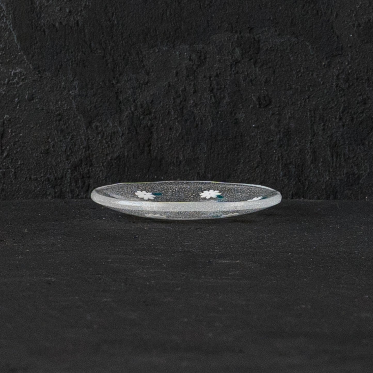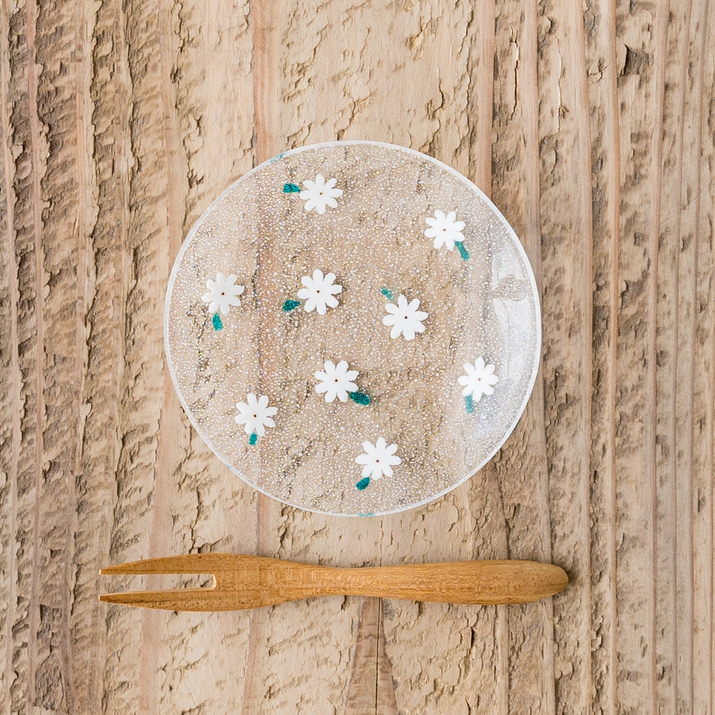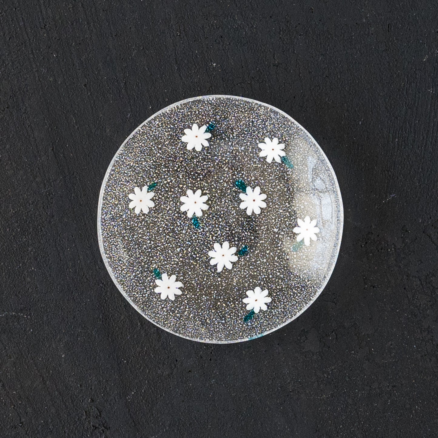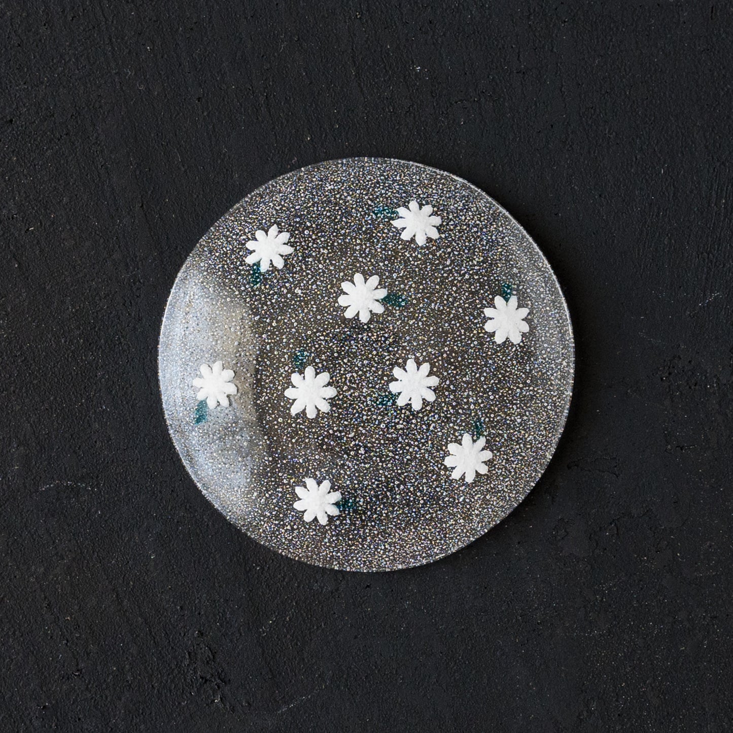 白いお花が表面に散りばめられた愛らしい豆皿。優し気な白いお花をスノーホワイト眺めているだけでほっこり癒されます。透明の粉を振りかけて焼成しているので、お花に粉雪が降り注いでいるようでなんとも素敵な佇まいです。