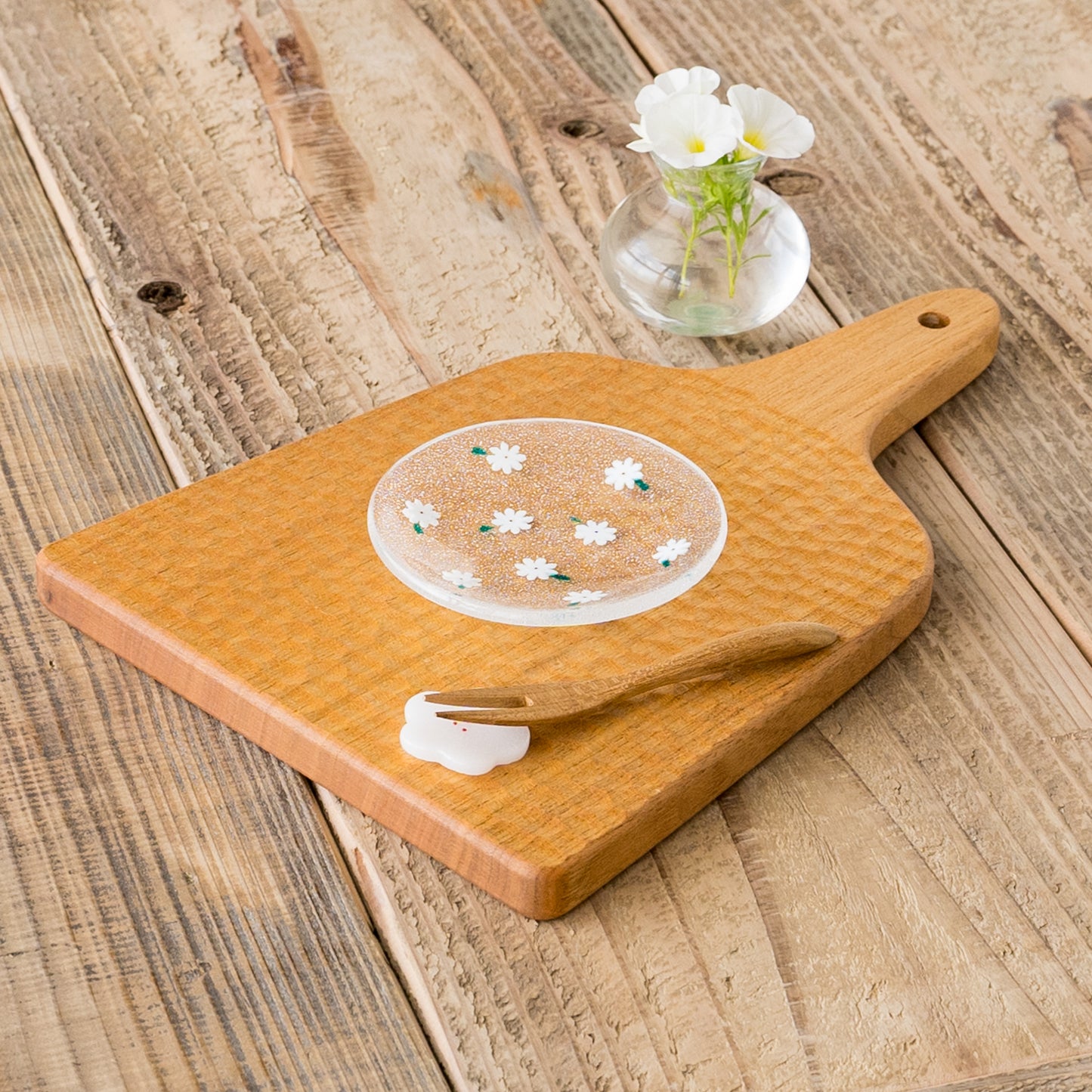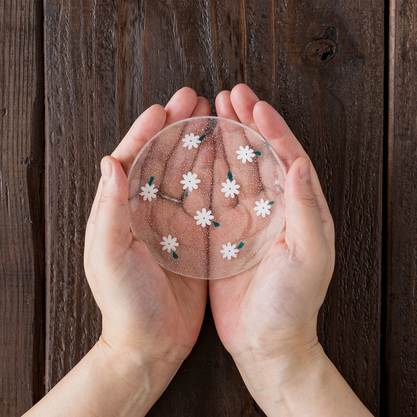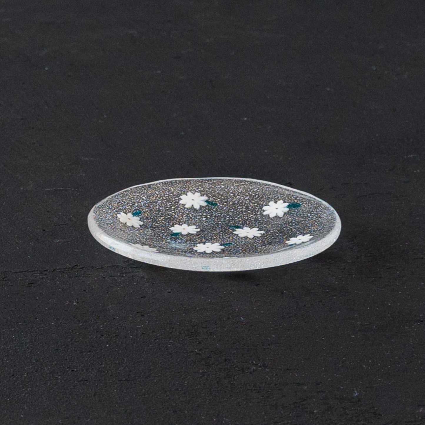 白いお花が表面に散りばめられた愛らしい豆皿。優し気な白いお花をスノーホワイト眺めているだけでほっこり癒されます。透明の粉を振りかけて焼成しているので、お花に粉雪が降り注いでいるようでなんとも素敵な佇まいです。