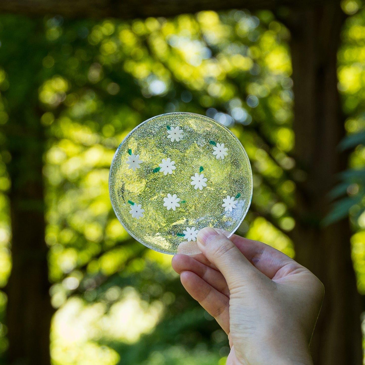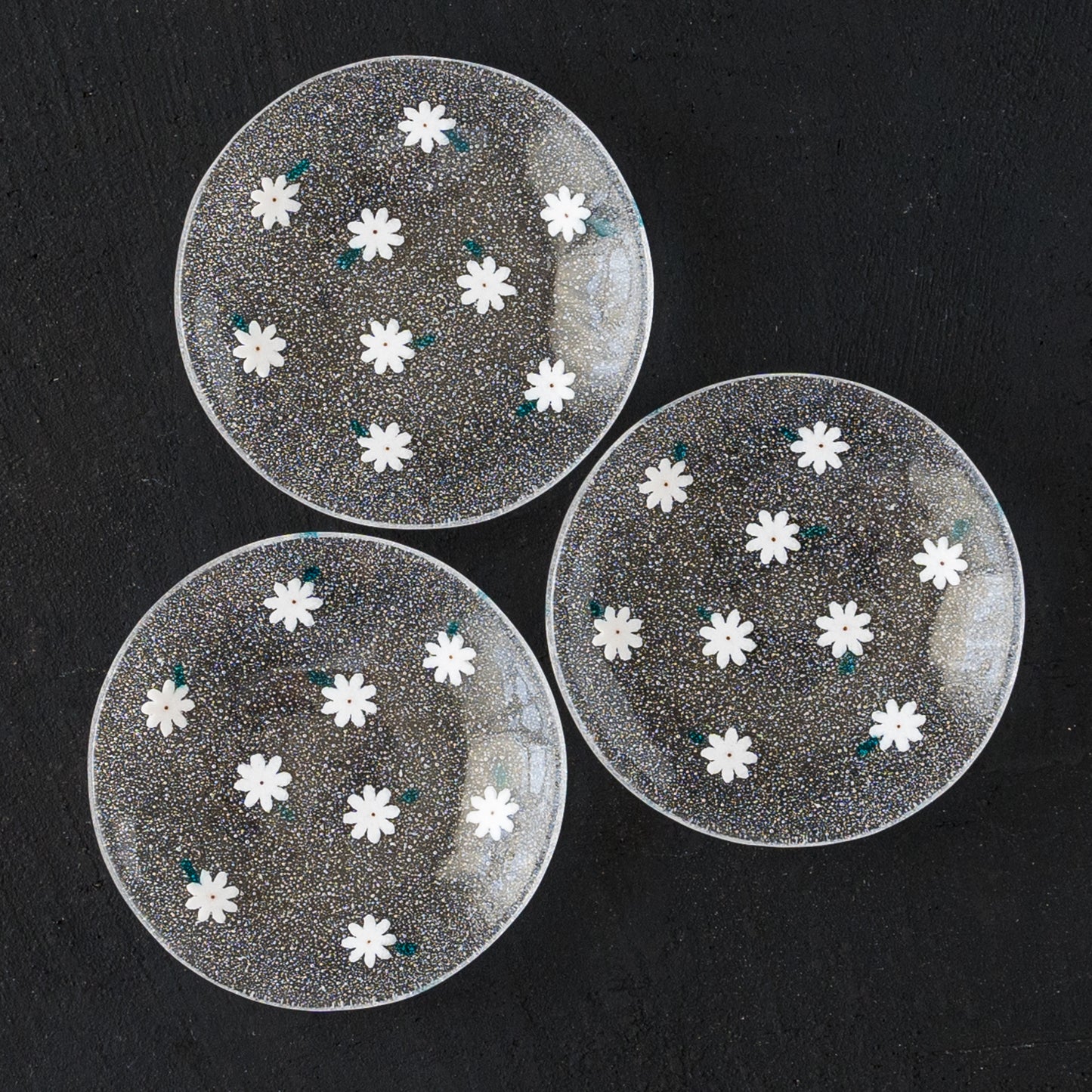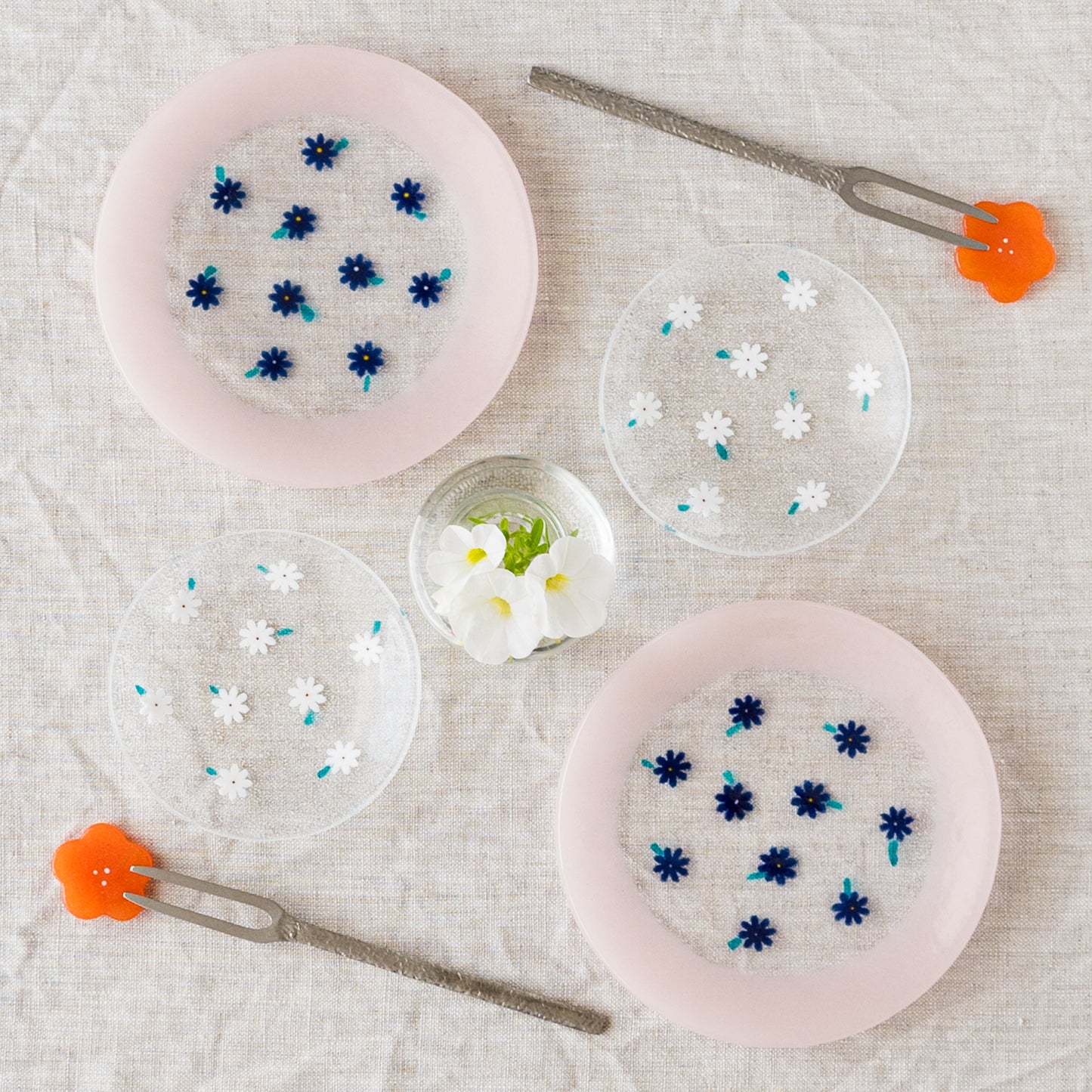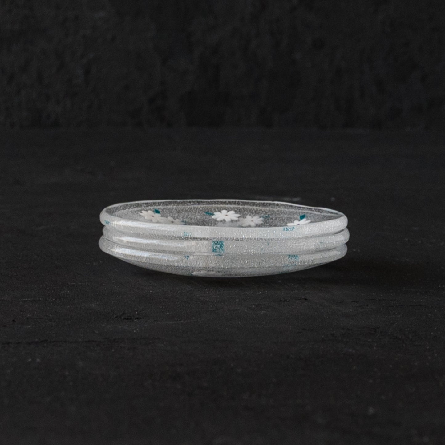 白いお花が表面に散りばめられた愛らしい豆皿。優し気な白いお花をスノーホワイト眺めているだけでほっこり癒されます。透明の粉を振りかけて焼成しているので、お花に粉雪が降り注いでいるようでなんとも素敵な佇まいです。