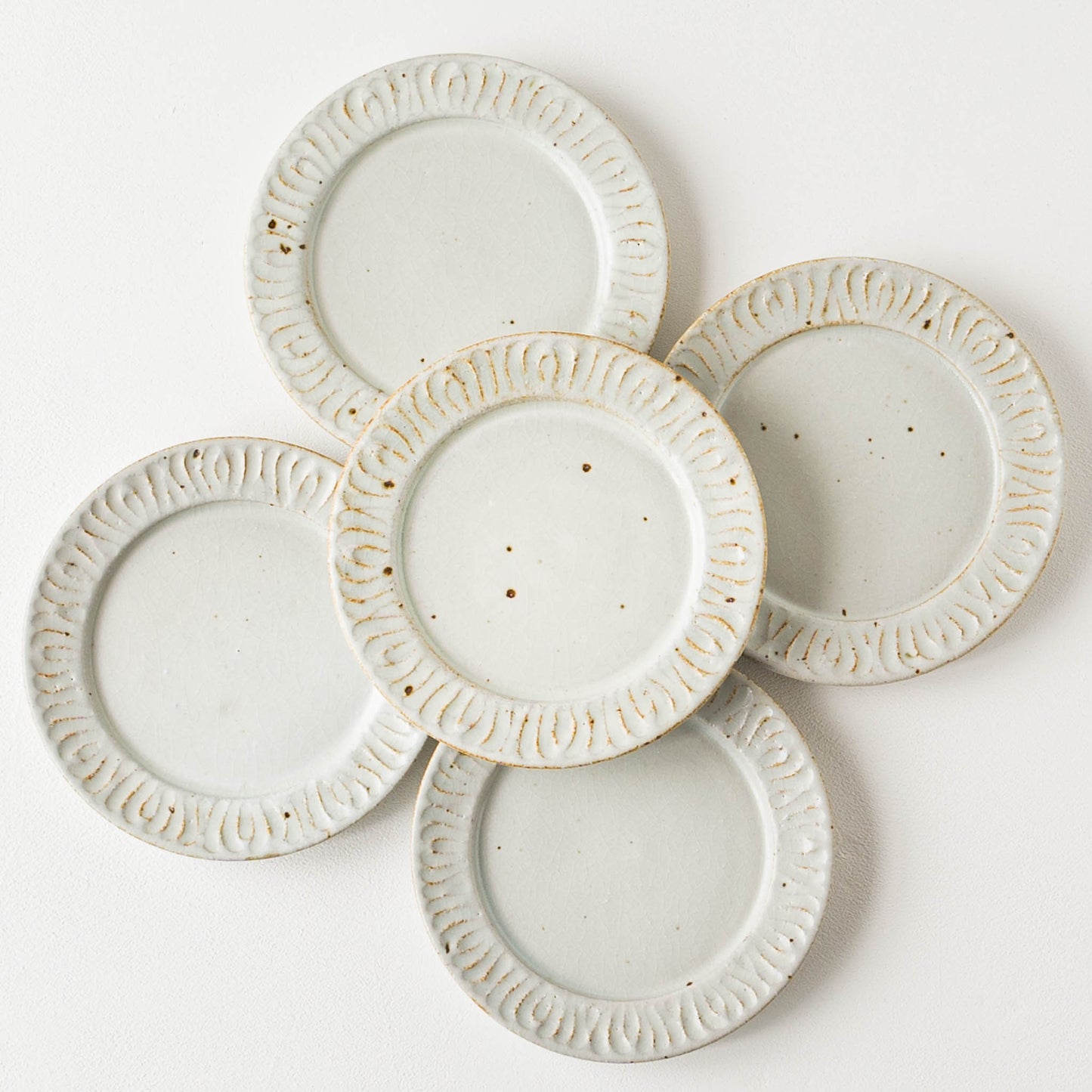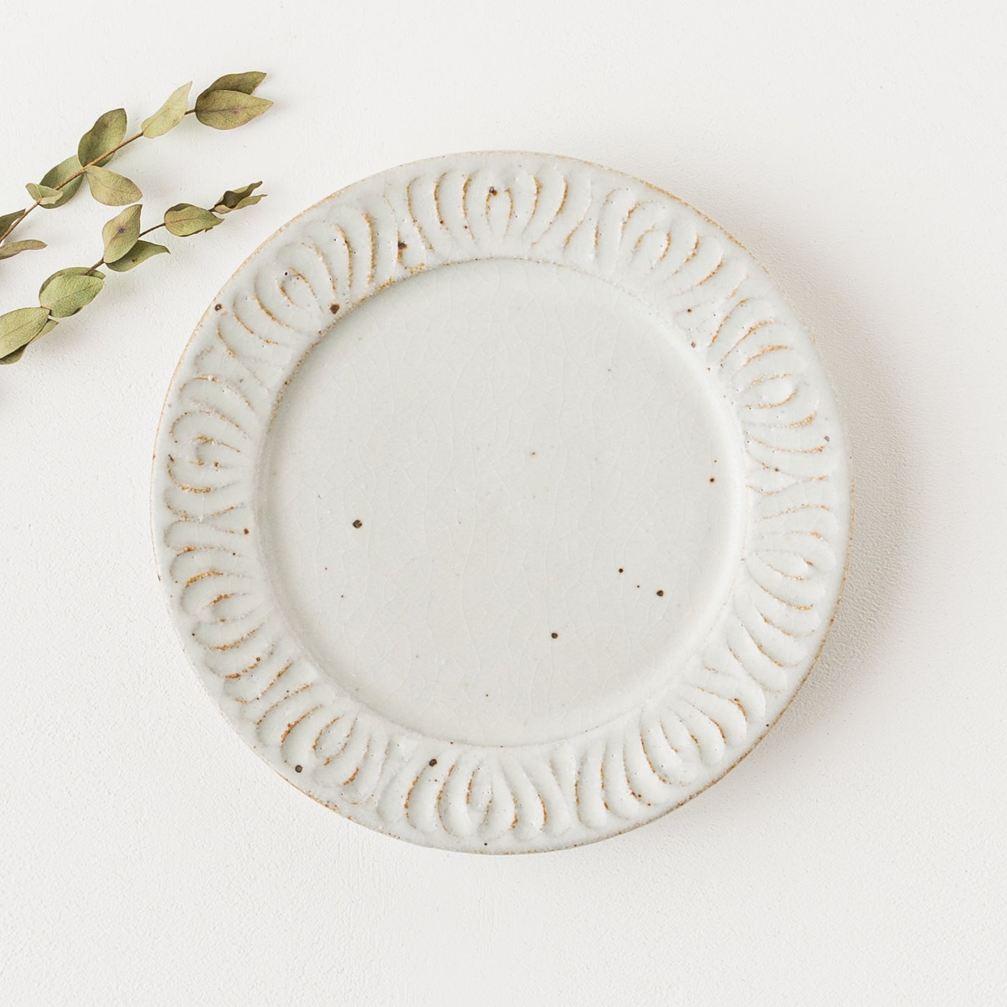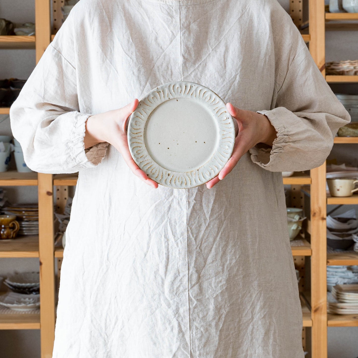 落ち着きのある花紋にあたたかみのある粉引きの白なのでのせたものを素敵に彩ってくれます。和菓子やカップケーキ、焼菓子などにぴったりのサイズ。取り皿としてやお惣菜やお新香を盛り付けるのも食卓を素敵に彩ってくれます。