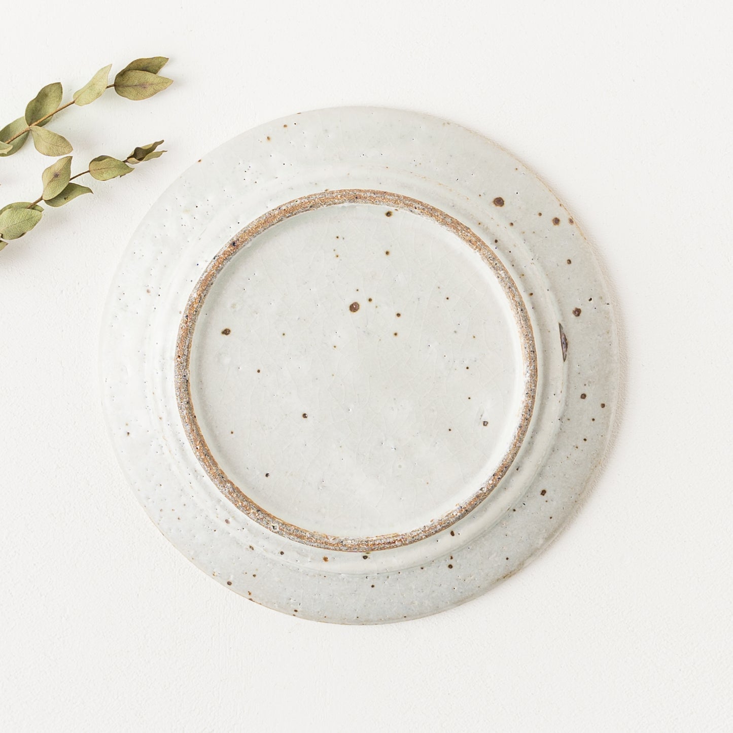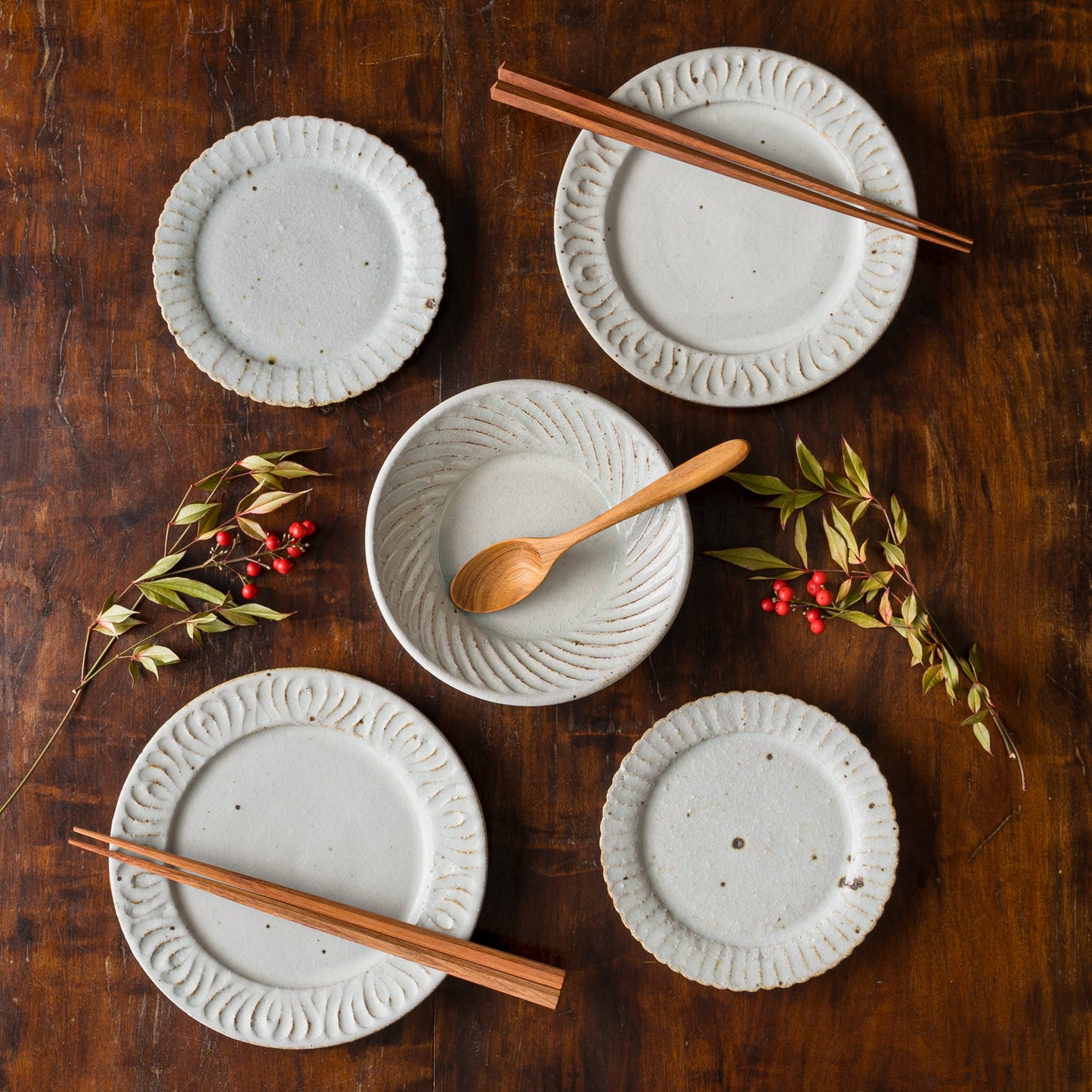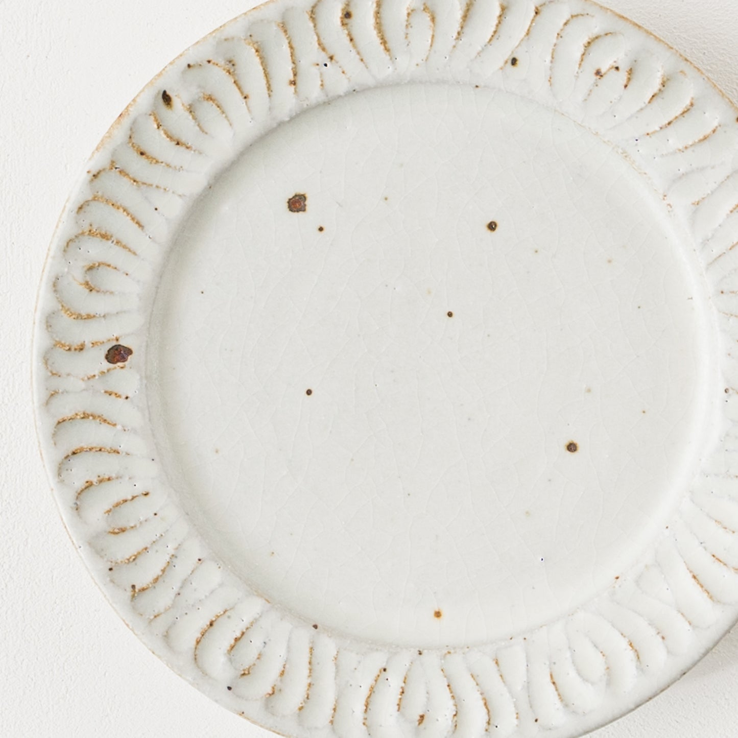 白化粧土をかけてから透明釉をかけて焼成する粉引き。素朴で温かみのある風合いが魅力です。鎬が施された箇所などの釉だまりの濃淡も素敵に映ります。焼成時に土の鉄分が反応して表れる黒や茶や白の鉄粉。粗めの土を使っているので味わい深い風合いに仕上がります。粉引きの白が心地よく調和していてとても素敵です。