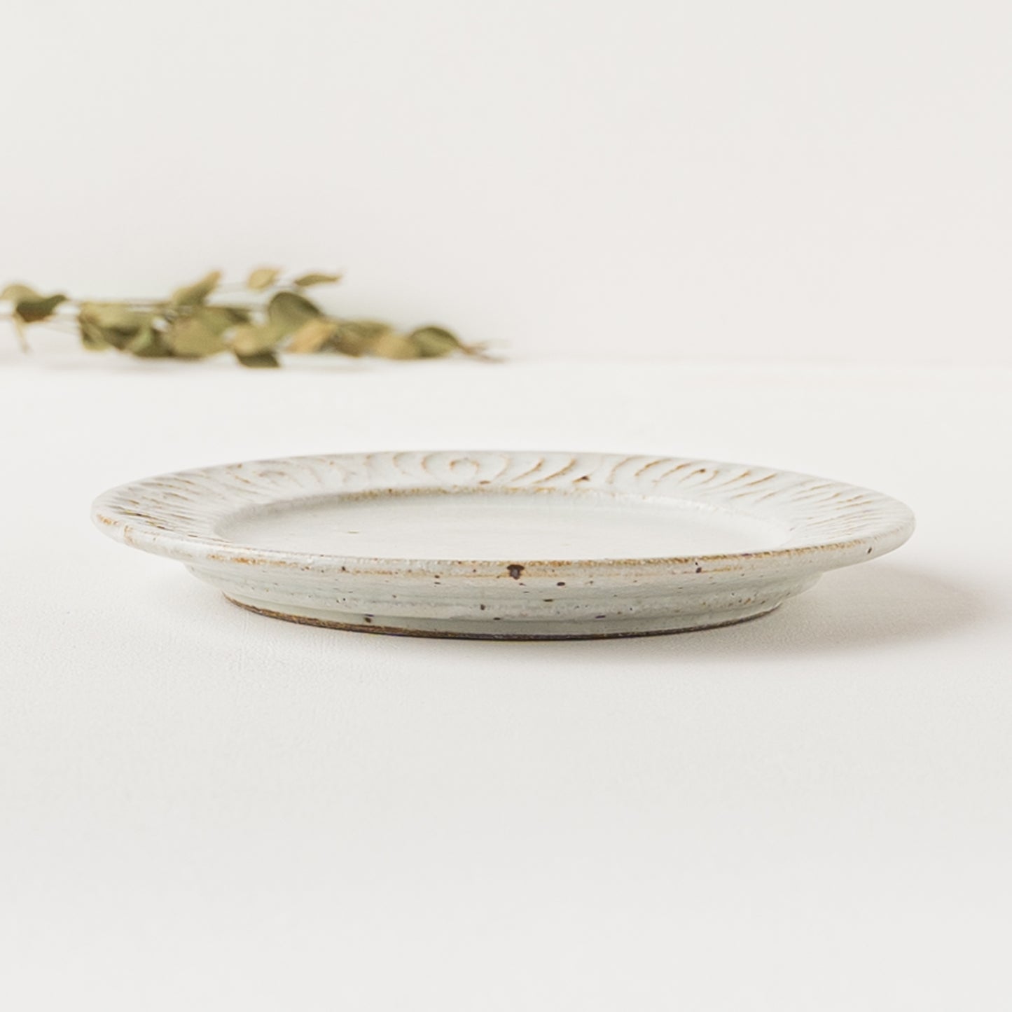 花紋が彫られた箇所は少しざらつきがあり、表面もいくぶんでこぼこしています。黒点(鉄粉)やピンホール、重み、厚みなど陶器ならではの味わい、楽しみがぎゅっと詰まっていて、うつわは脇役でもあり主役でもあると感じさせてくれます。
