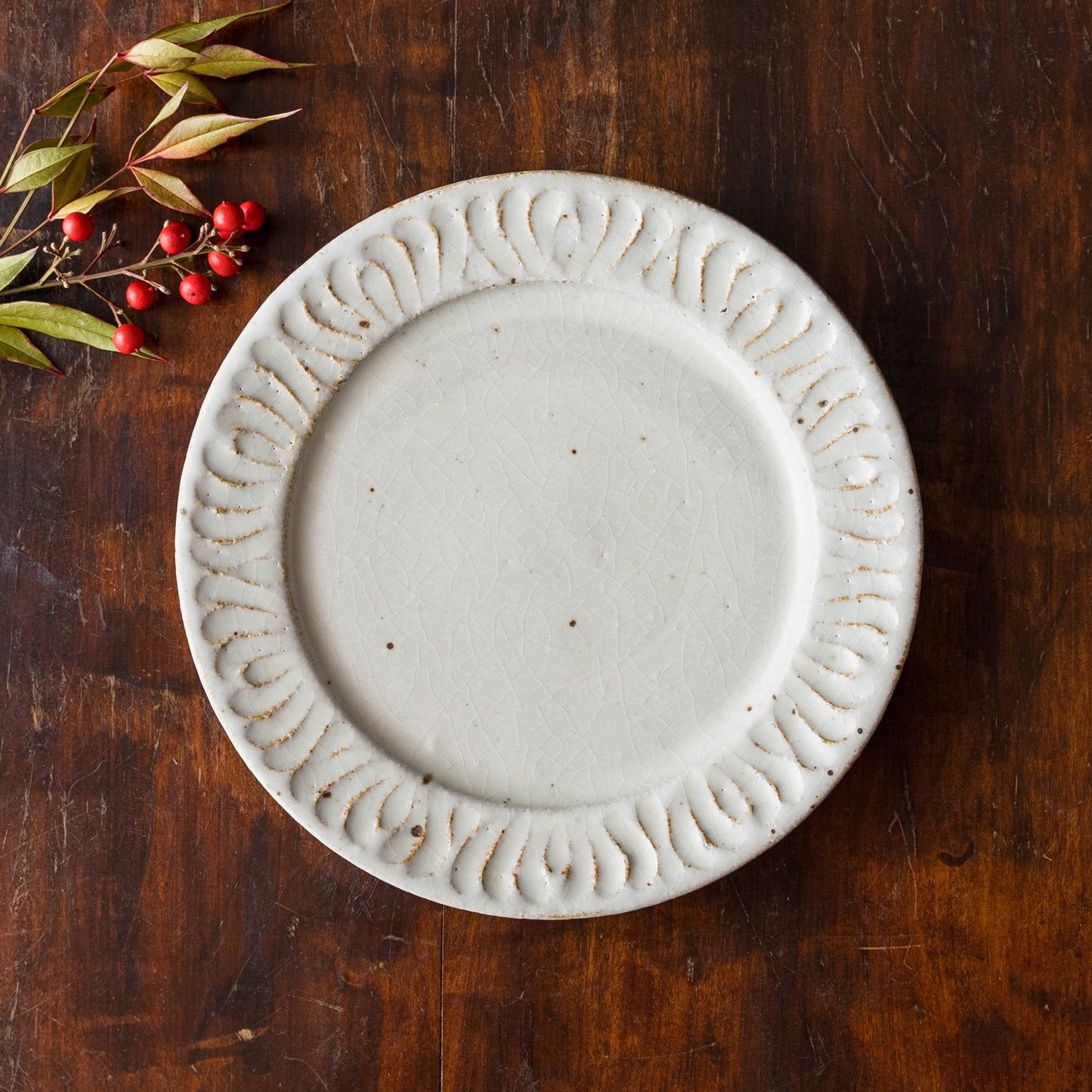 リムに施されたお花模様の花紋に目を奪われてしまいます。うつわそのものの見映えもさることながら、お料理を盛り付けると花紋が一層際立ち、お料理の美しさや美味しさを浮かび上がらせているようでほんとに不思議な佇まいです。