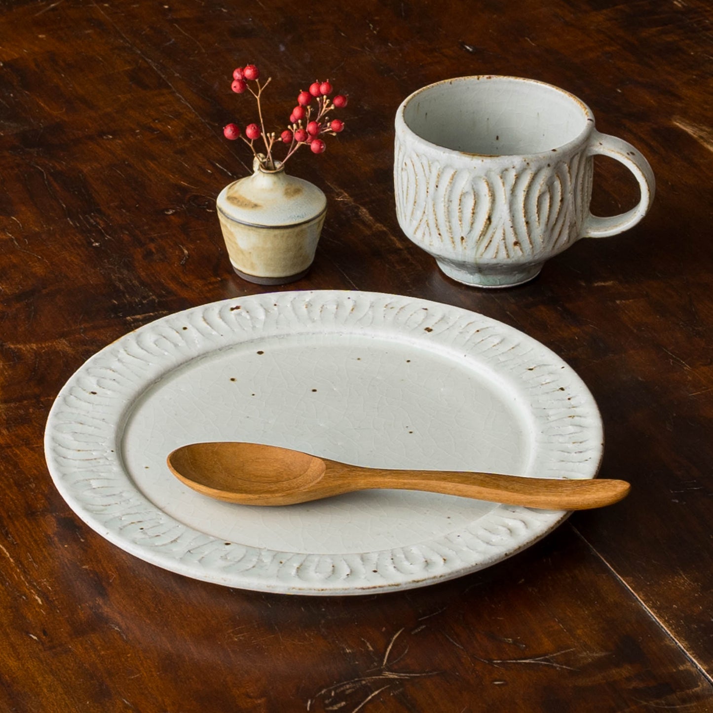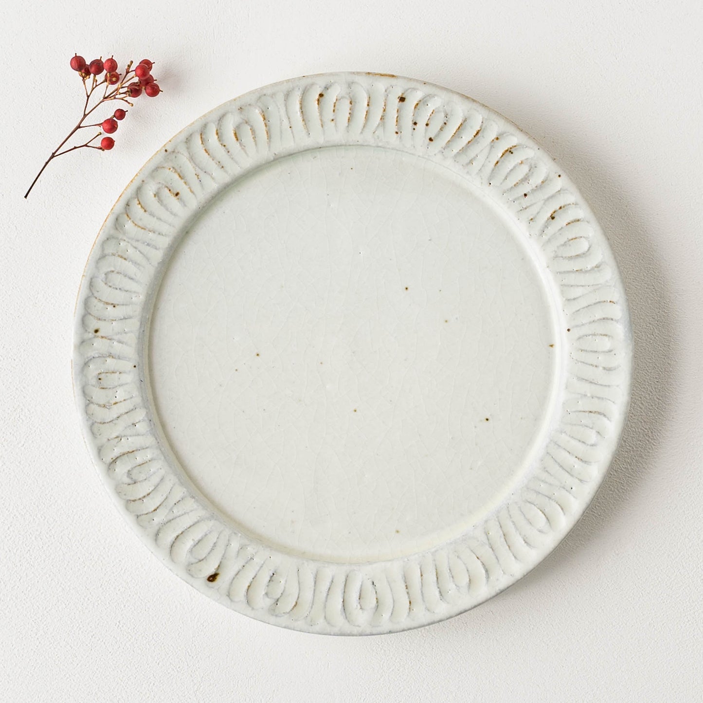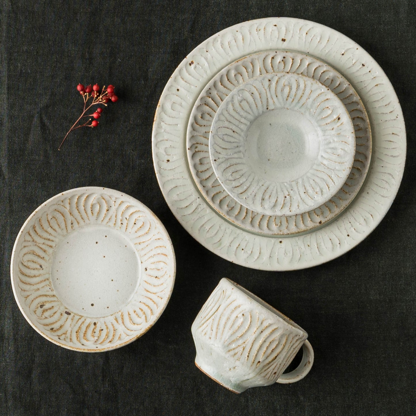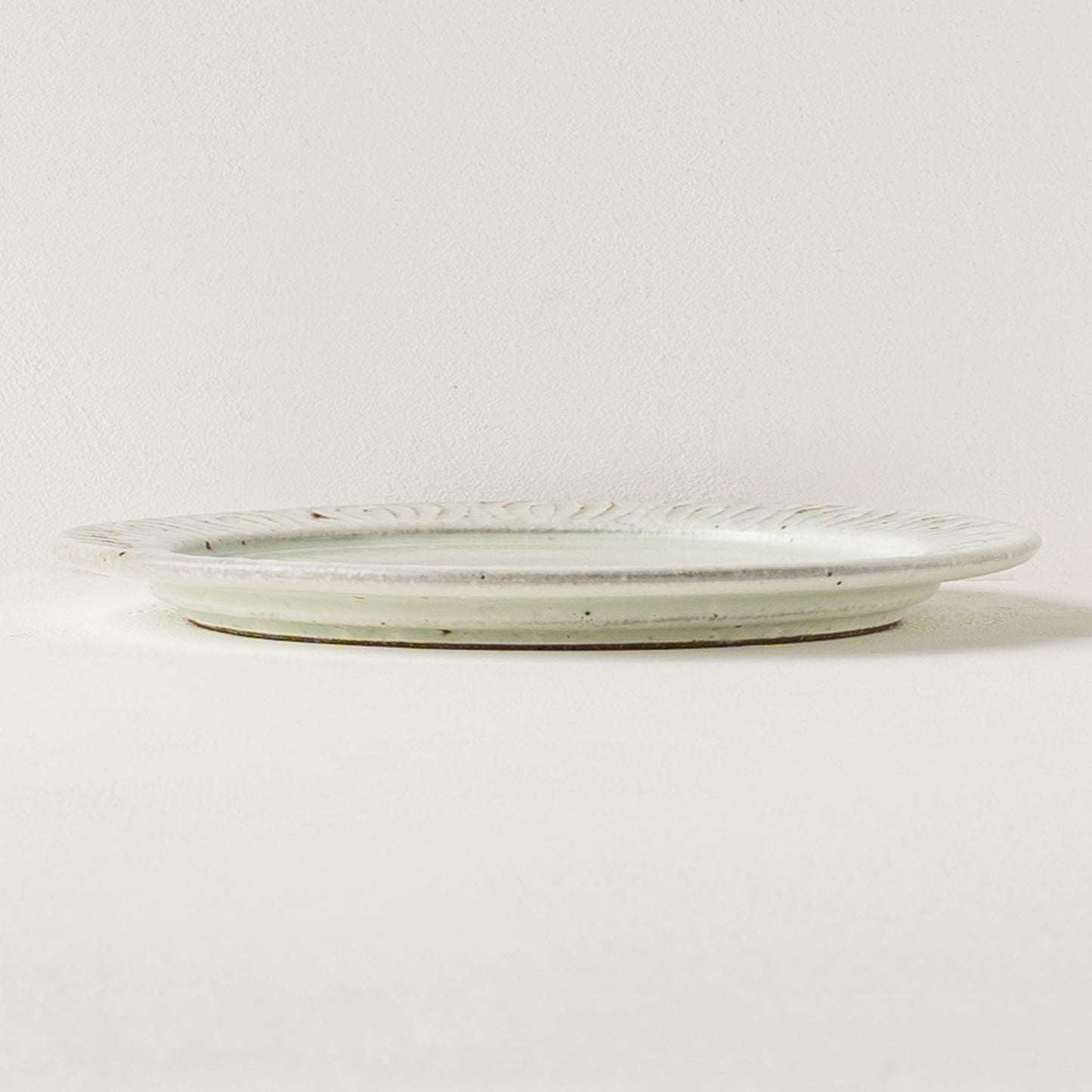 花紋が彫られた箇所は少しざらつきがあり、表面もいくぶんでこぼこしています。黒点(鉄粉)やピンホール、重み、厚みなど陶器ならではの味わい、楽しみがぎゅっと詰まっていて、うつわは脇役でもあり主役でもあると感じさせてくれます。