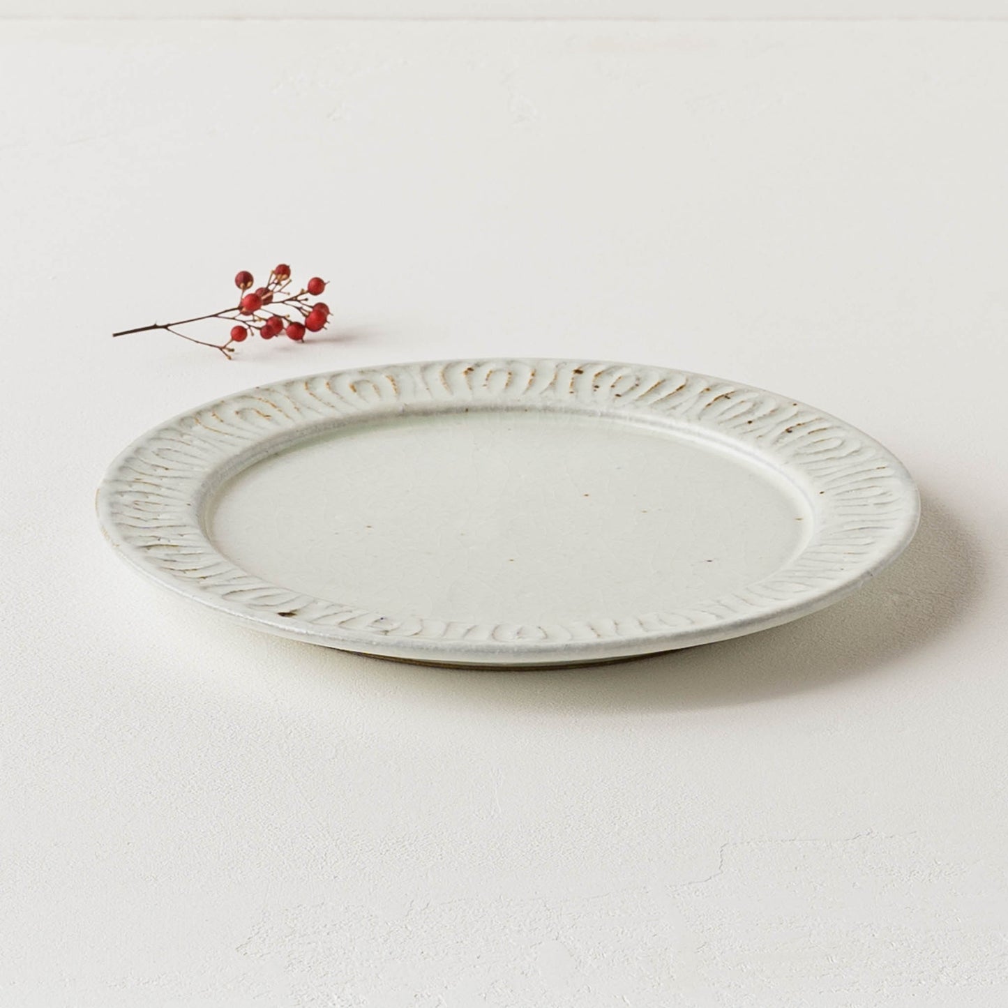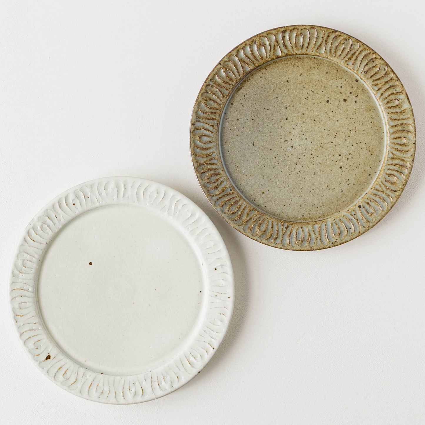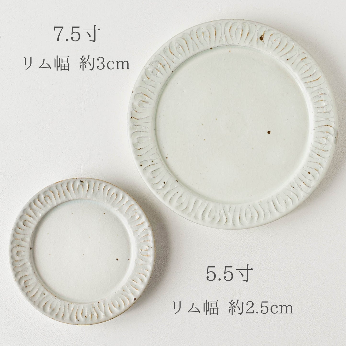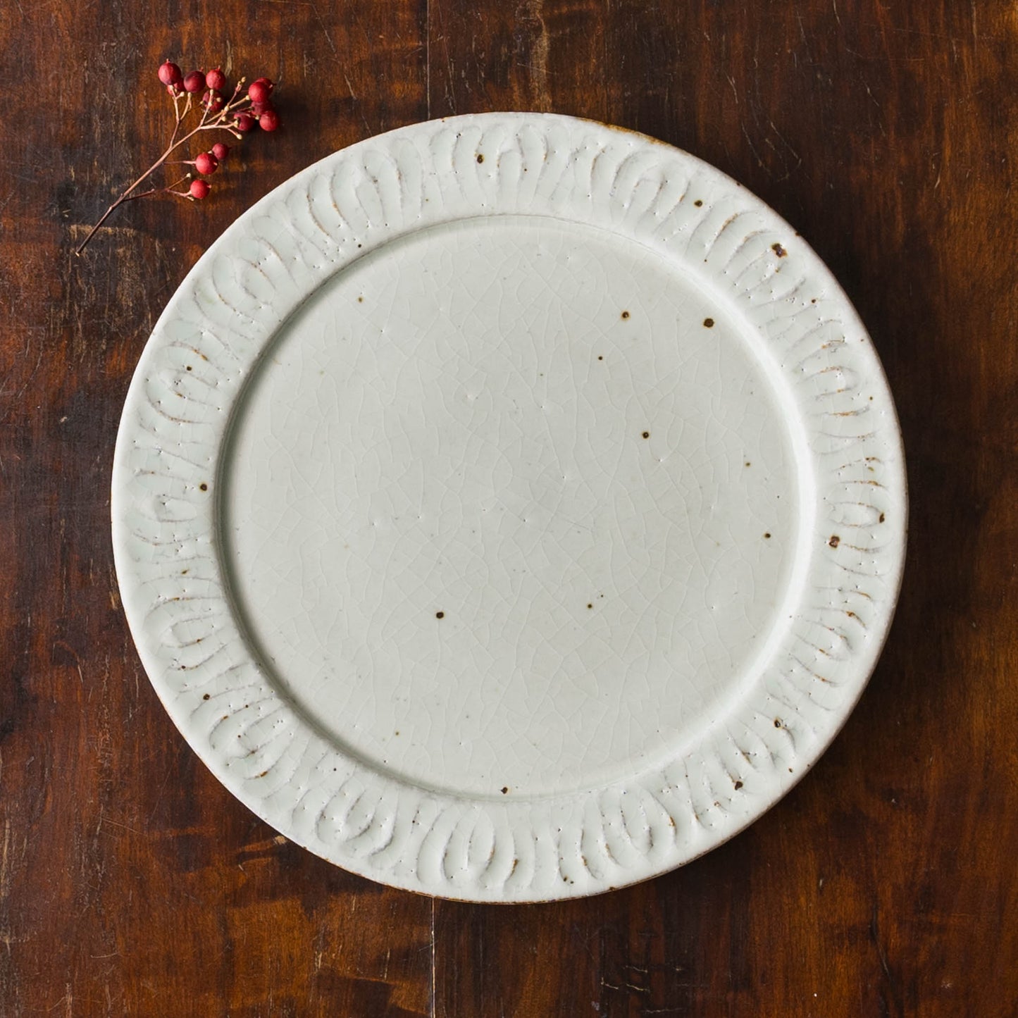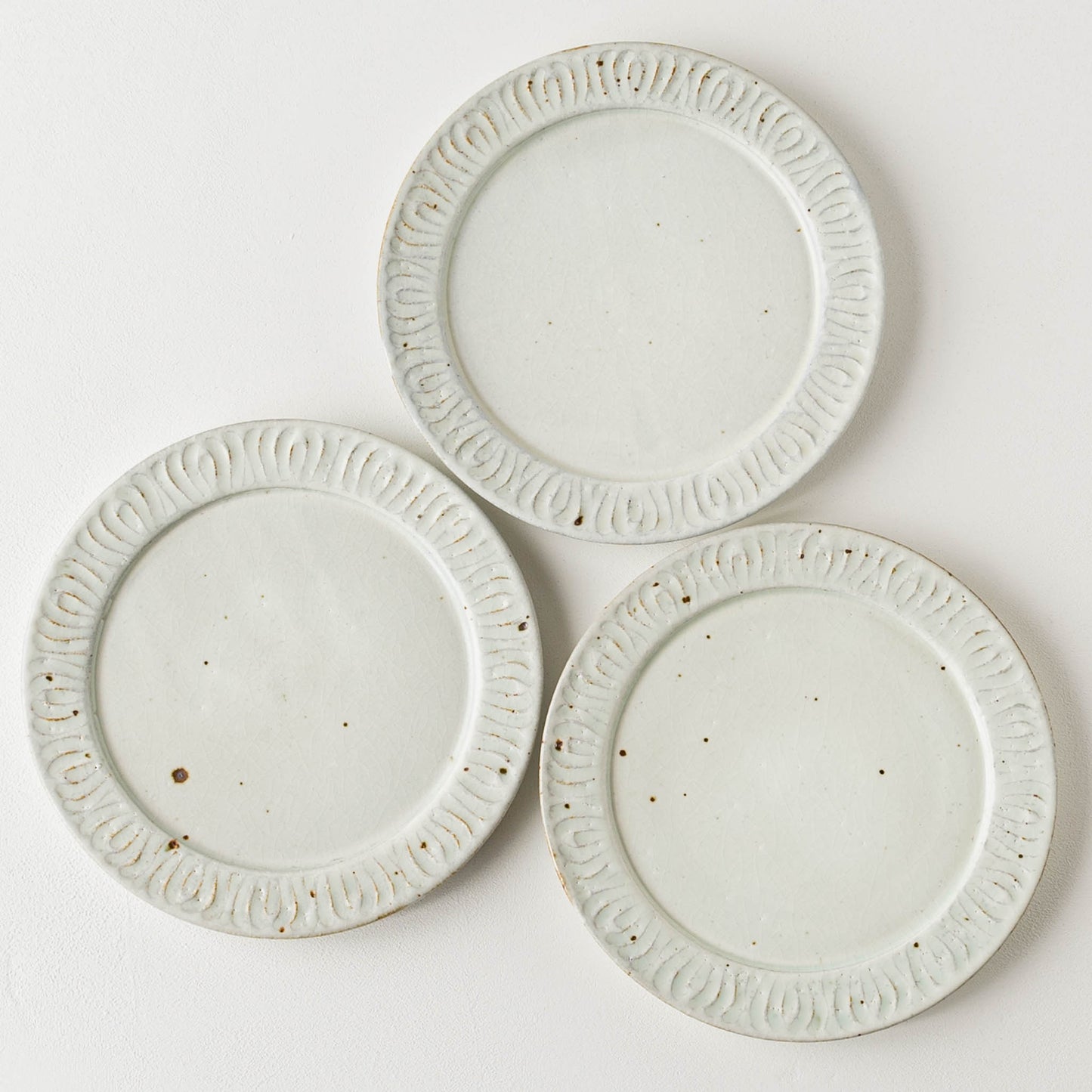 花紋が彫られた箇所は少しざらつきがあり、表面もいくぶんでこぼこしています。黒点(鉄粉)やピンホール、重み、厚みなど陶器ならではの味わい、楽しみがぎゅっと詰まっていて、うつわは脇役でもあり主役でもあると感じさせてくれます。