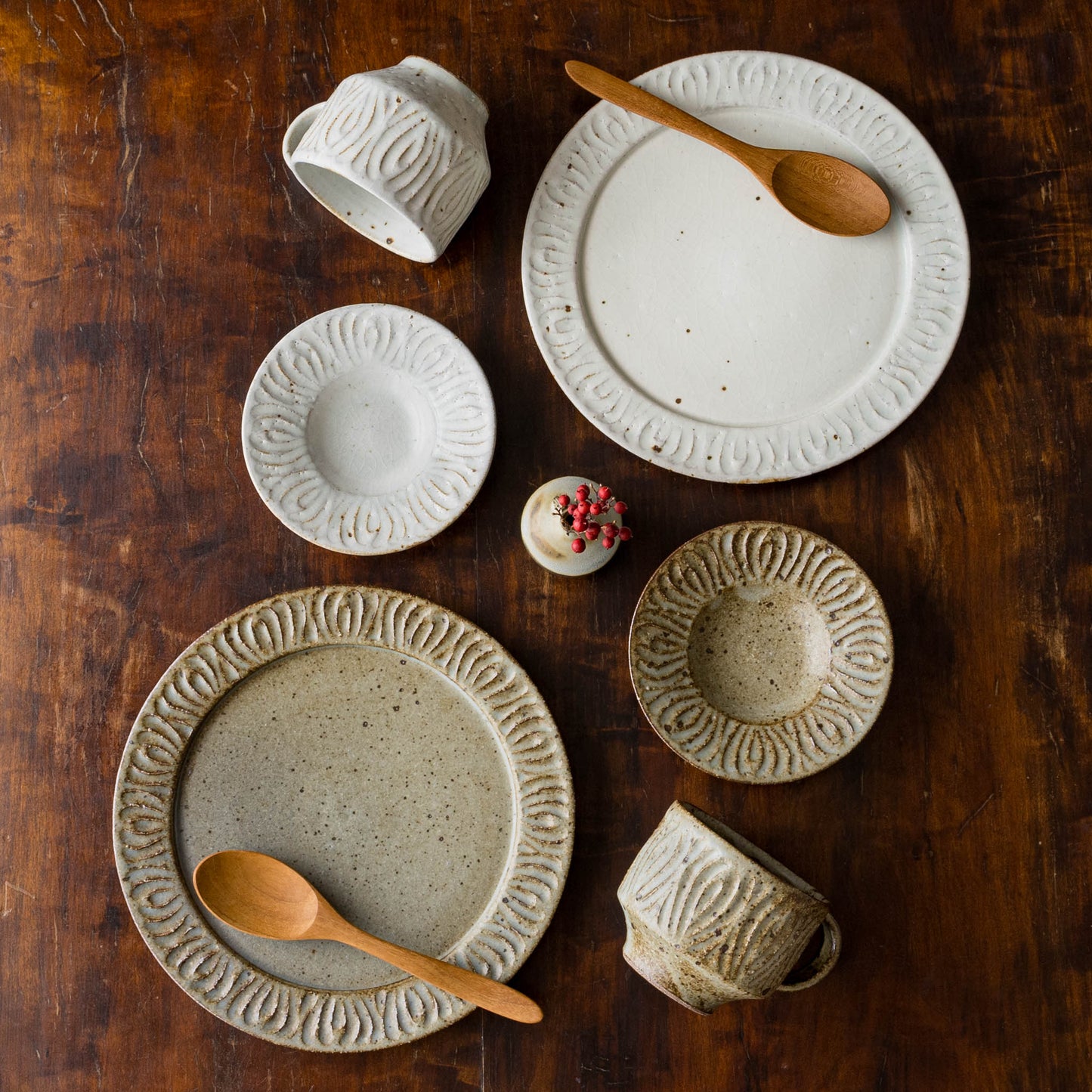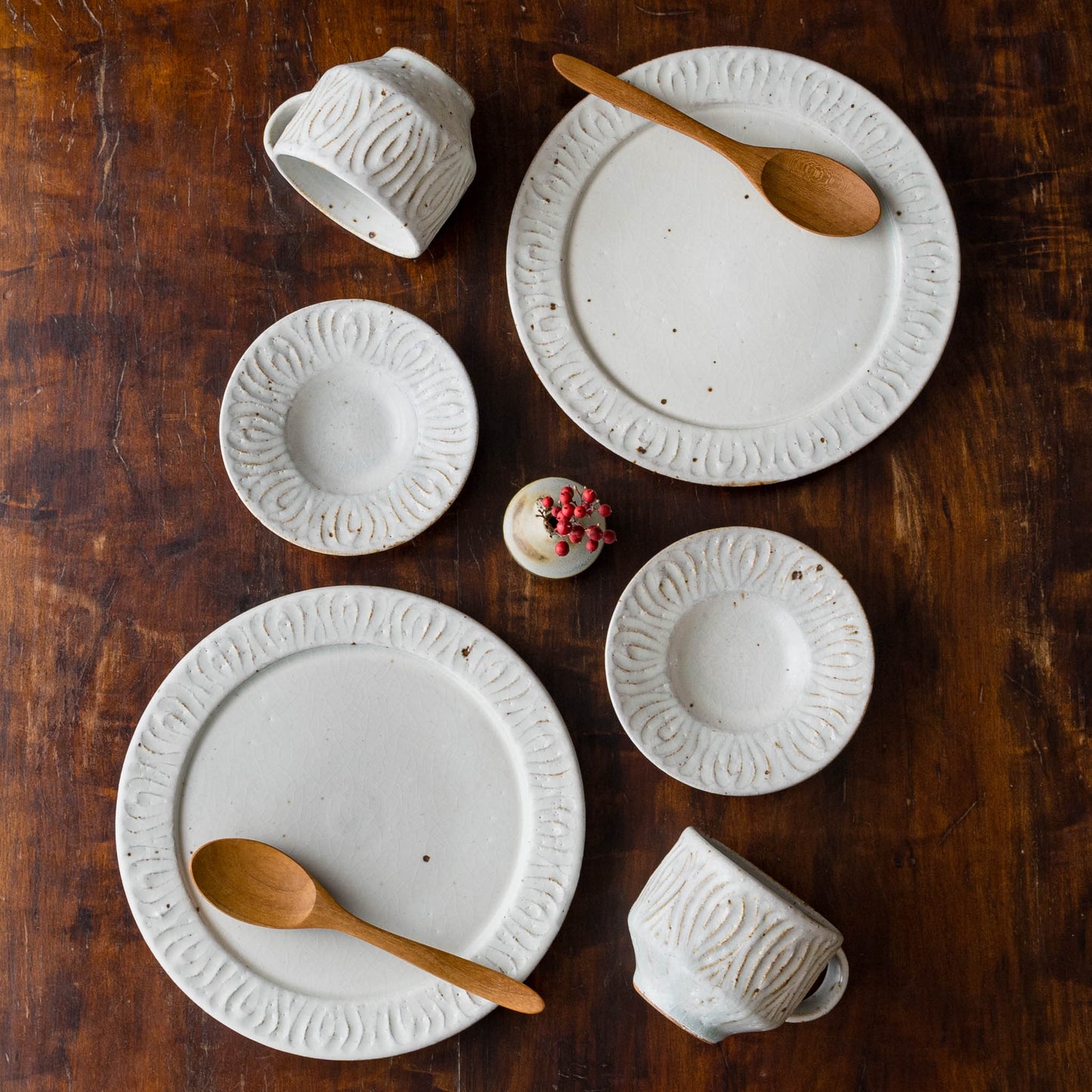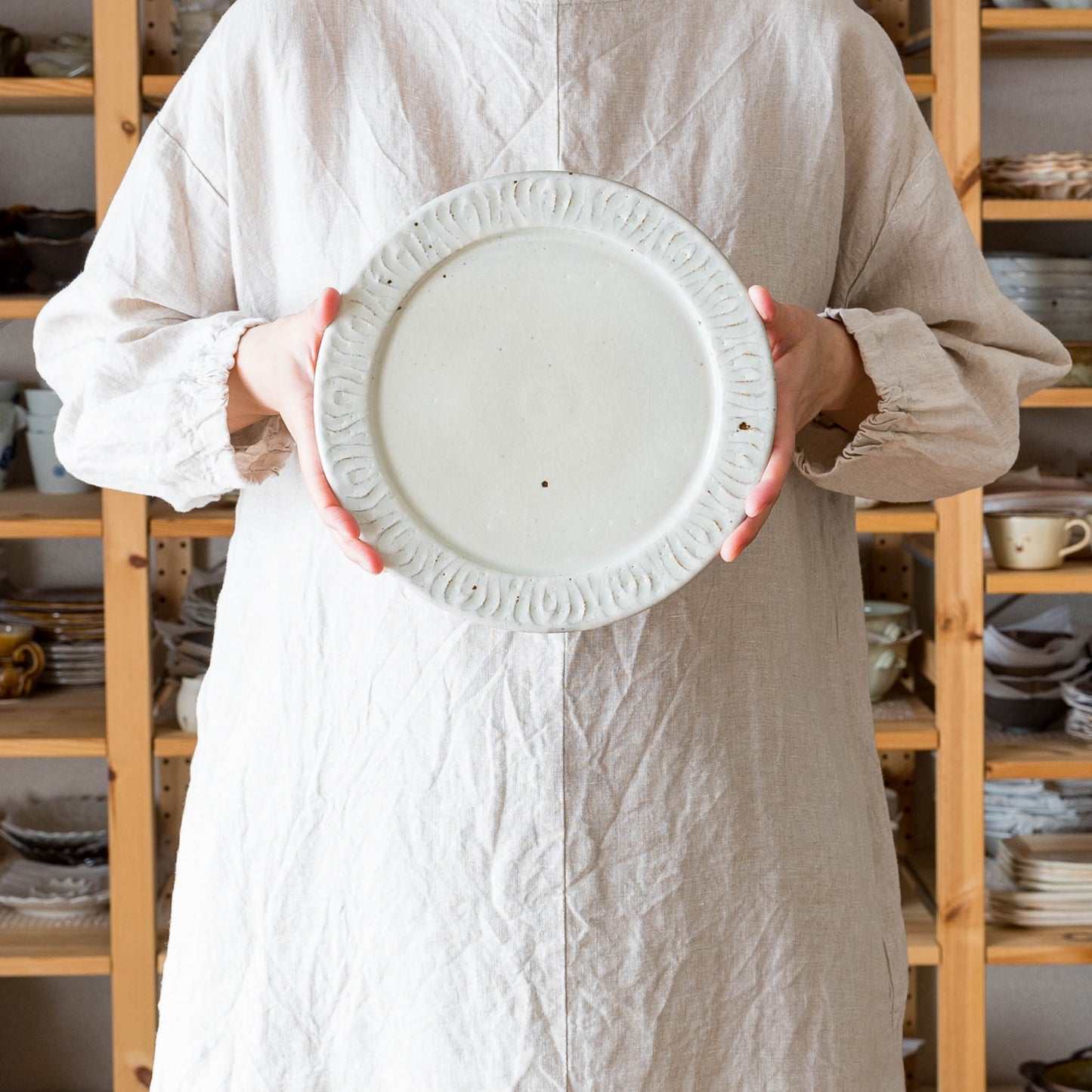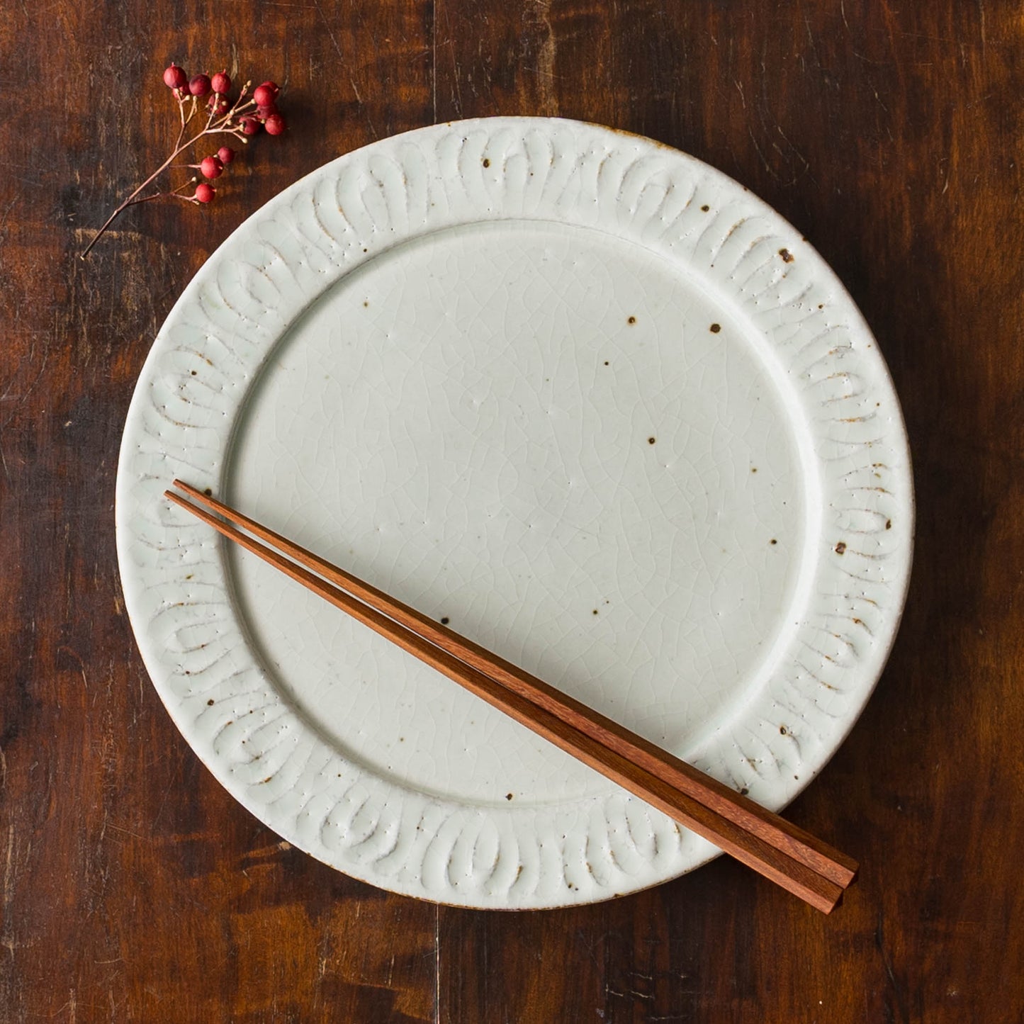花紋が彫られた箇所は少しざらつきがあり、表面もいくぶんでこぼこしています。黒点(鉄粉)やピンホール、重み、厚みなど陶器ならではの味わい、楽しみがぎゅっと詰まっていて、うつわは脇役でもあり主役でもあると感じさせてくれます。
