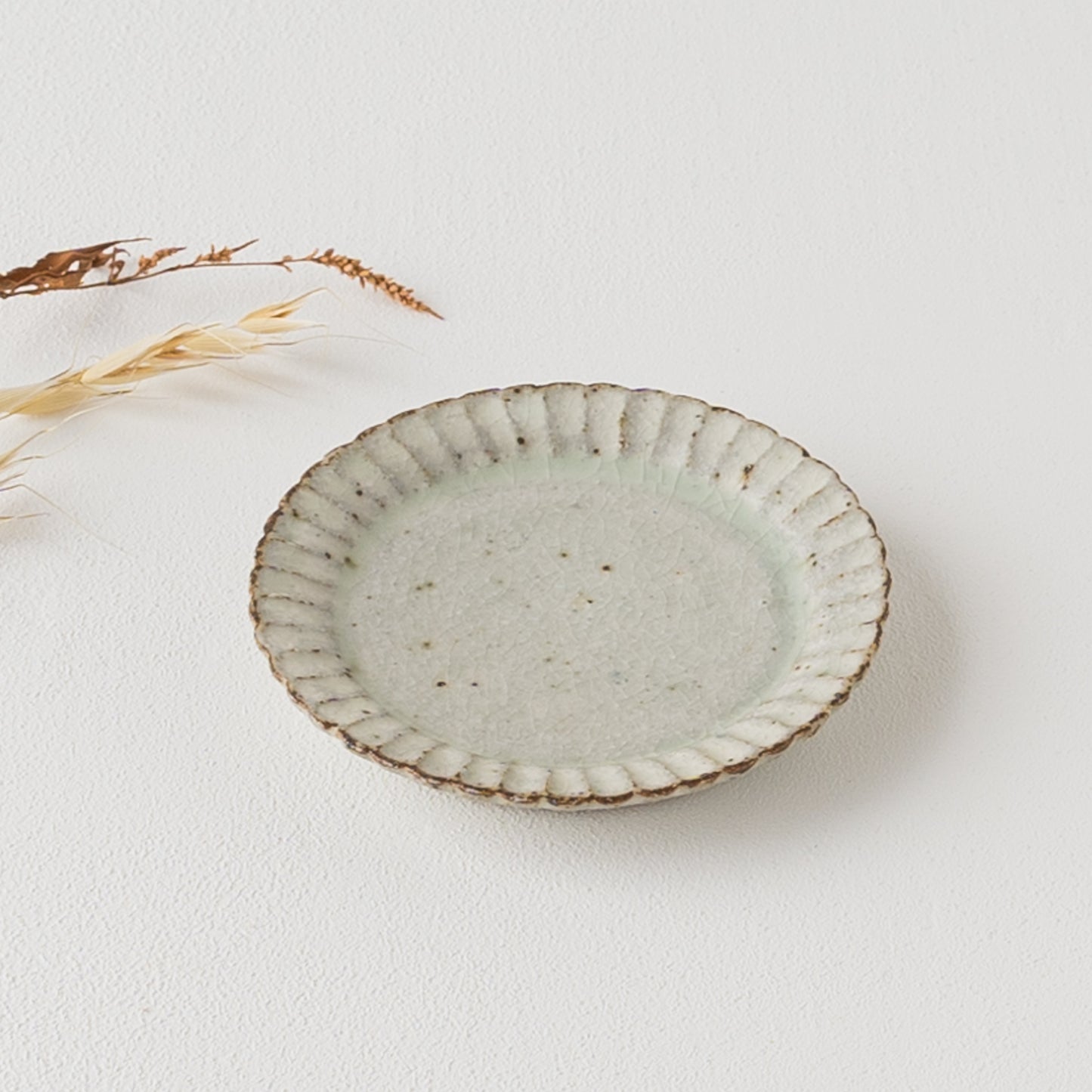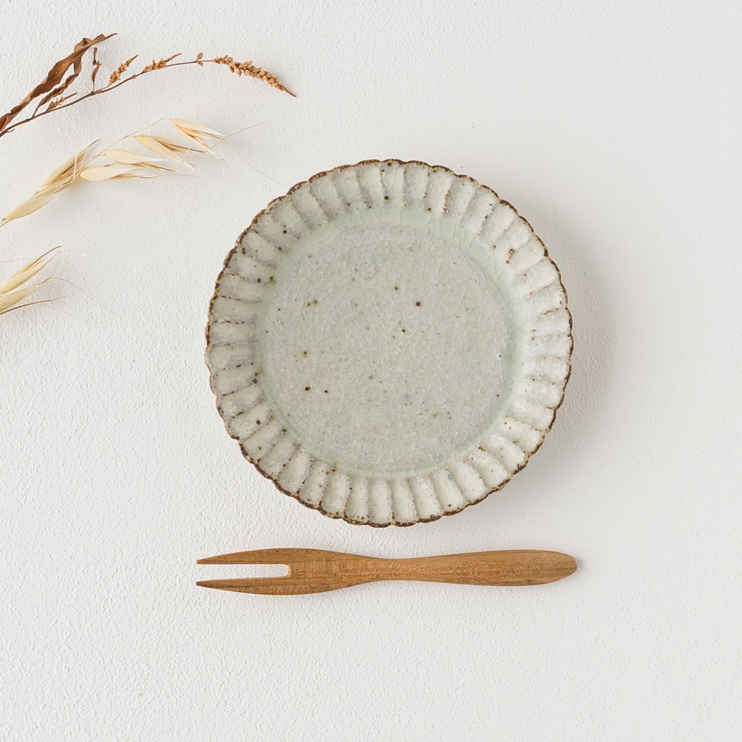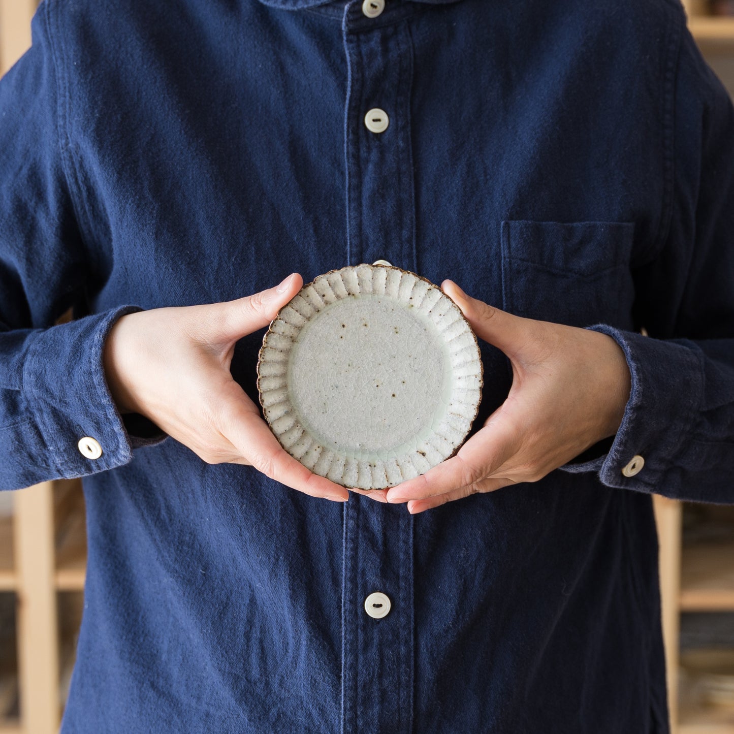ひとつひとつ丁寧に施されたリムの美しい鎬と青みがかった粉引きの白に目を奪われます。和紙を思わせるような柔らかな質感や風合いと焼成後の冷却時に生じる釉のヒビ割れ模様も素敵でお料理をより美しく、美味しく見せてくれます。