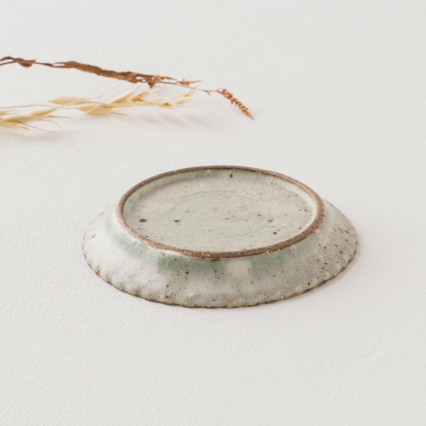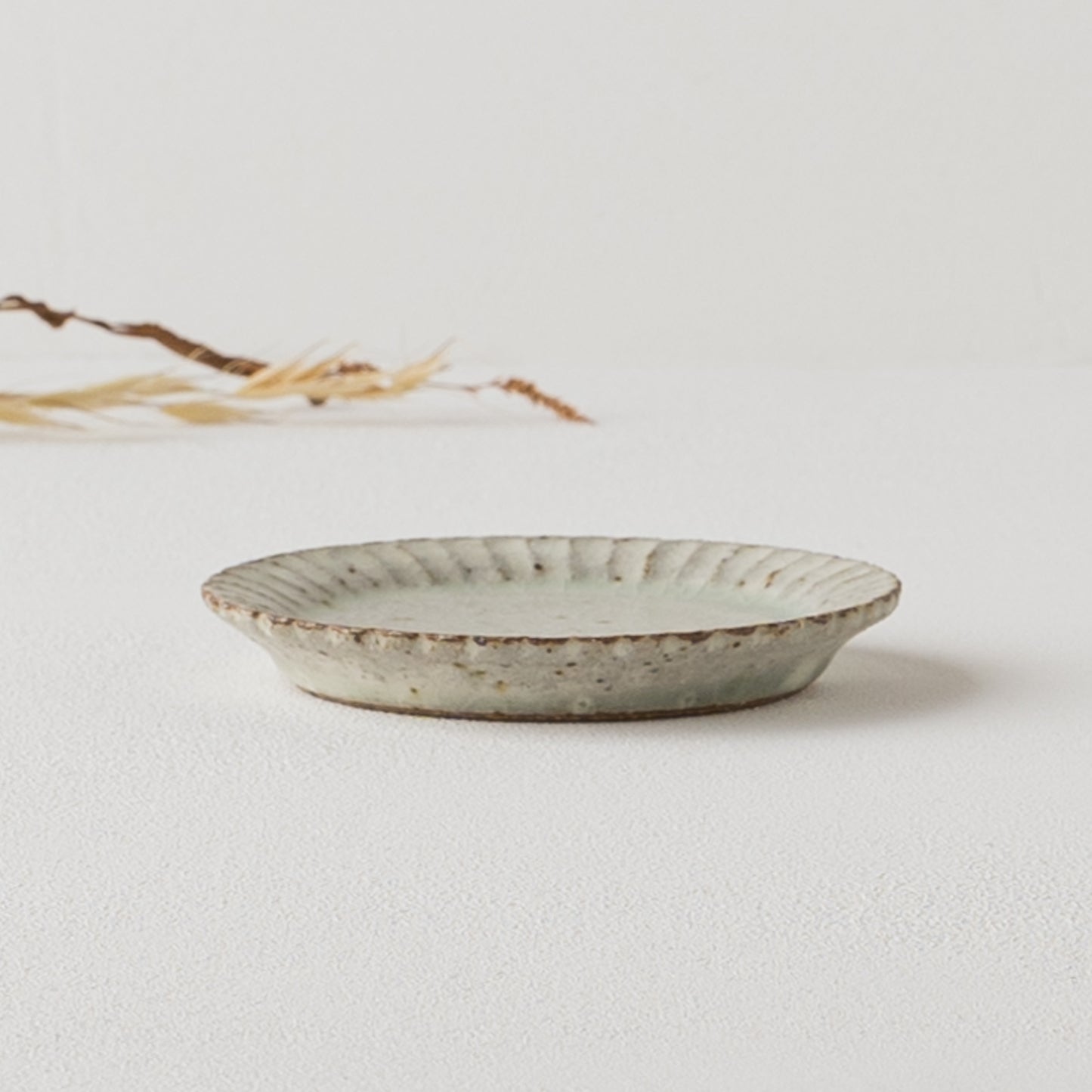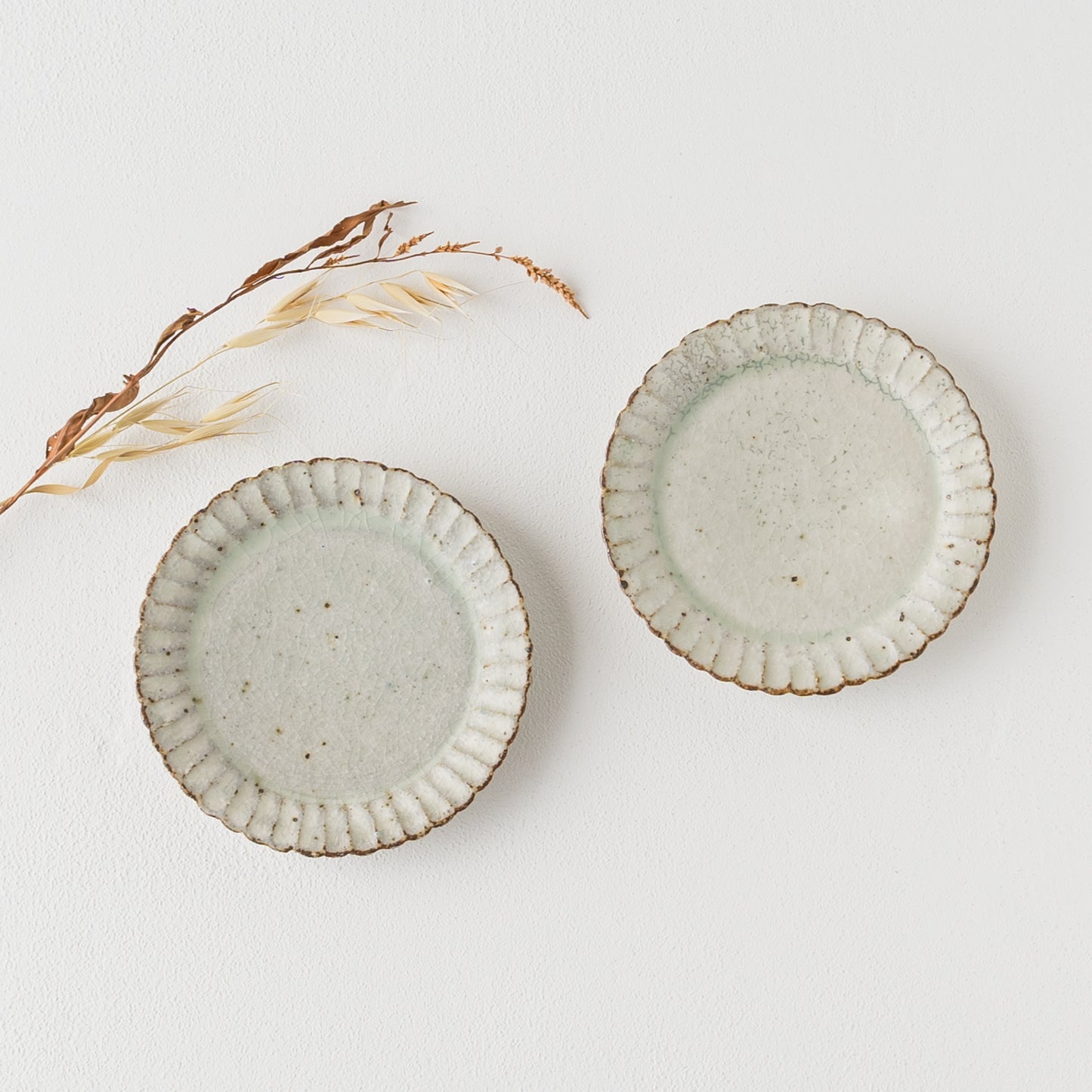 ひとつひとつ丁寧に施されたリムの美しい鎬と青みがかった粉引きの白に目を奪われます。和紙を思わせるような柔らかな質感や風合いと焼成後の冷却時に生じる釉のヒビ割れ模様も素敵でお料理をより美しく、美味しく見せてくれます。