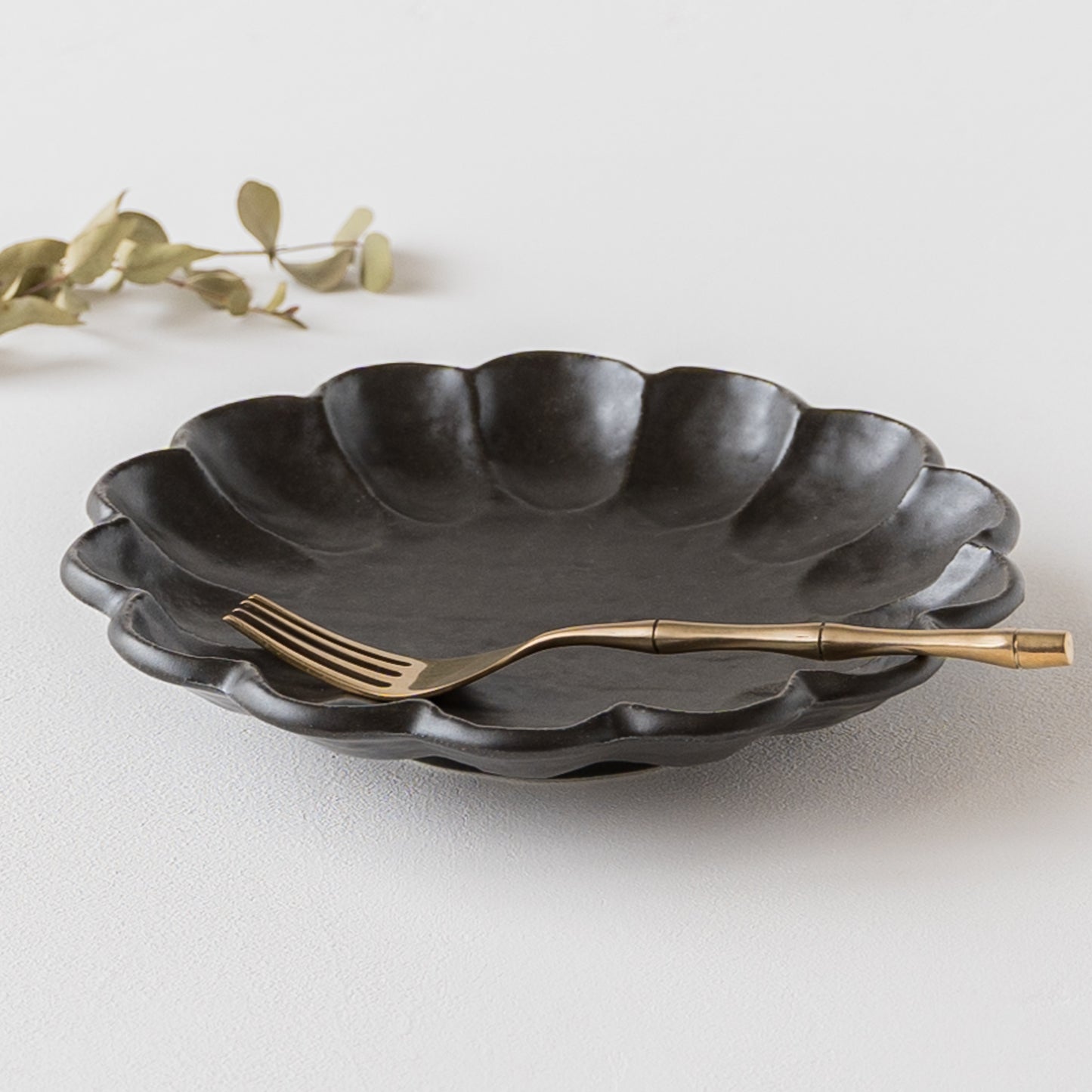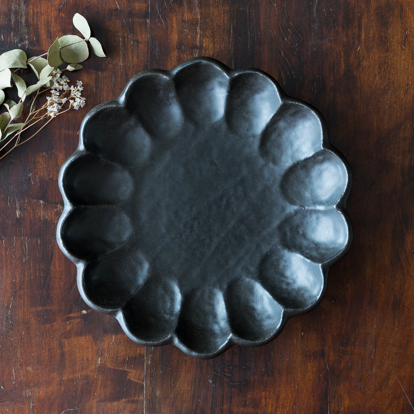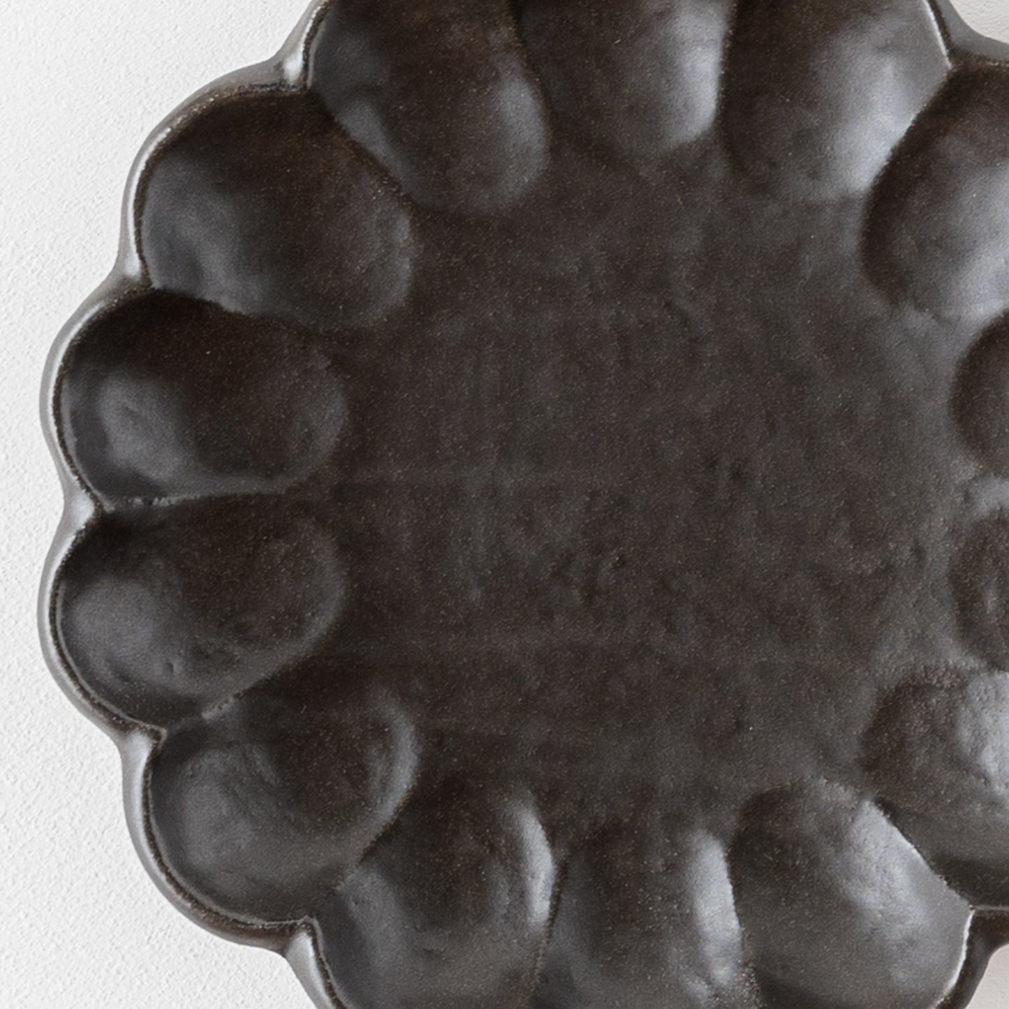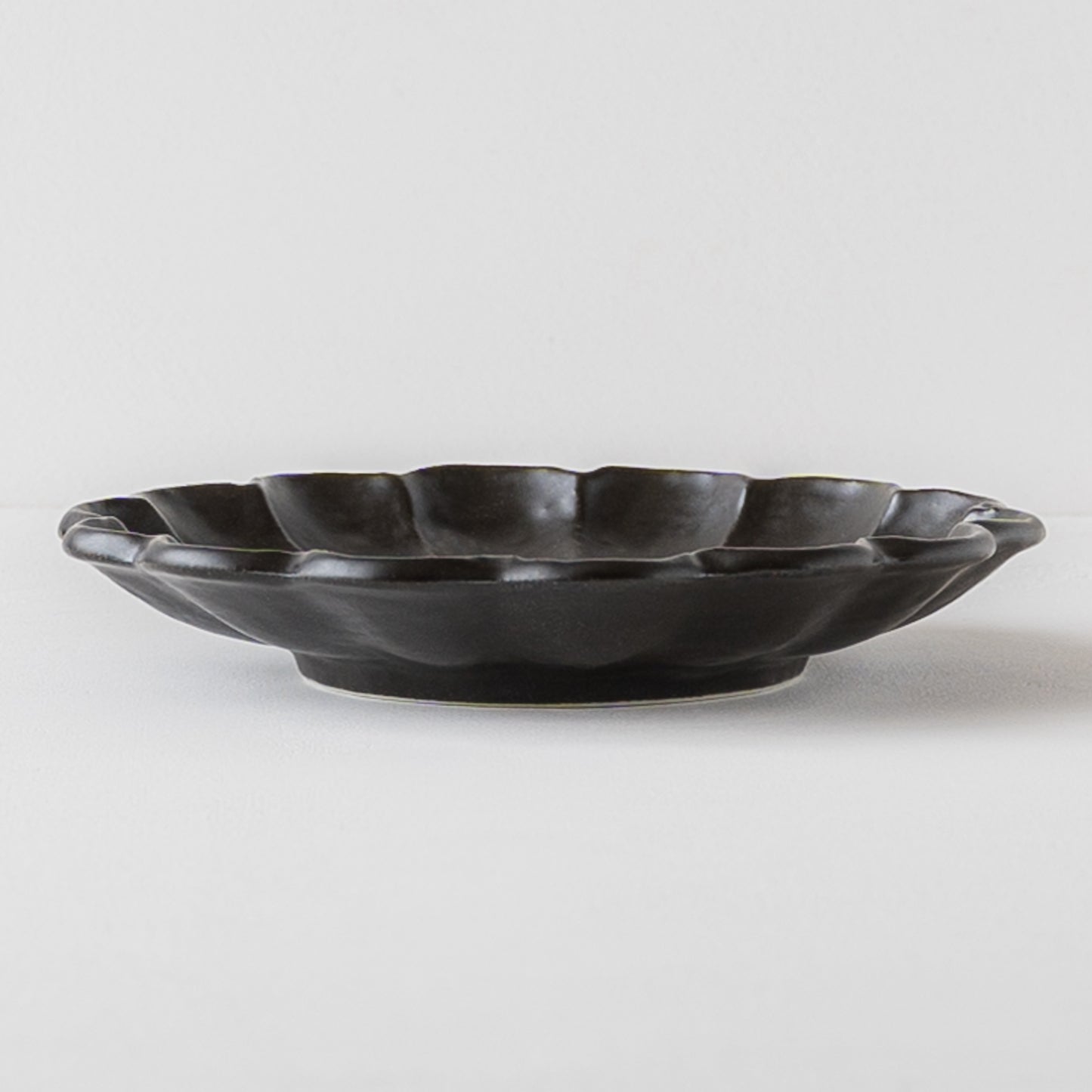 手づくり温もりが感じられる黒練の輪花皿。磁器なのに陶器のような土ものを感じる仕上がりになっています。黒いうつわはお料理や食卓をぐっと引き締めてくれます。