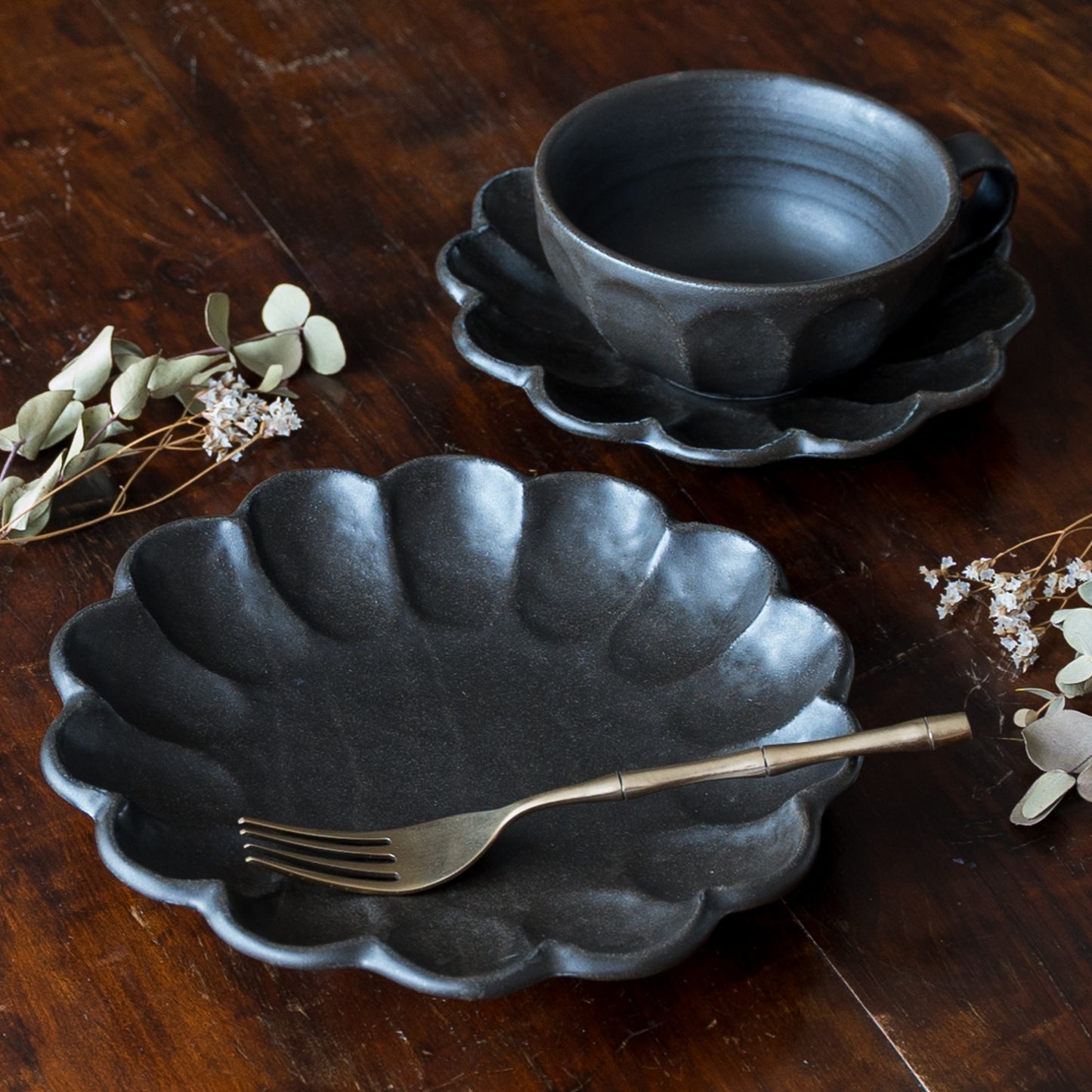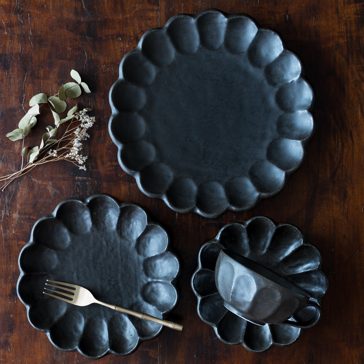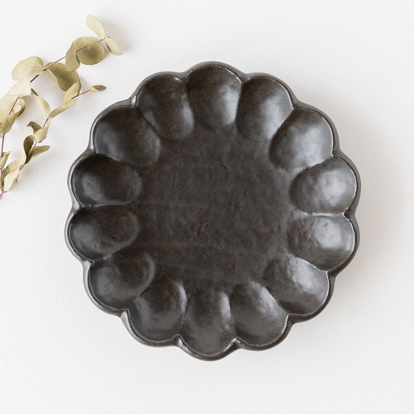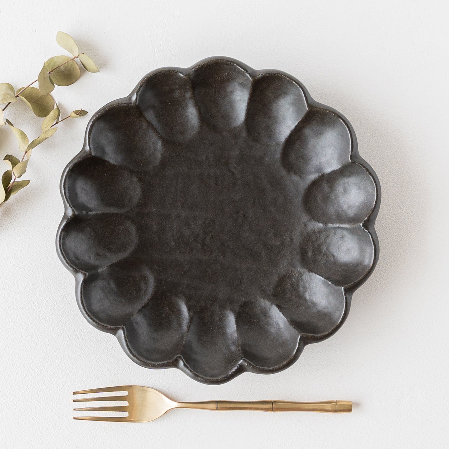 手づくり温もりが感じられる黒練の輪花皿。磁器なのに陶器のような土ものを感じる仕上がりになっています。黒いうつわはお料理や食卓をぐっと引き締めてくれます。