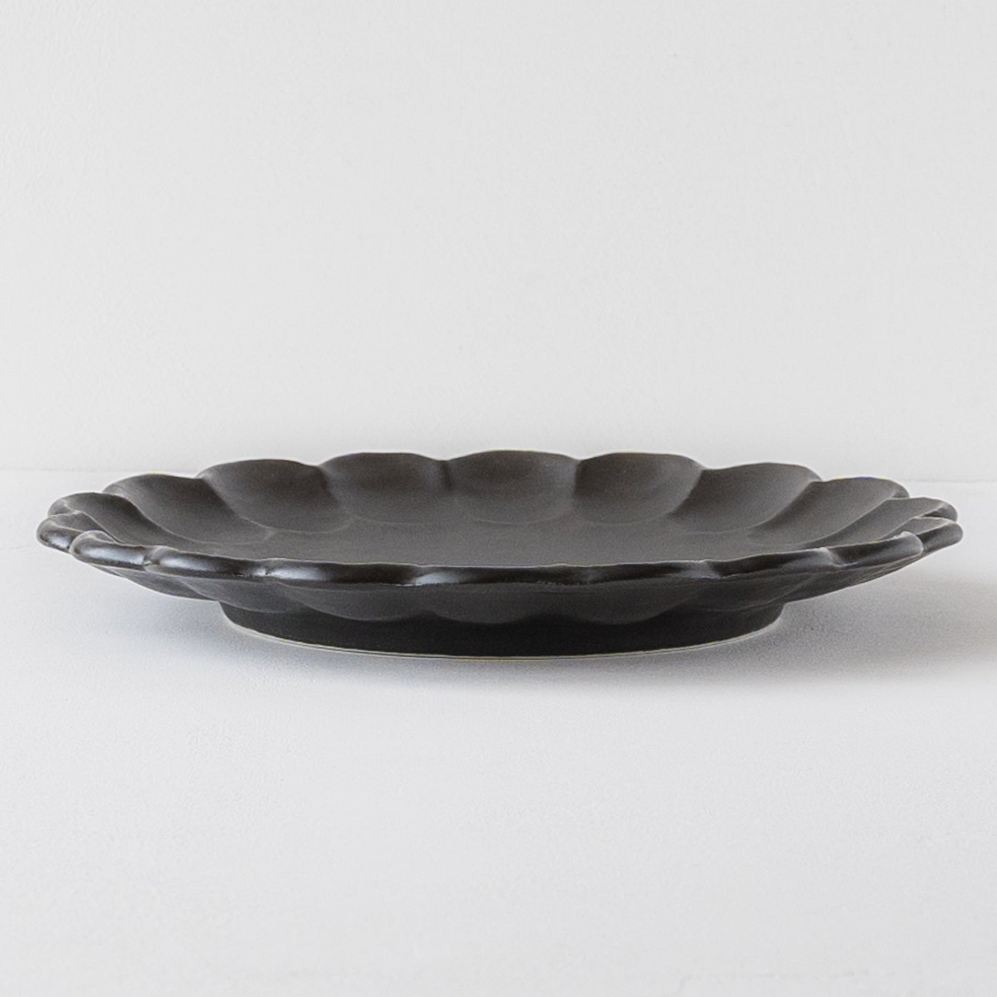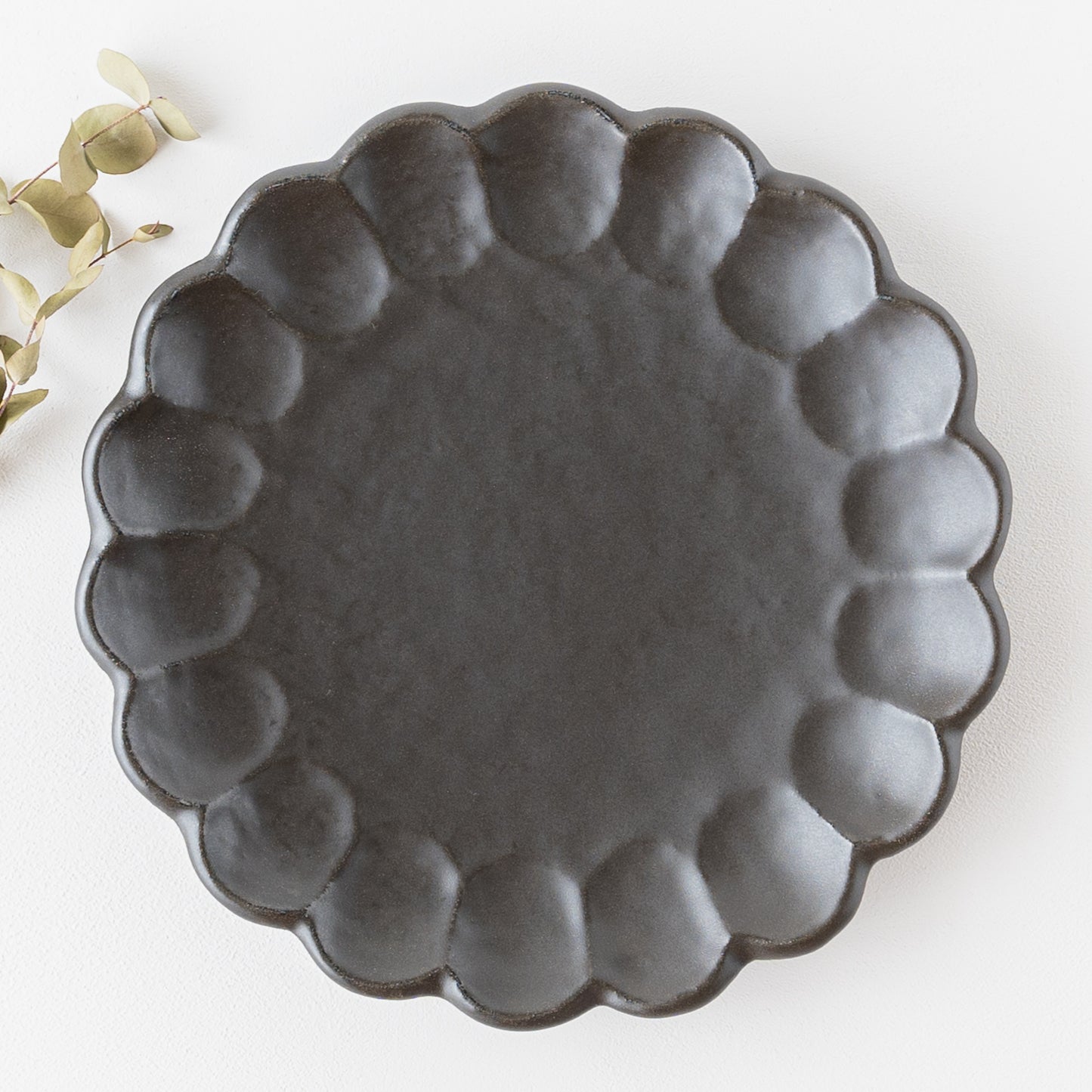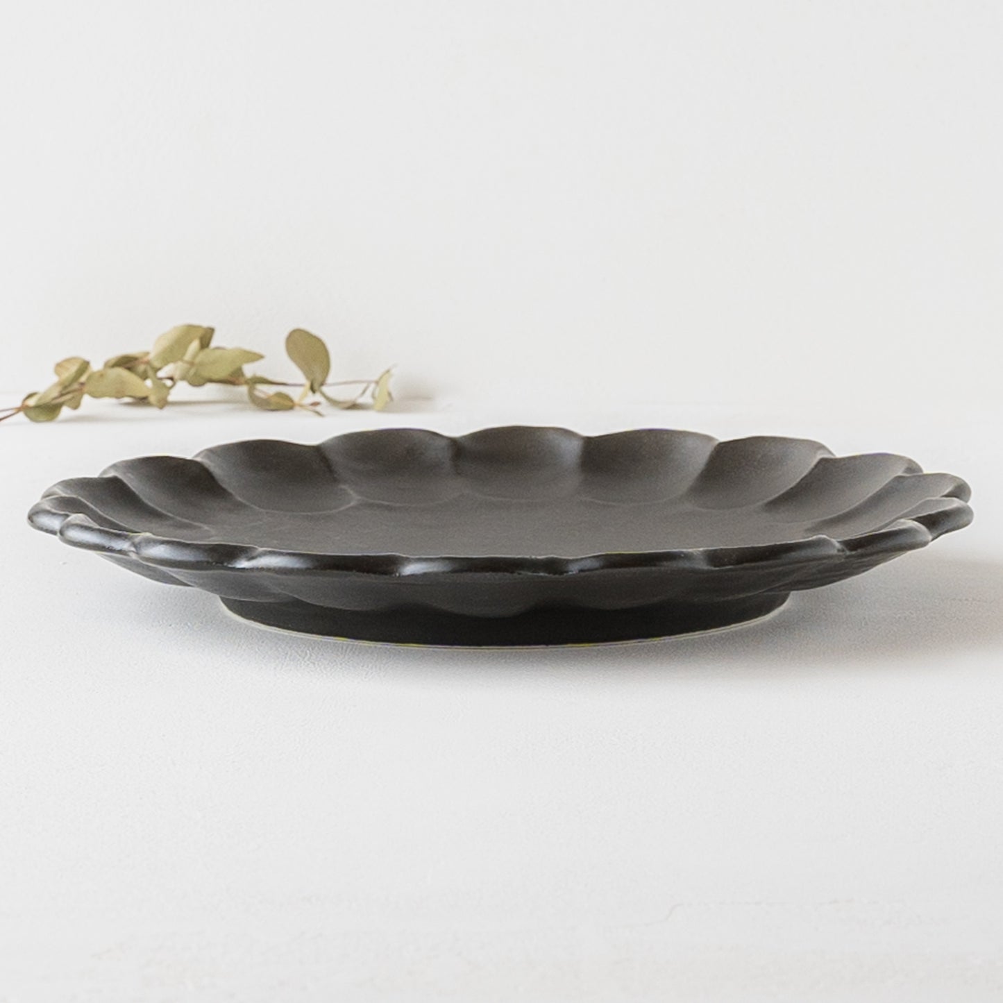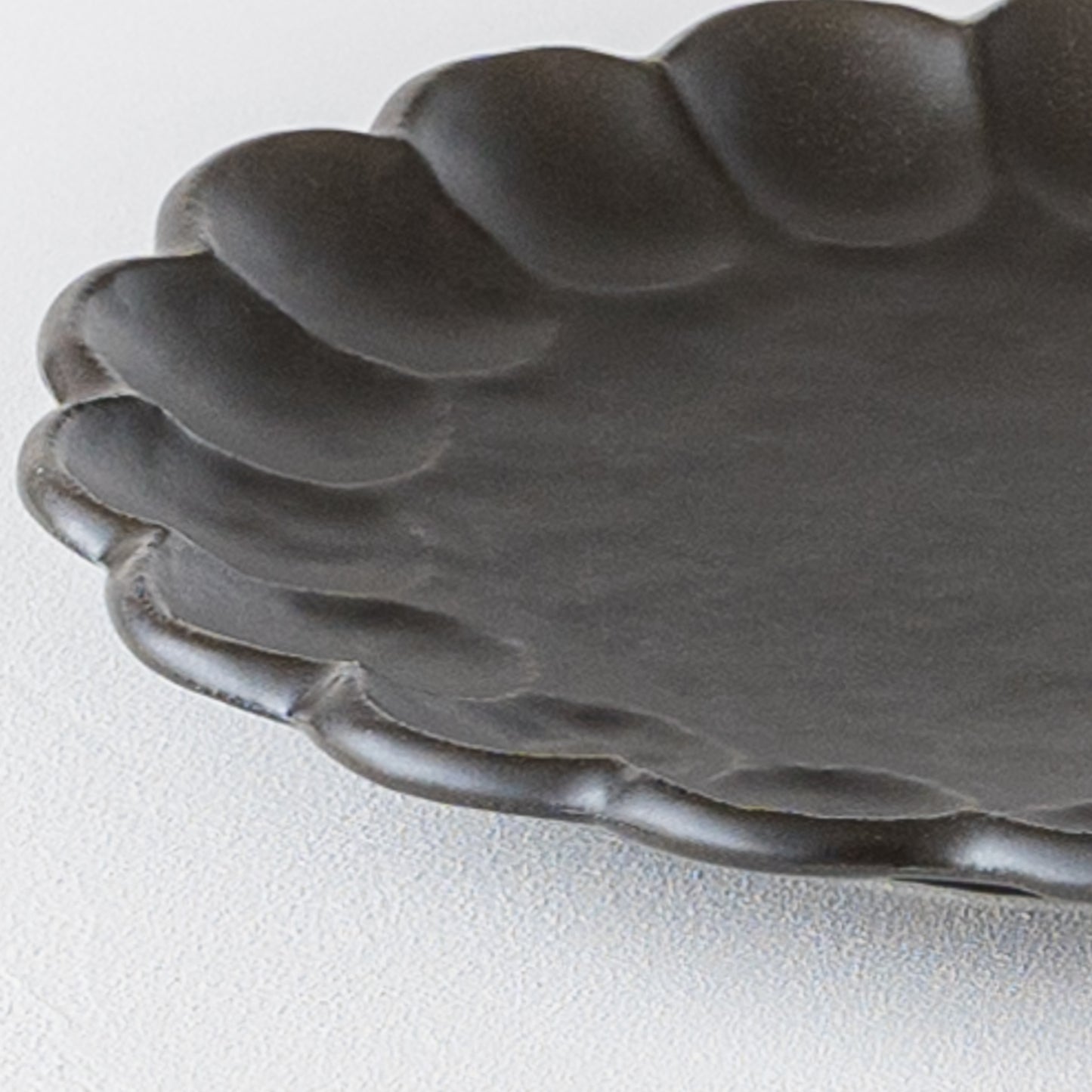 手づくり温もりが感じられる黒練の輪花皿。磁器なのに陶器のような土ものを感じる仕上がりになっています。黒いうつわはお料理や食卓をぐっと引き締めてくれます。