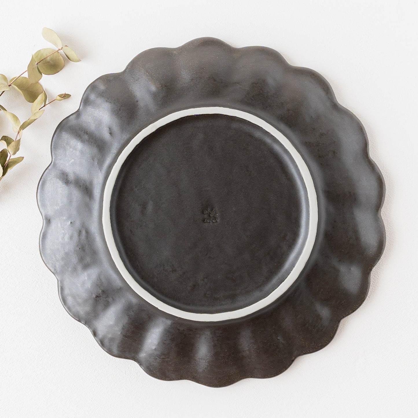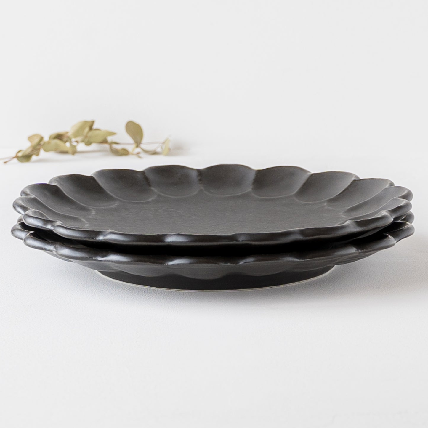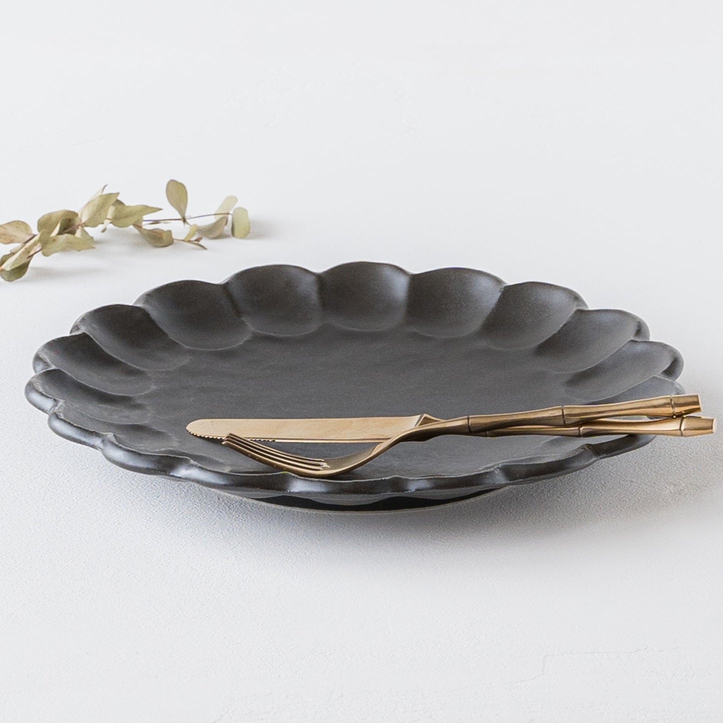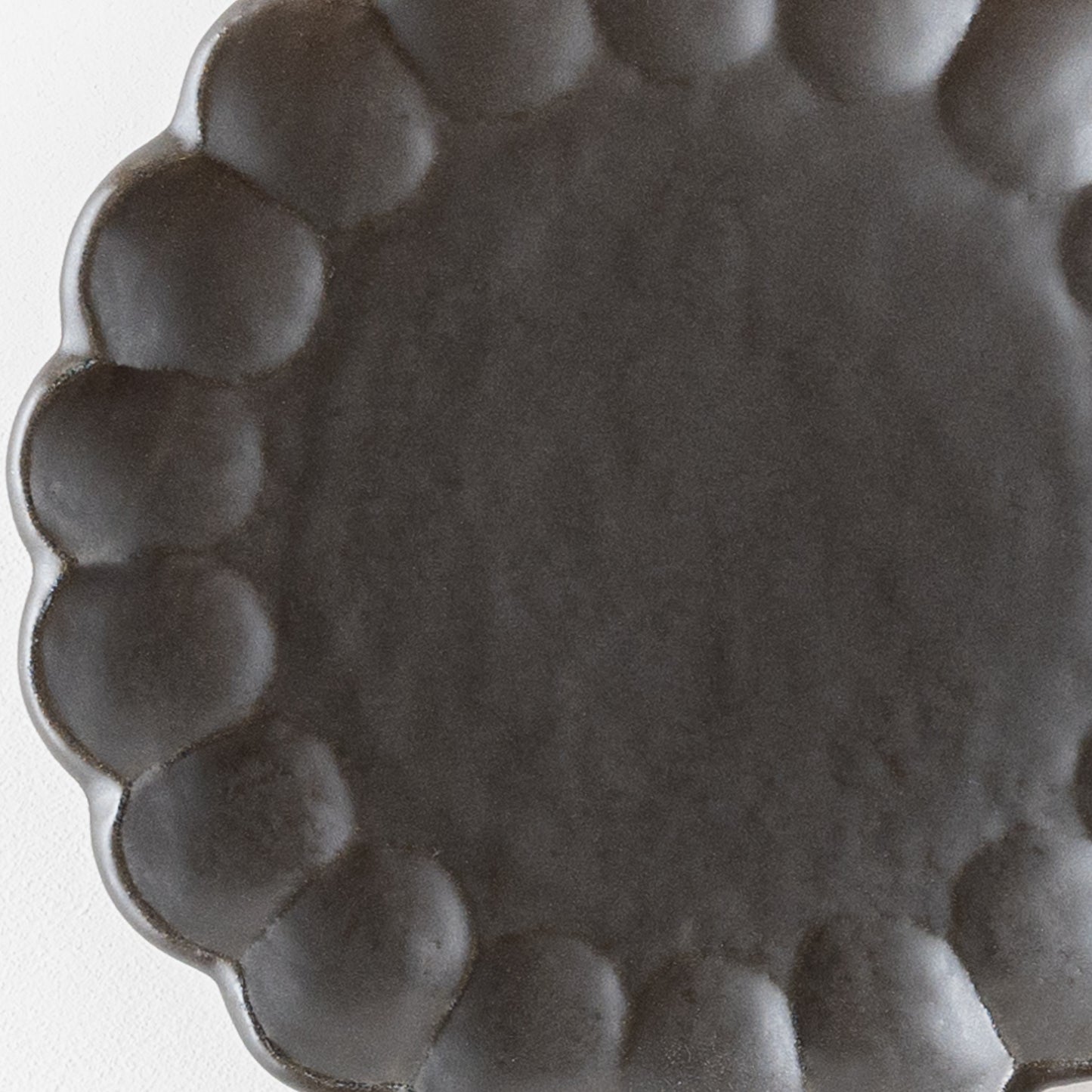 手づくり温もりが感じられる黒練の輪花皿。磁器なのに陶器のような土ものを感じる仕上がりになっています。黒いうつわはお料理や食卓をぐっと引き締めてくれます。