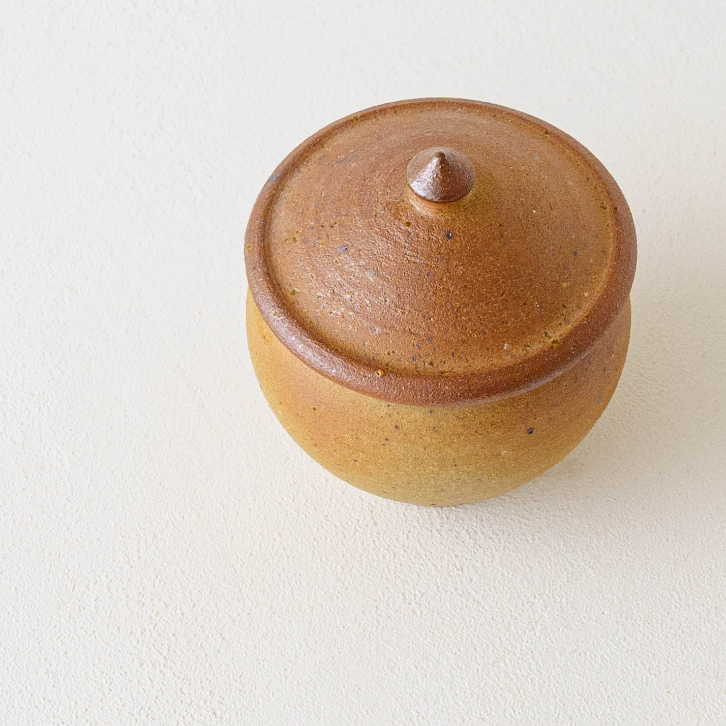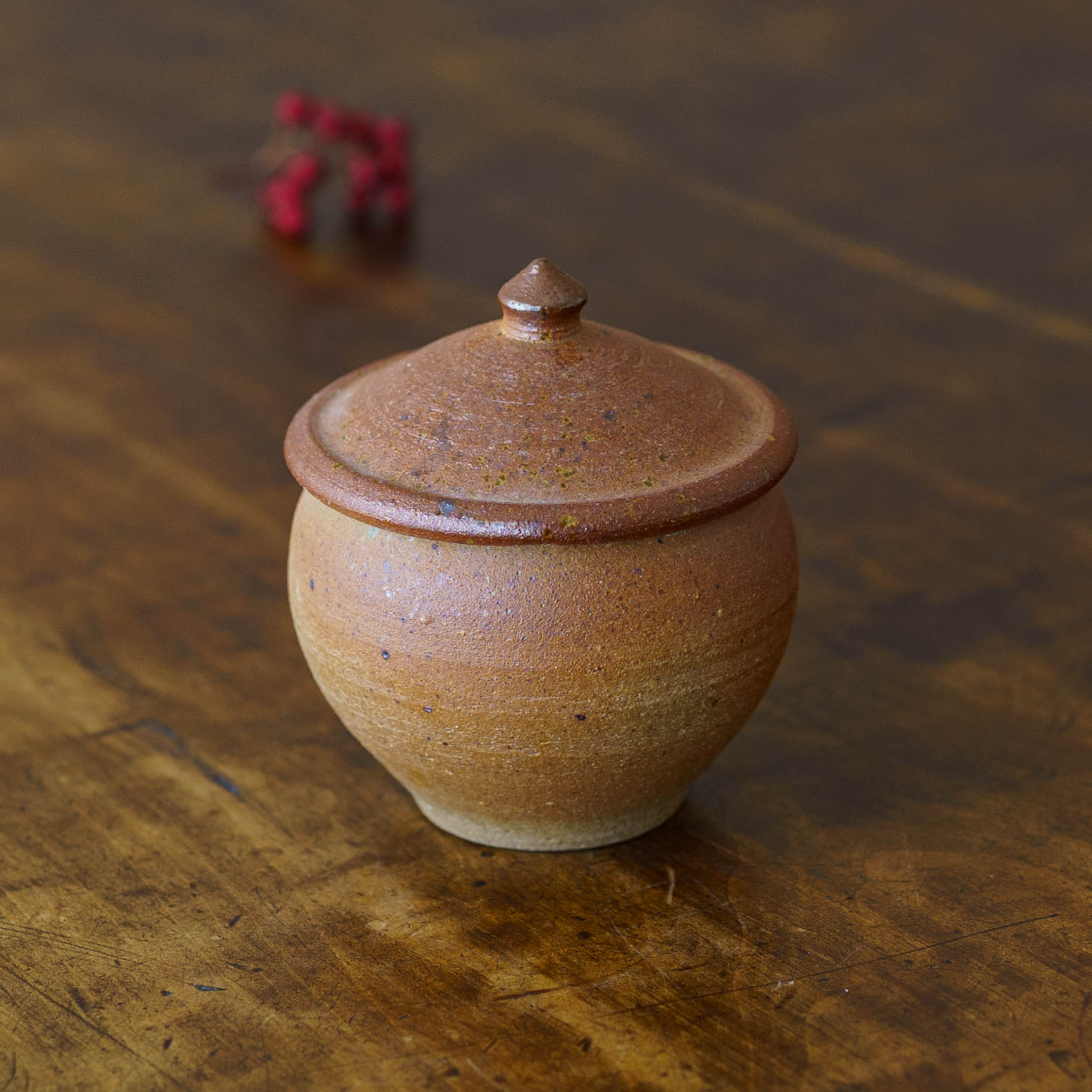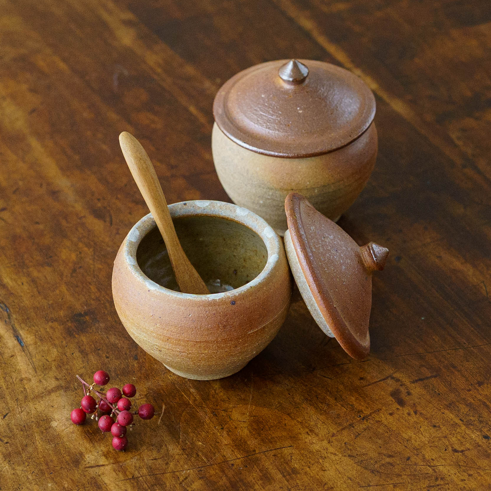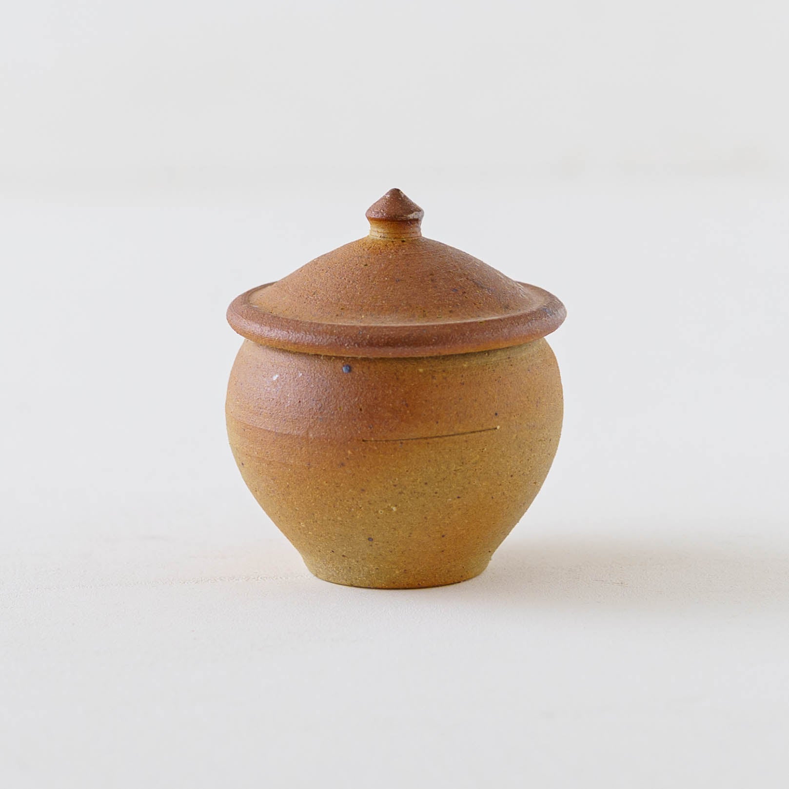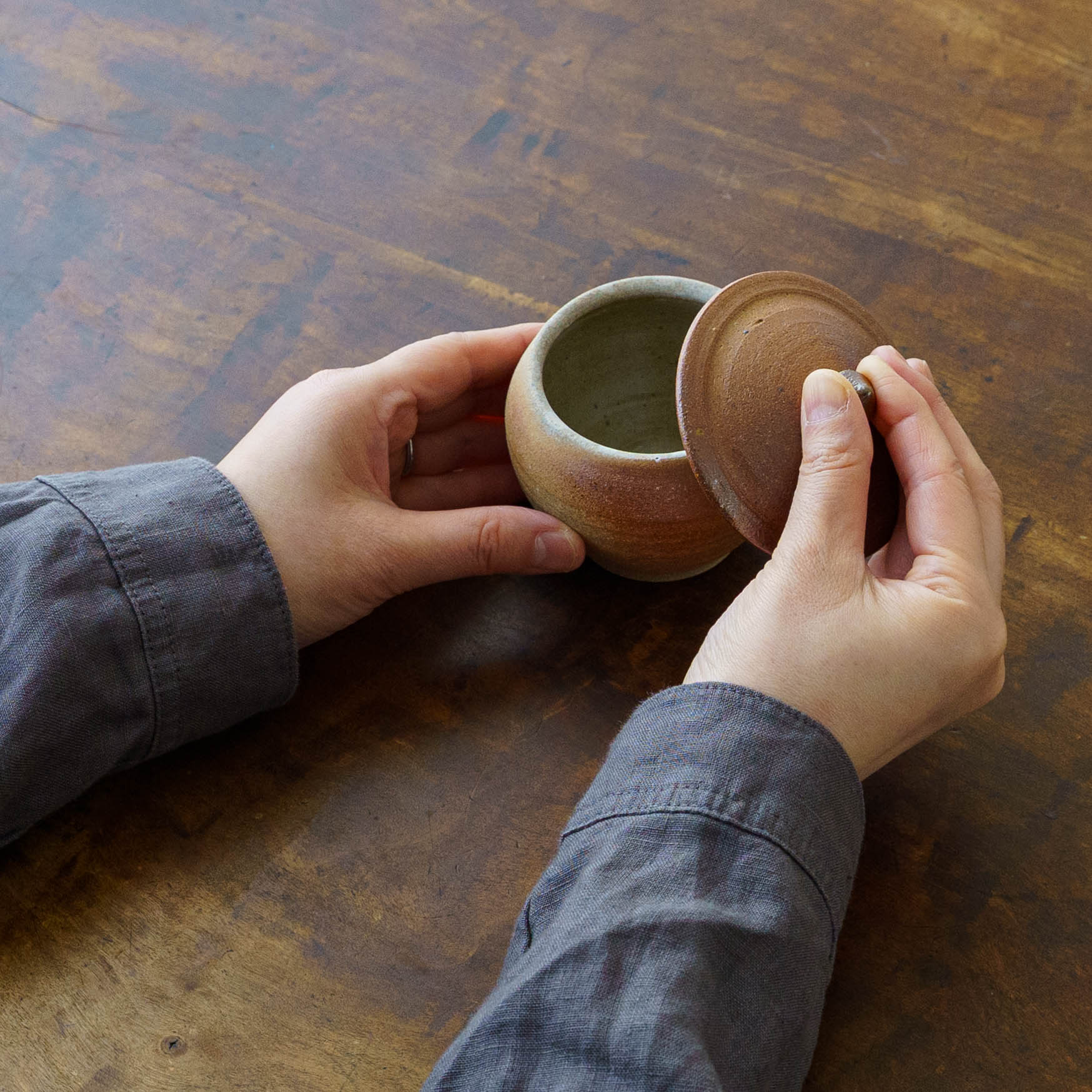 砂糖壷は、内側に釉薬が施してあるので、余分な水分の出入りをやわらかく整えてくれます。お砂糖はもちろん、冷蔵庫にも入るサイズなので、梅干しやらっきょう、新生姜などの保存食を入れても。そして、そのまま食卓へ。素朴な外観と実用性が美しく共存している、用と美を兼ね備えた焼き締め小壺です。