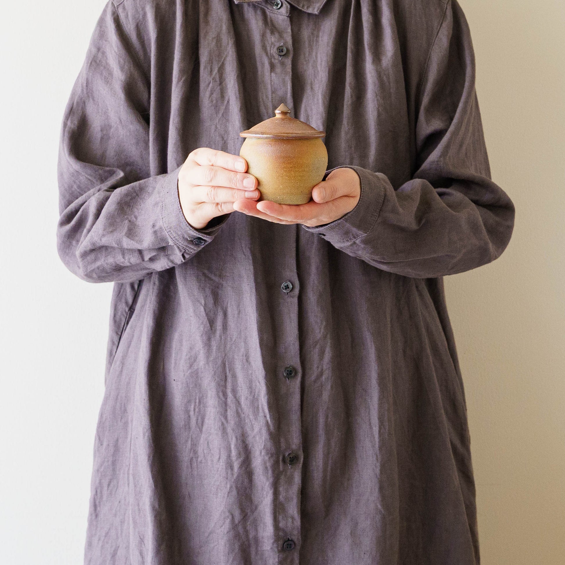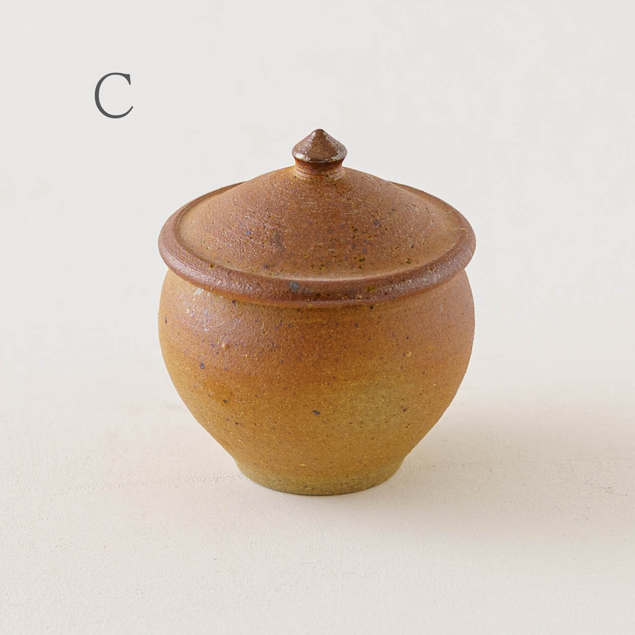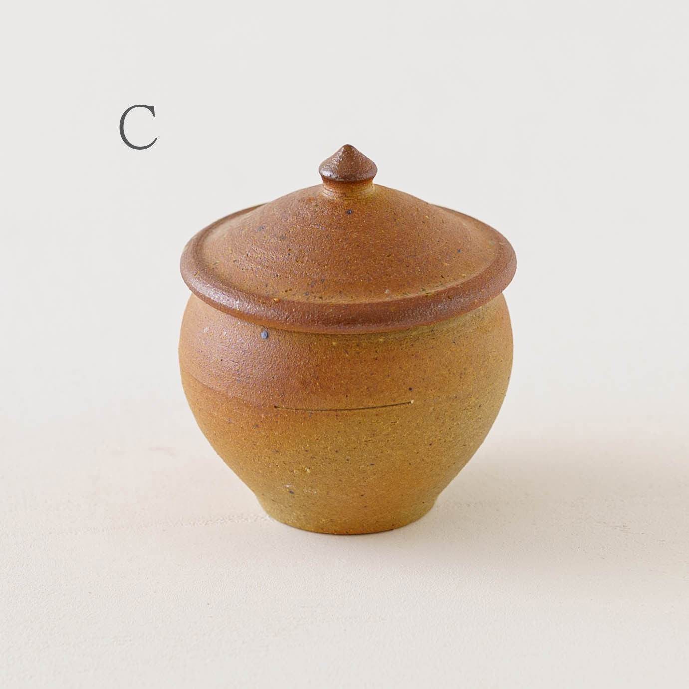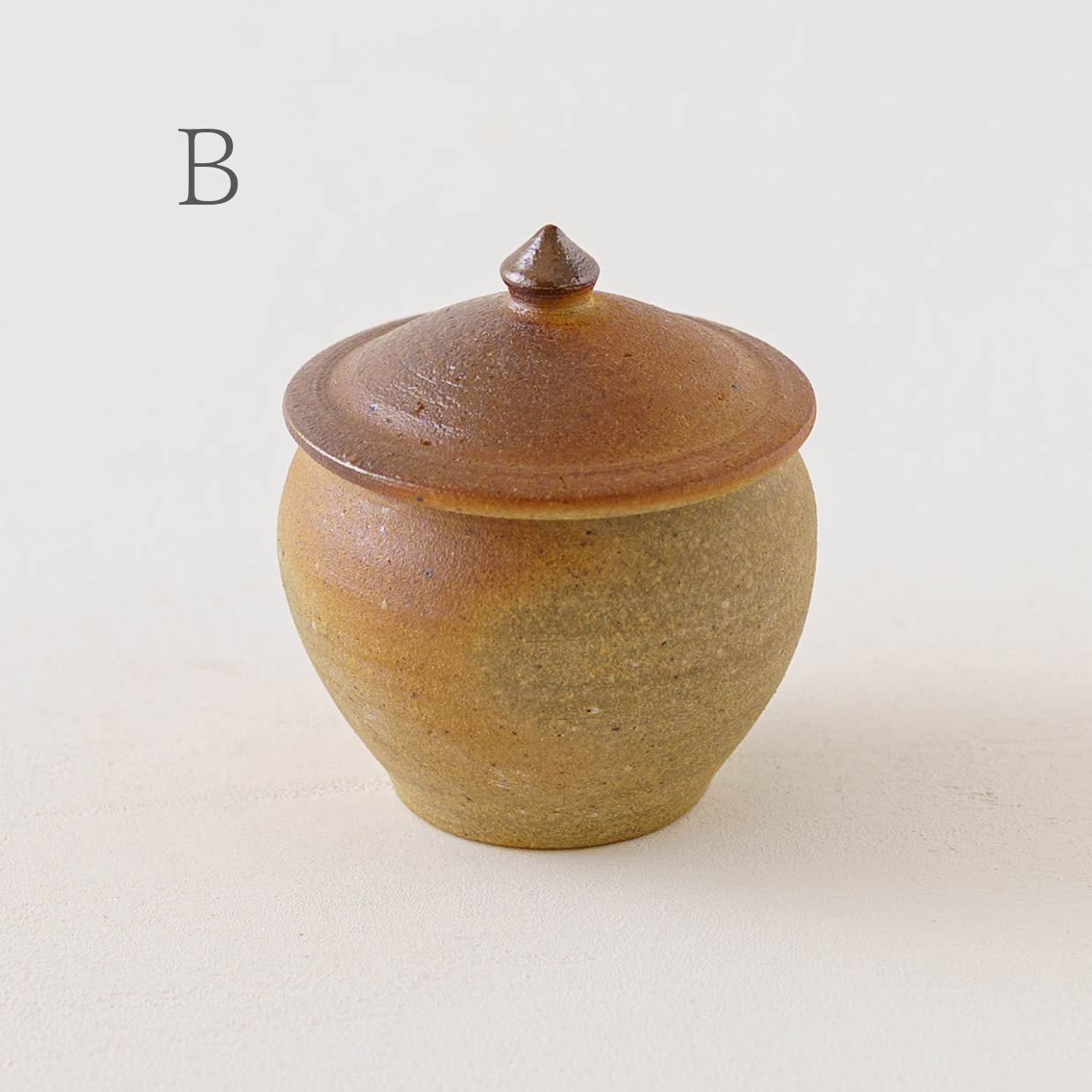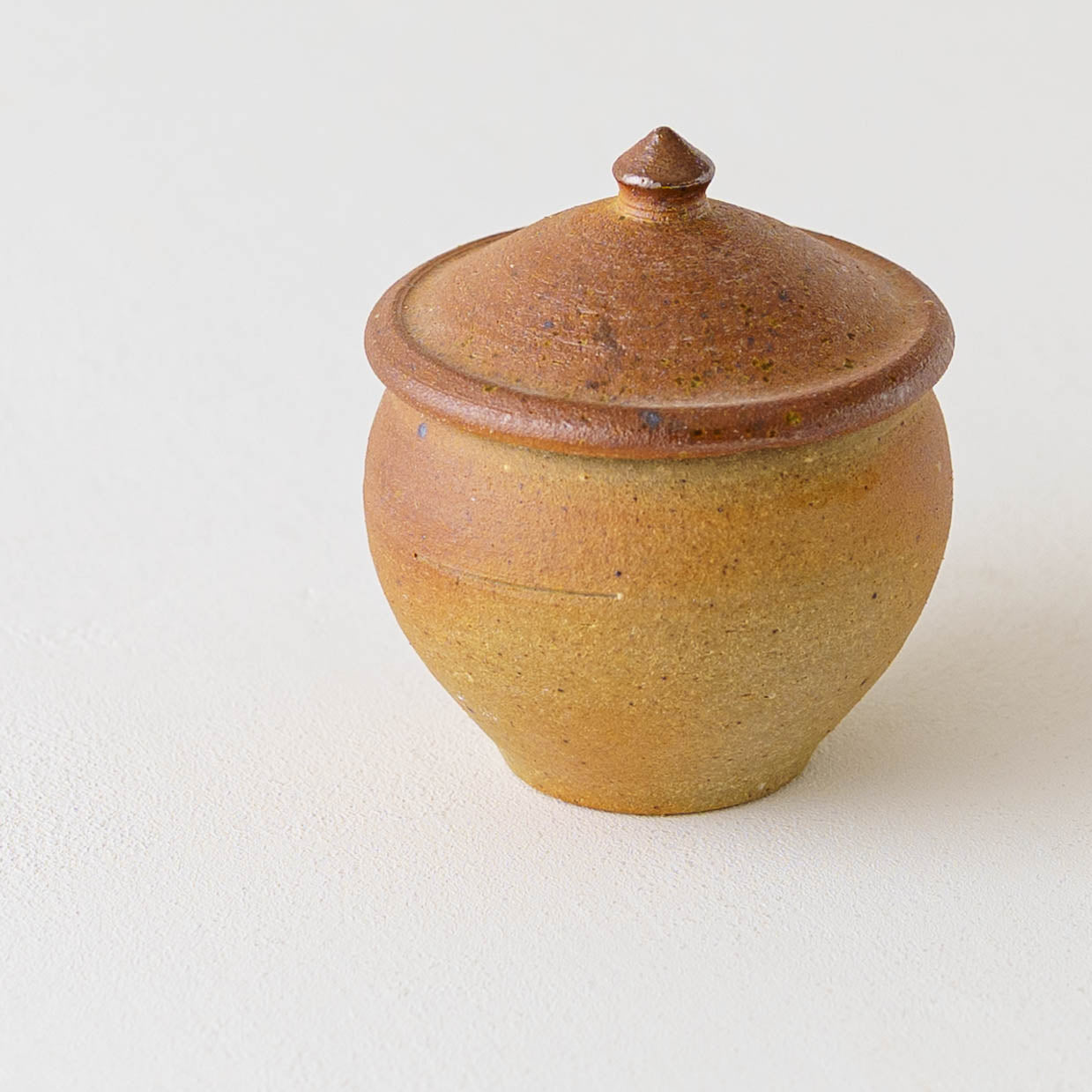砂糖壷は、内側に釉薬が施してあるので、余分な水分の出入りをやわらかく整えてくれます。お砂糖はもちろん、冷蔵庫にも入るサイズなので、梅干しやらっきょう、新生姜などの保存食を入れても。そして、そのまま食卓へ。素朴な外観と実用性が美しく共存している、用と美を兼ね備えた焼き締め小壺です。
