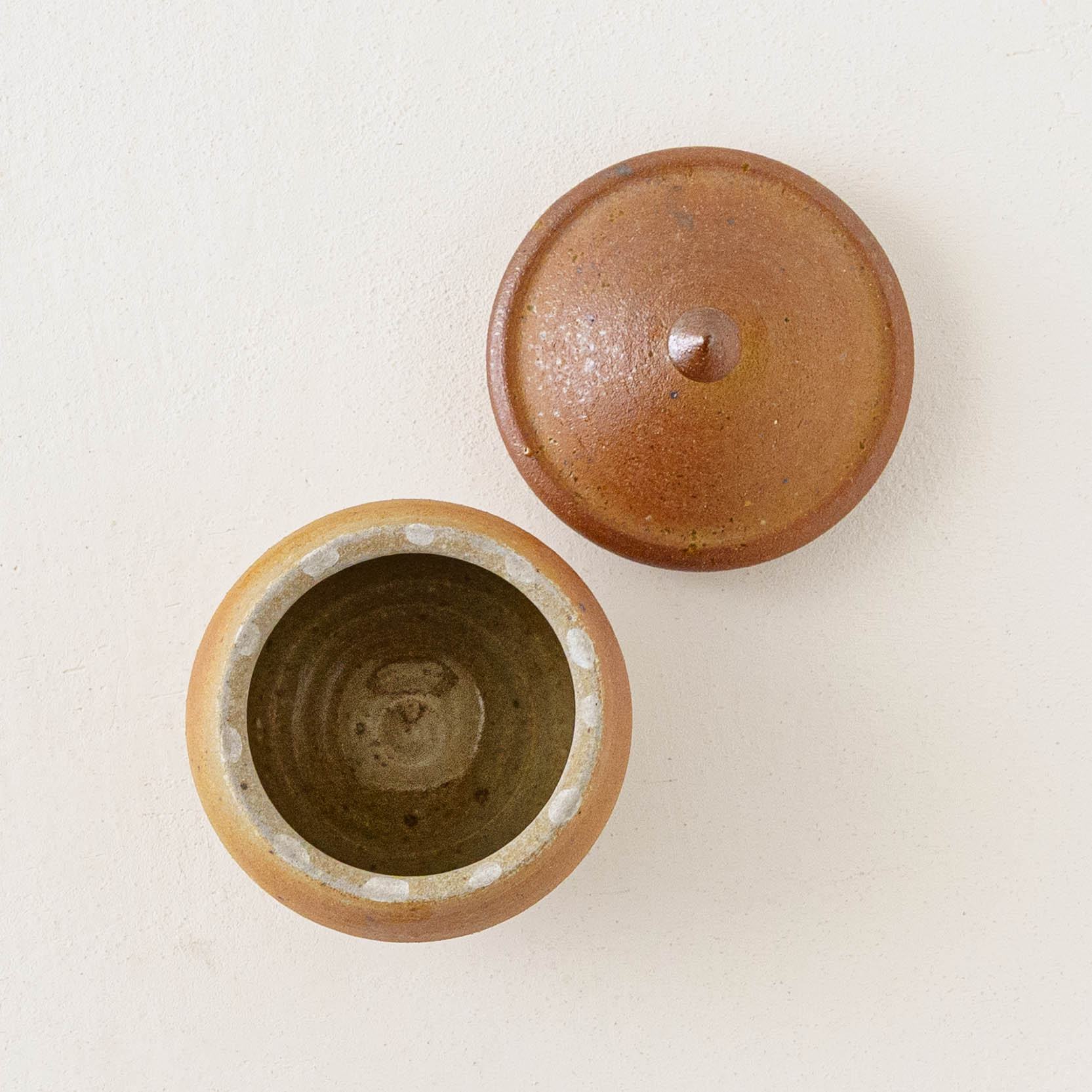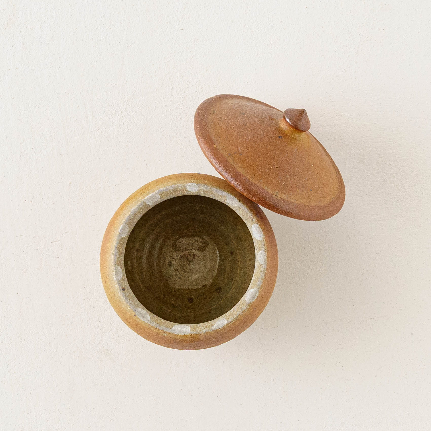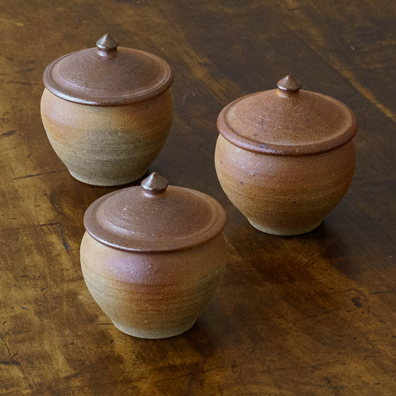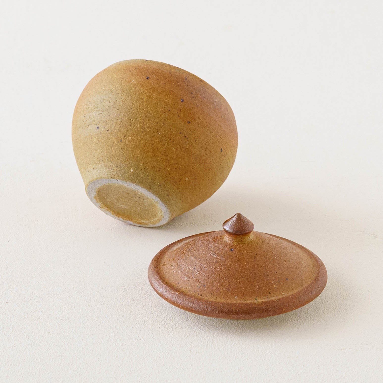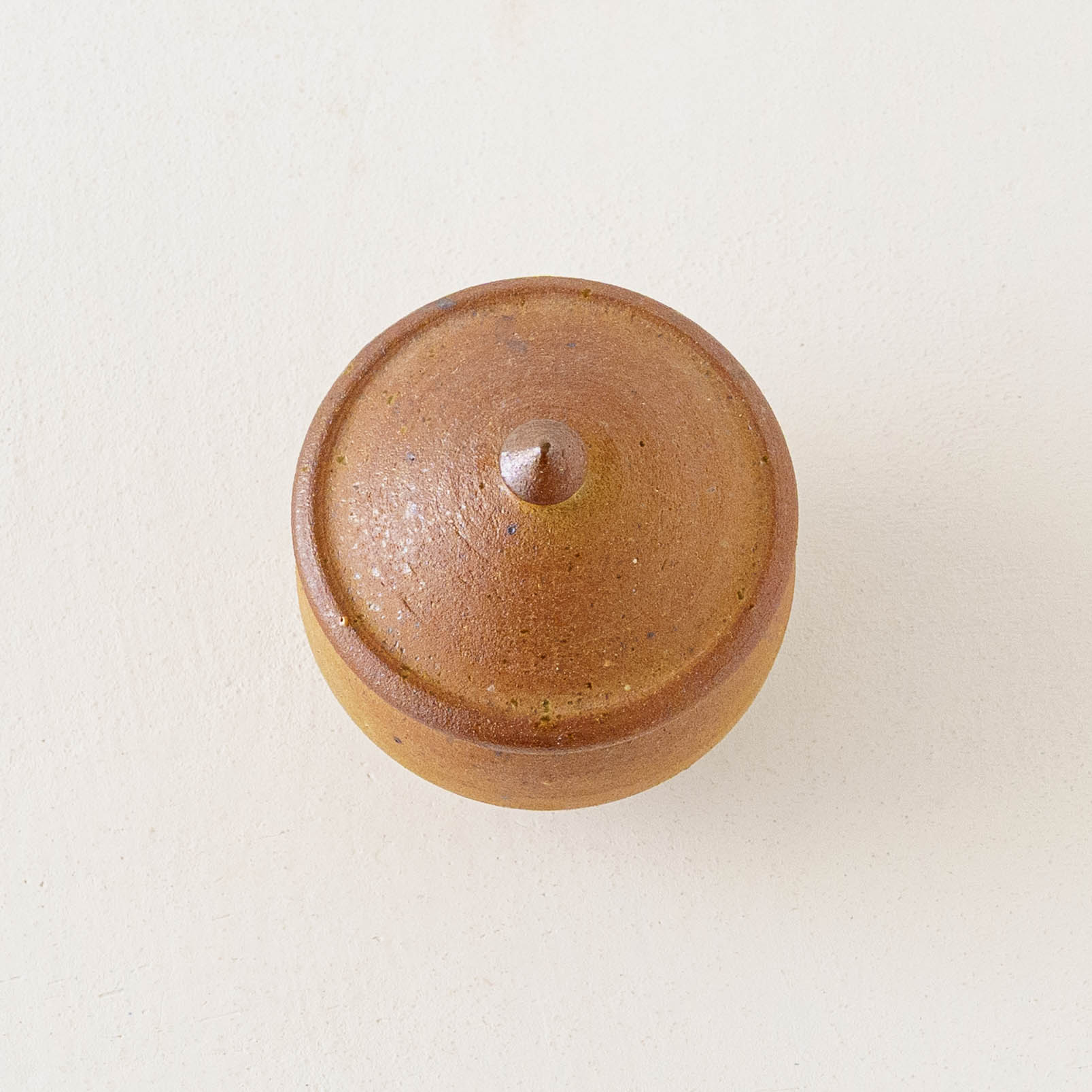 砂糖壷は、内側に釉薬が施してあるので、余分な水分の出入りをやわらかく整えてくれます。お砂糖はもちろん、冷蔵庫にも入るサイズなので、梅干しやらっきょう、新生姜などの保存食を入れても。そして、そのまま食卓へ。素朴な外観と実用性が美しく共存している、用と美を兼ね備えた焼き締め小壺です。