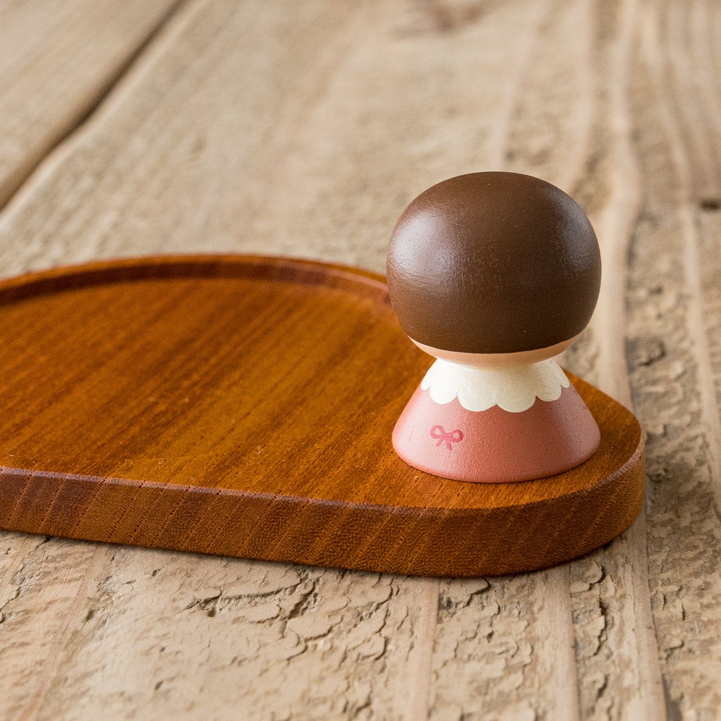 絵の具をたっぷりのせて描くかわいさ満点の絵。ほんの少しぷっくりと盛り上がった感じがより一層かわいさをアップさせています。絵の具部分は保護のために食器用のニスを塗っていますが、無塗装部分はオイル仕上げなので経年変化を楽しめますよ。