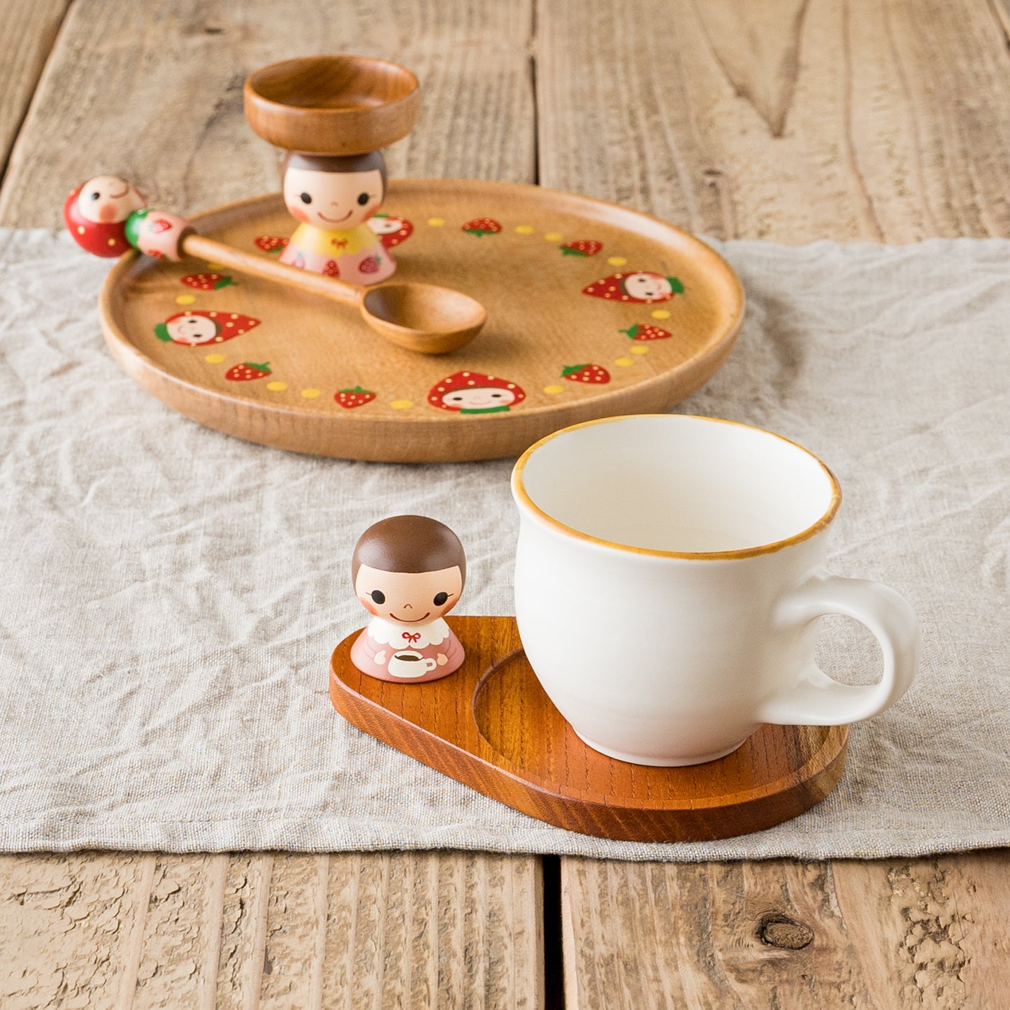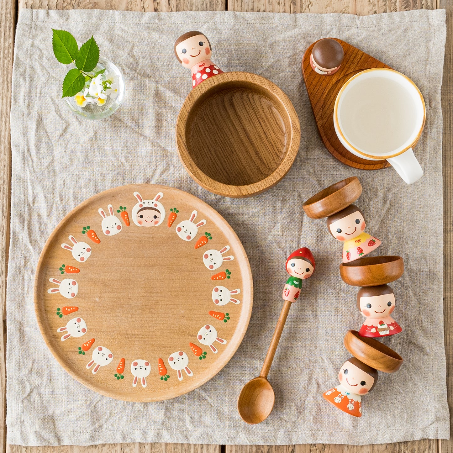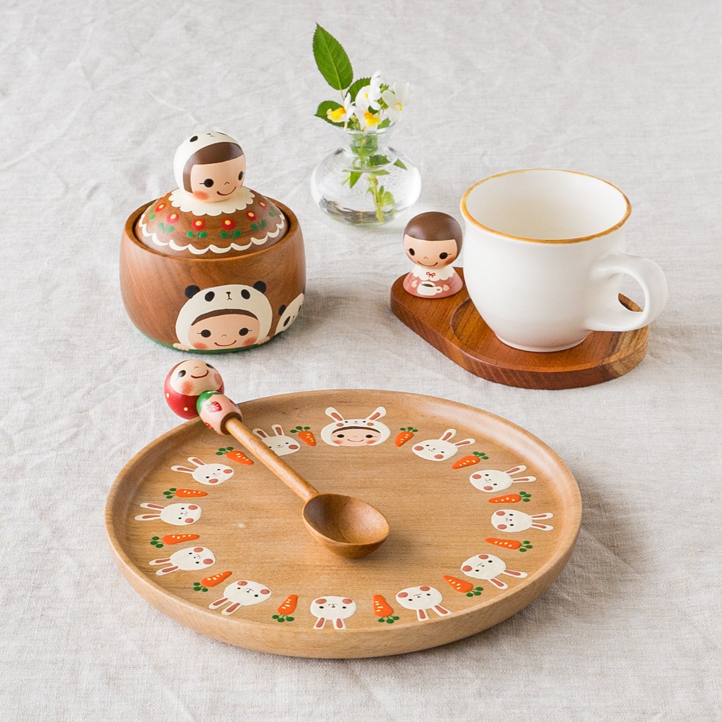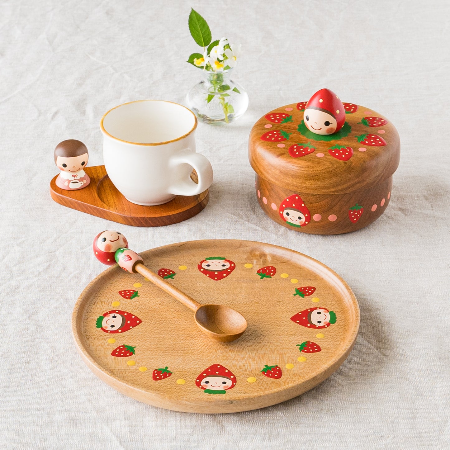 「木」に「絵」を描いた「雑貨」。木の持つあたかかみのあるやさしい風合いに思わずくすっと笑みがこぼれてしまう愛らしい絵。そのかわいらしい佇まいはずっと眺めていたくなります。旦那さまが木工旋盤で削って形づくったあと、奥さまが絵付をしていく共同作業。おふたりの温もりと優しさがぎゅっと詰まっています。