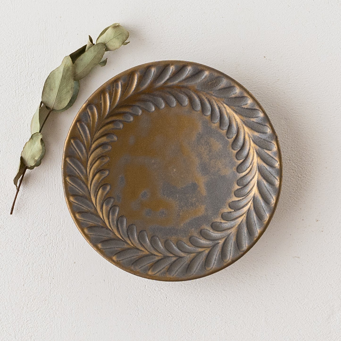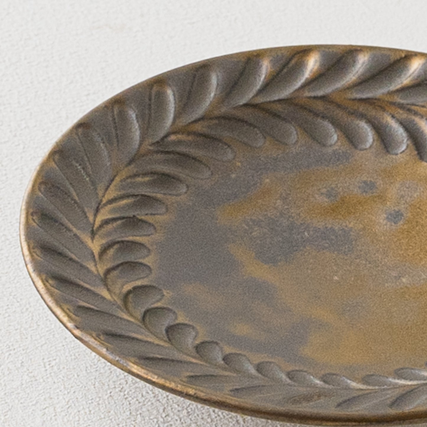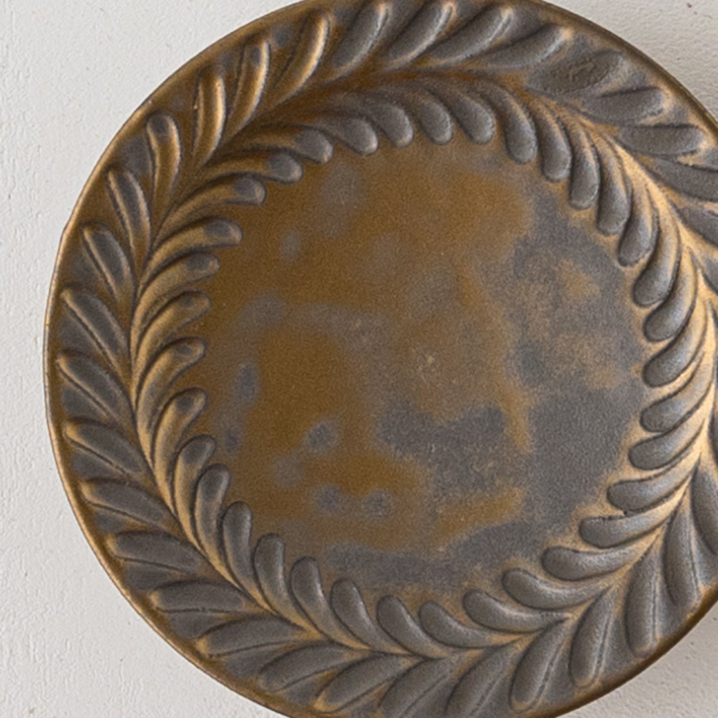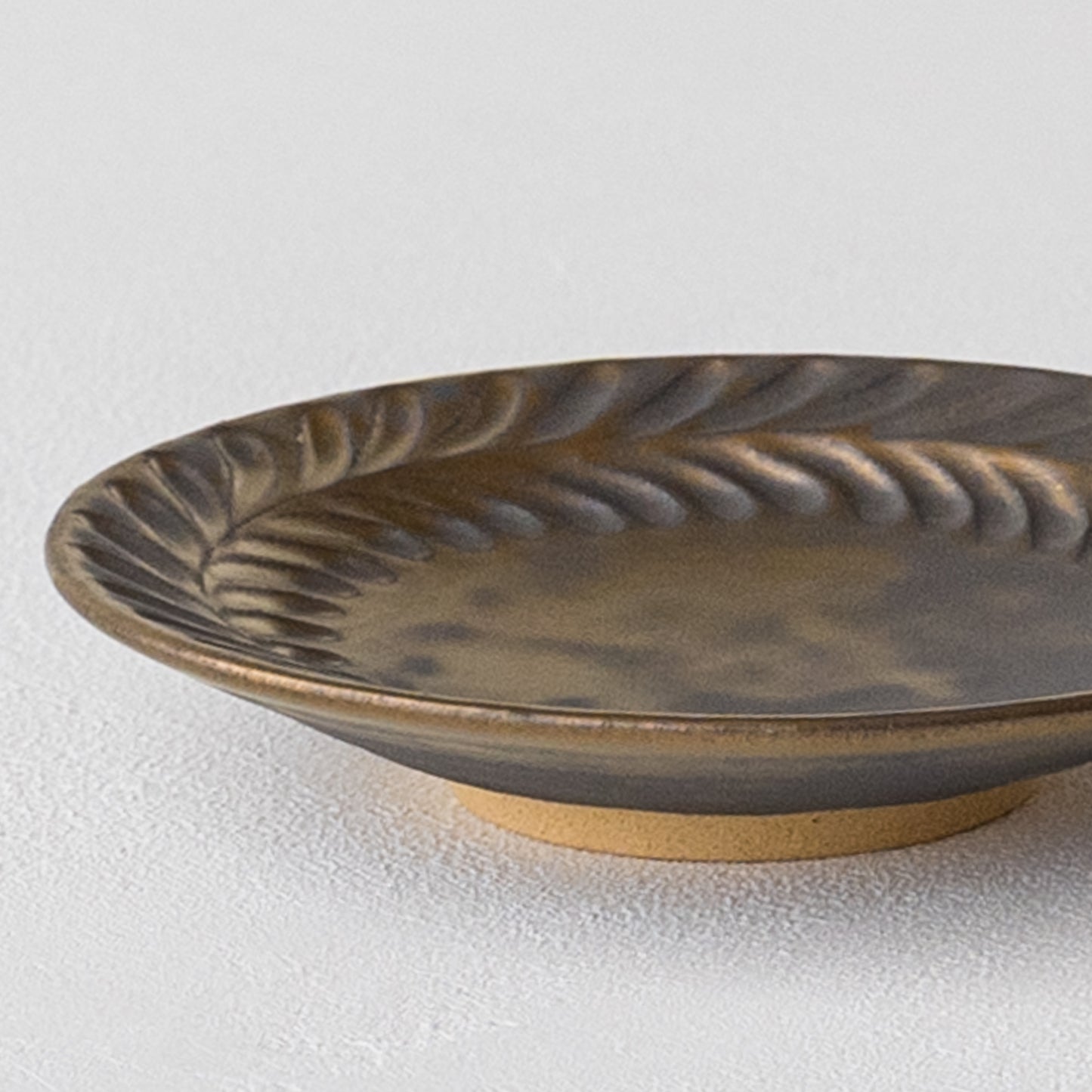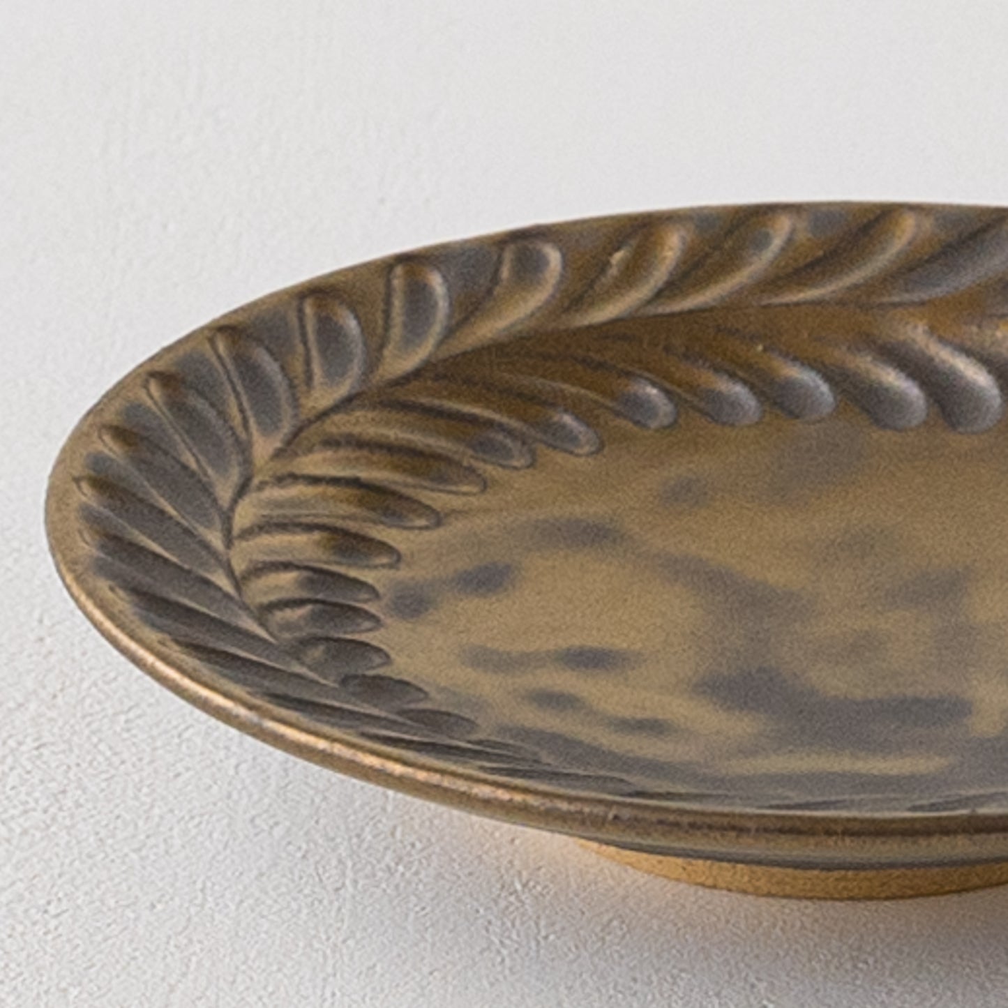 リムに流れるように施された葉っぱ模様。鈍く光る金色とマット調のブロンズの表情が美しいマンガン釉。釉薬が織りなす多彩な表情が葉紋模様を際立たせています。