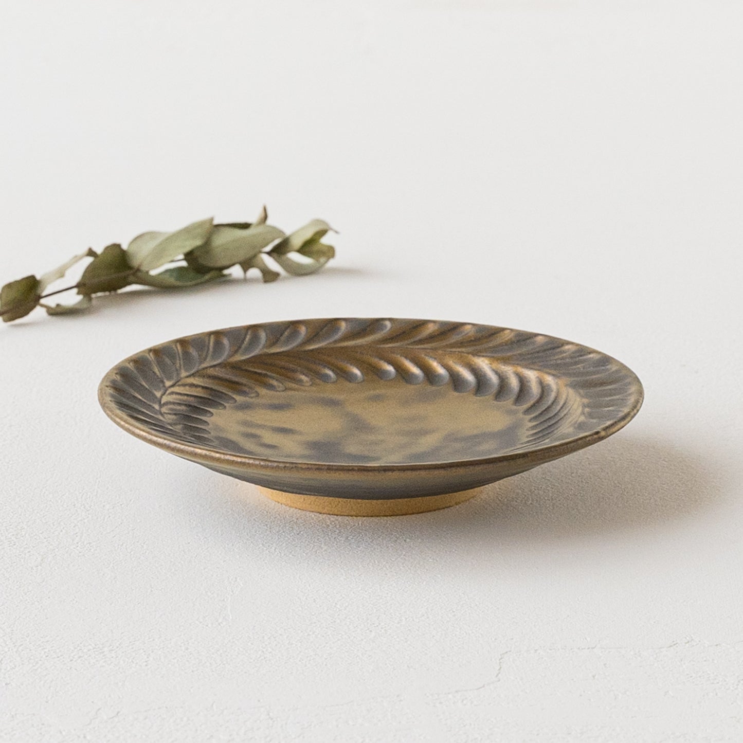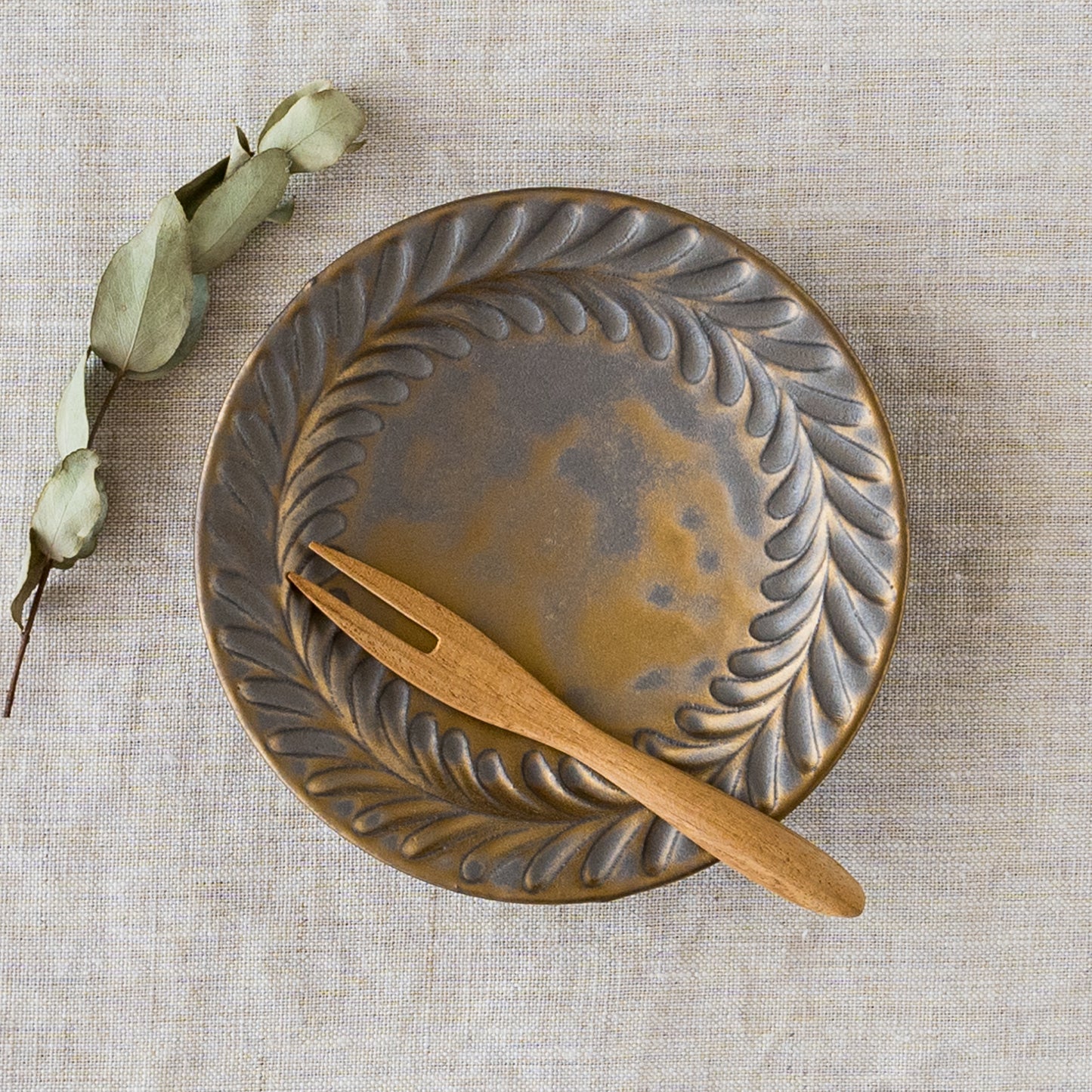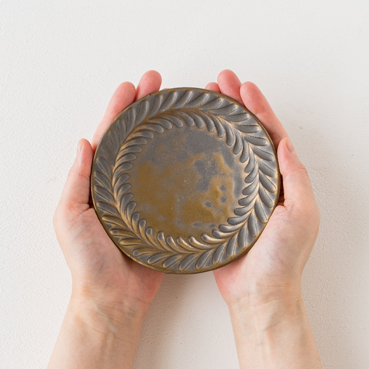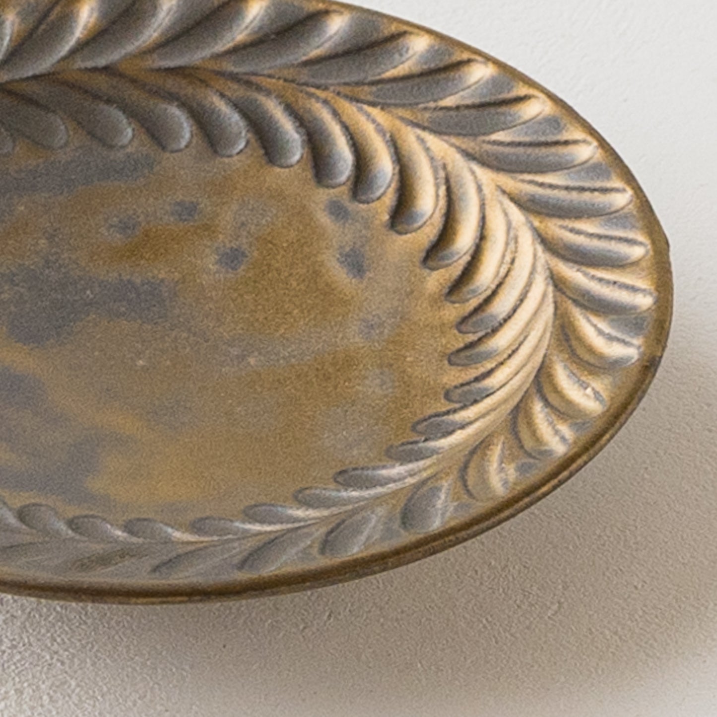 リムに流れるように施された葉っぱ模様。鈍く光る金色とマット調のブロンズの表情が美しいマンガン釉。釉薬が織りなす多彩な表情が葉紋模様を際立たせています。