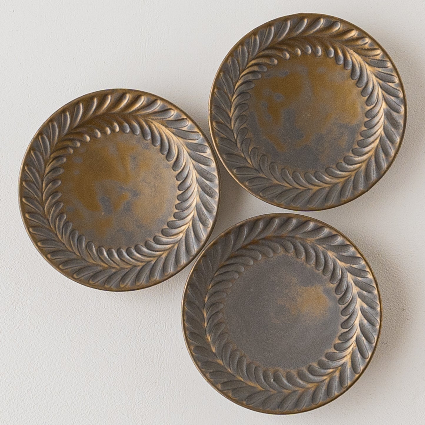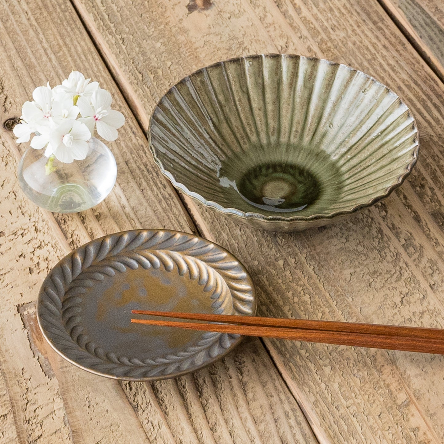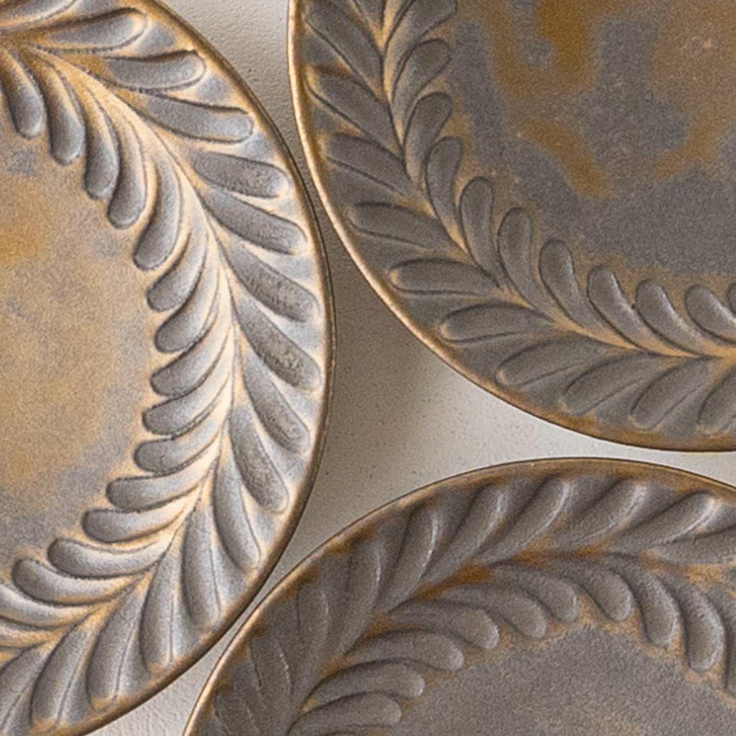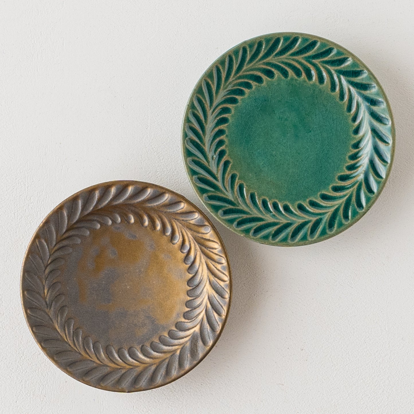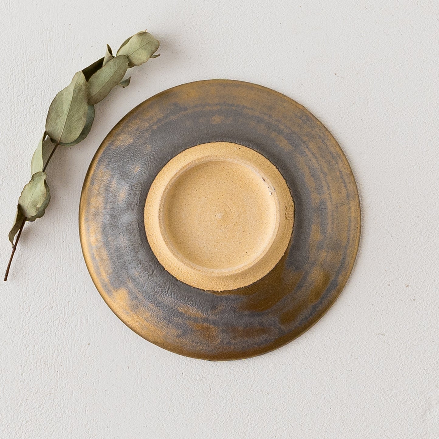 リムに流れるように施された葉っぱ模様。鈍く光る金色とマット調のブロンズの表情が美しいマンガン釉。釉薬が織りなす多彩な表情が葉紋模様を際立たせています。