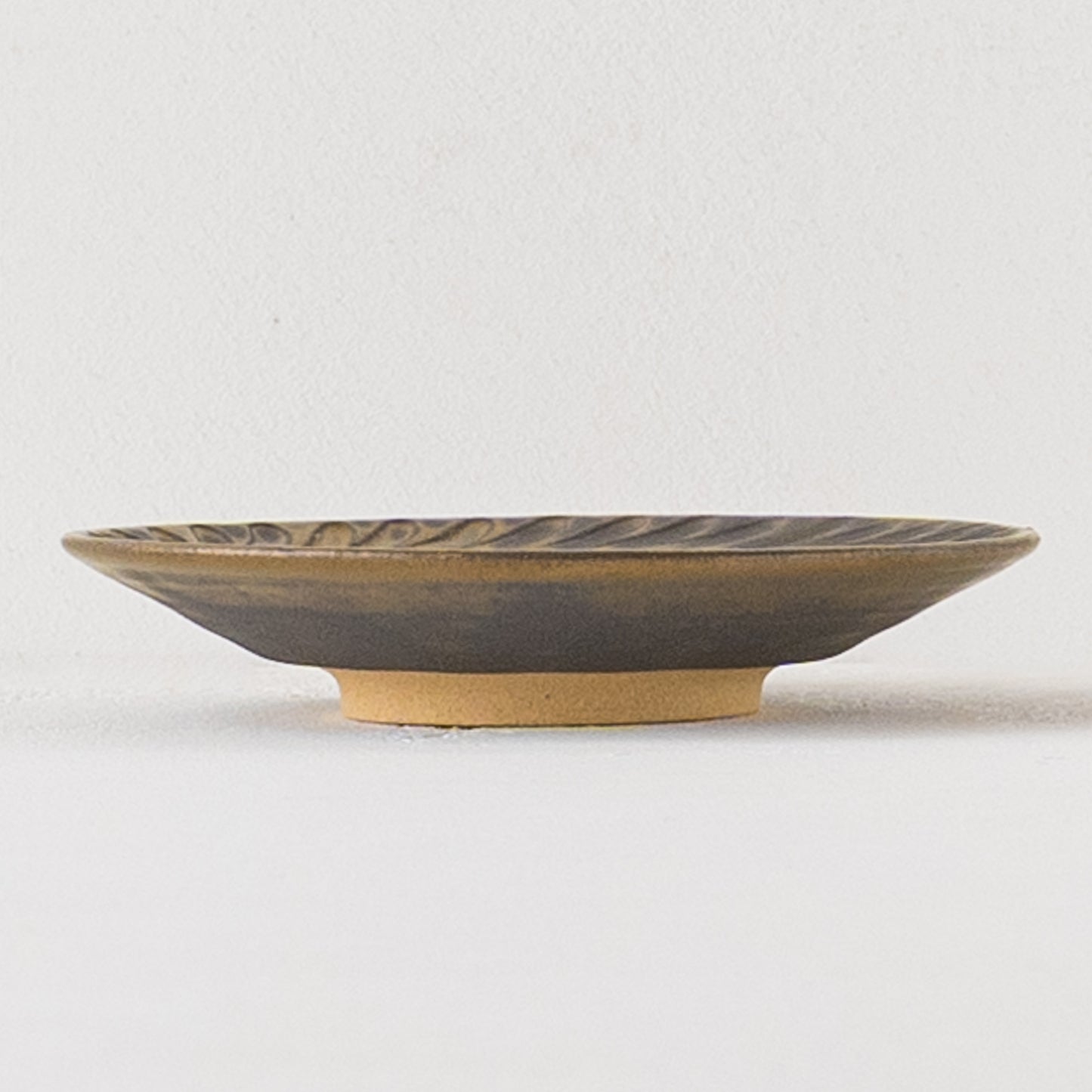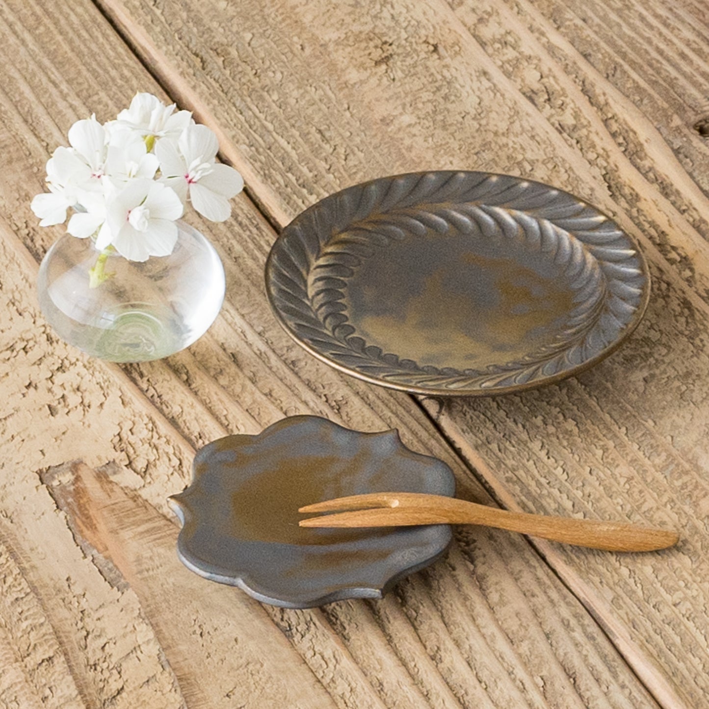 鈍く美しい輝きを放つ金属のような色調が魅力的なマンガン釉。シンプルでありながら存在感があり目を引く葉文様に重厚感あふれる発色に魅了されてしまいます。