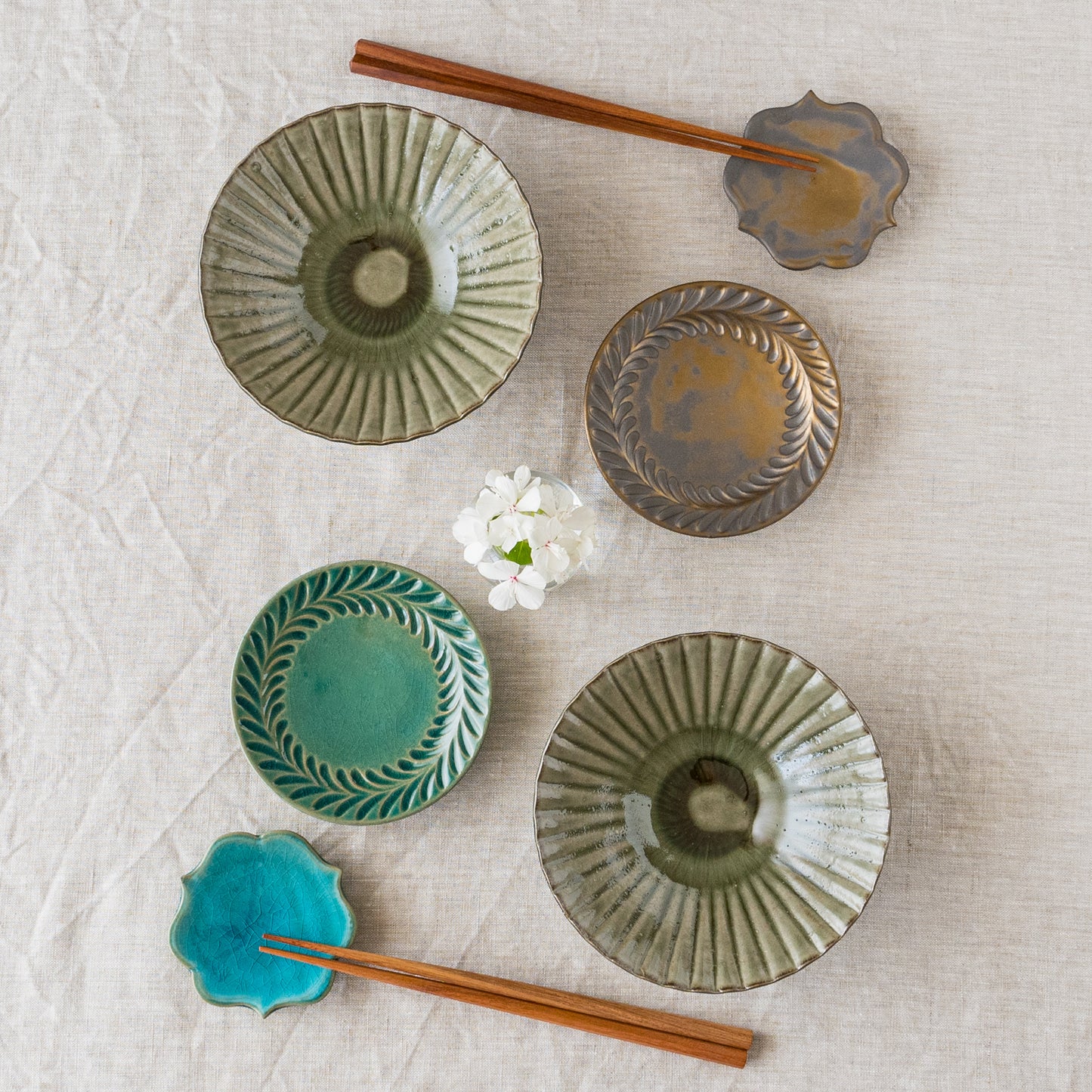 洗練された佇まいと和の趣を感じる表情を併せ持ったなんとも素敵なお皿。目を奪われる色味と葉紋模様がお料理を素敵に引き立ててくれます。
