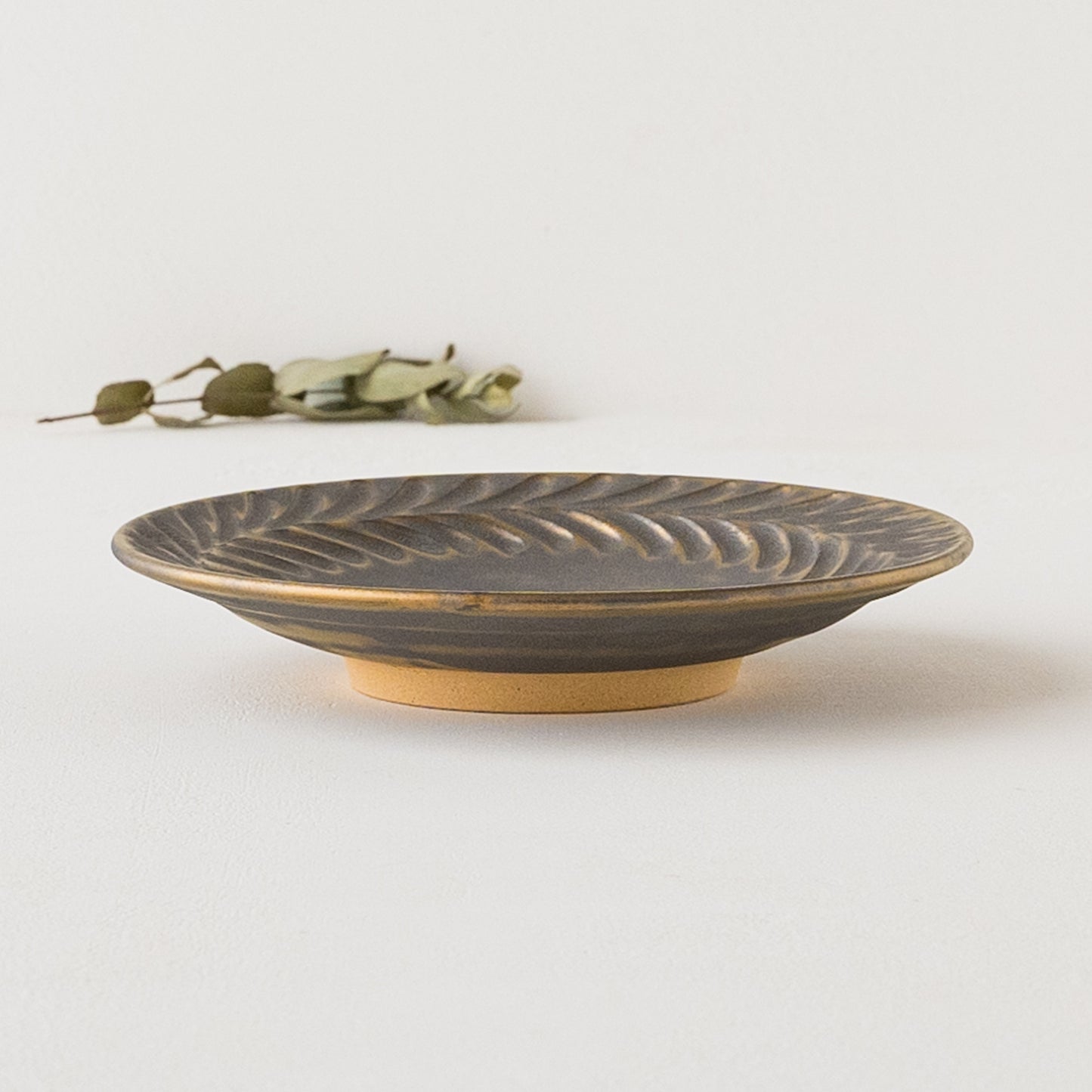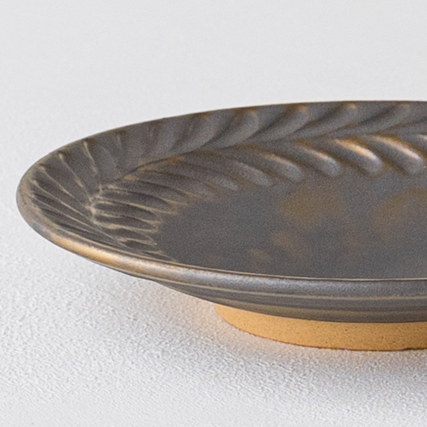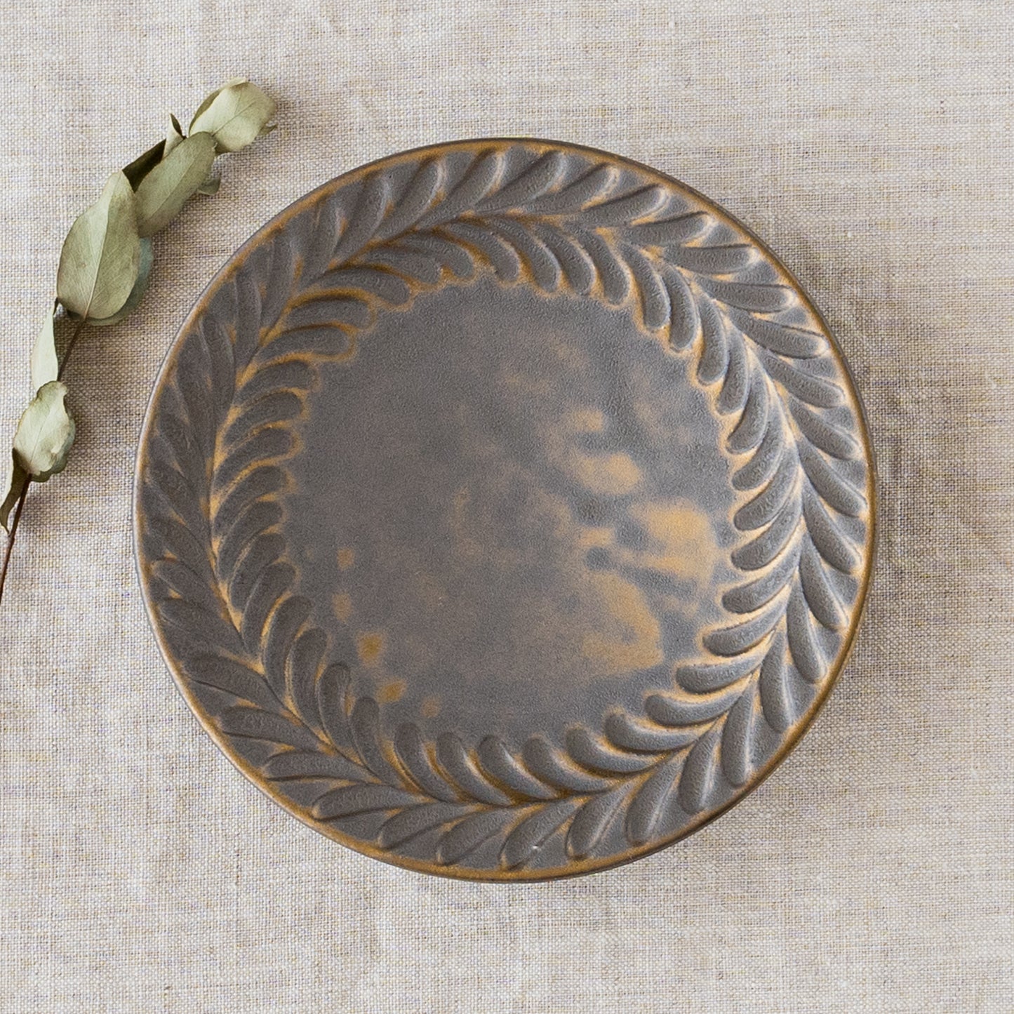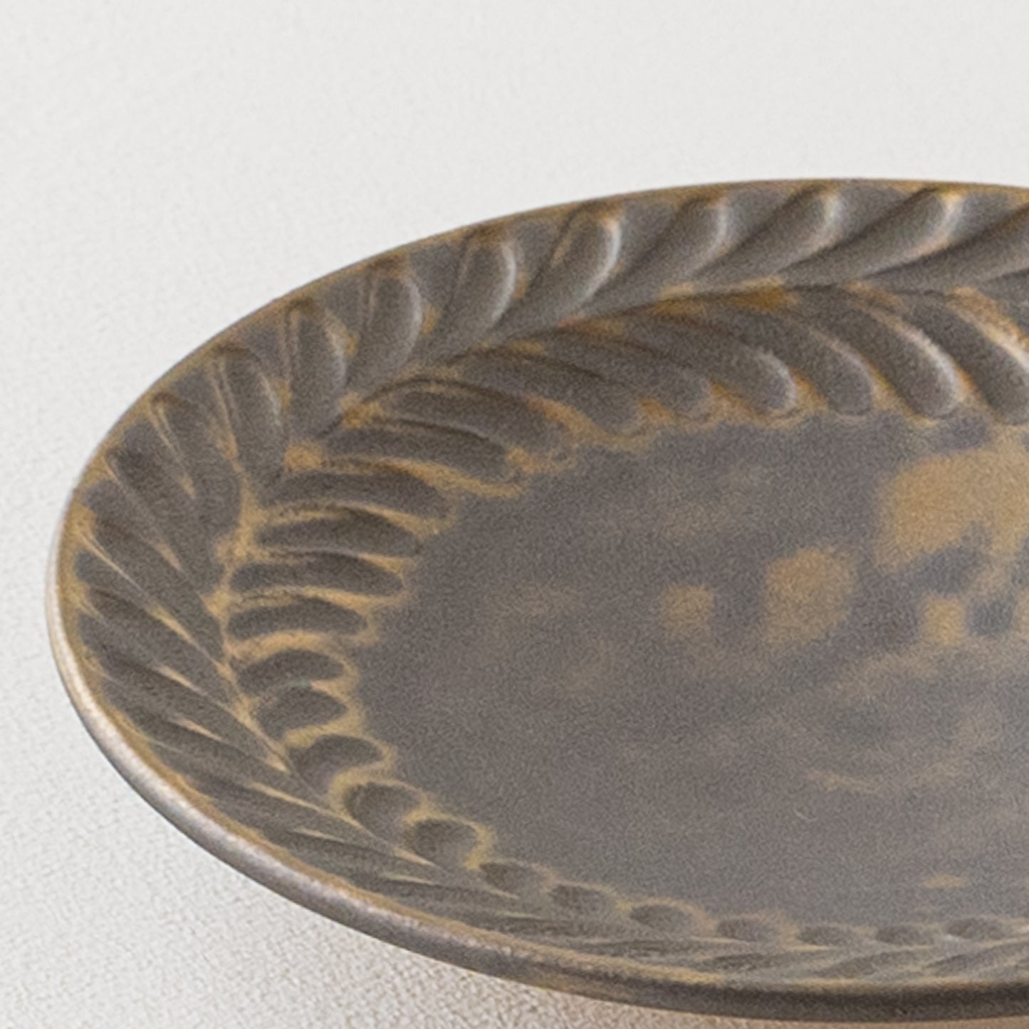 リムに流れるように施された葉っぱ模様。鈍く光る金色とマット調のブロンズの表情が美しいマンガン釉。釉薬が織りなす多彩な表情が葉紋模様を際立たせています。