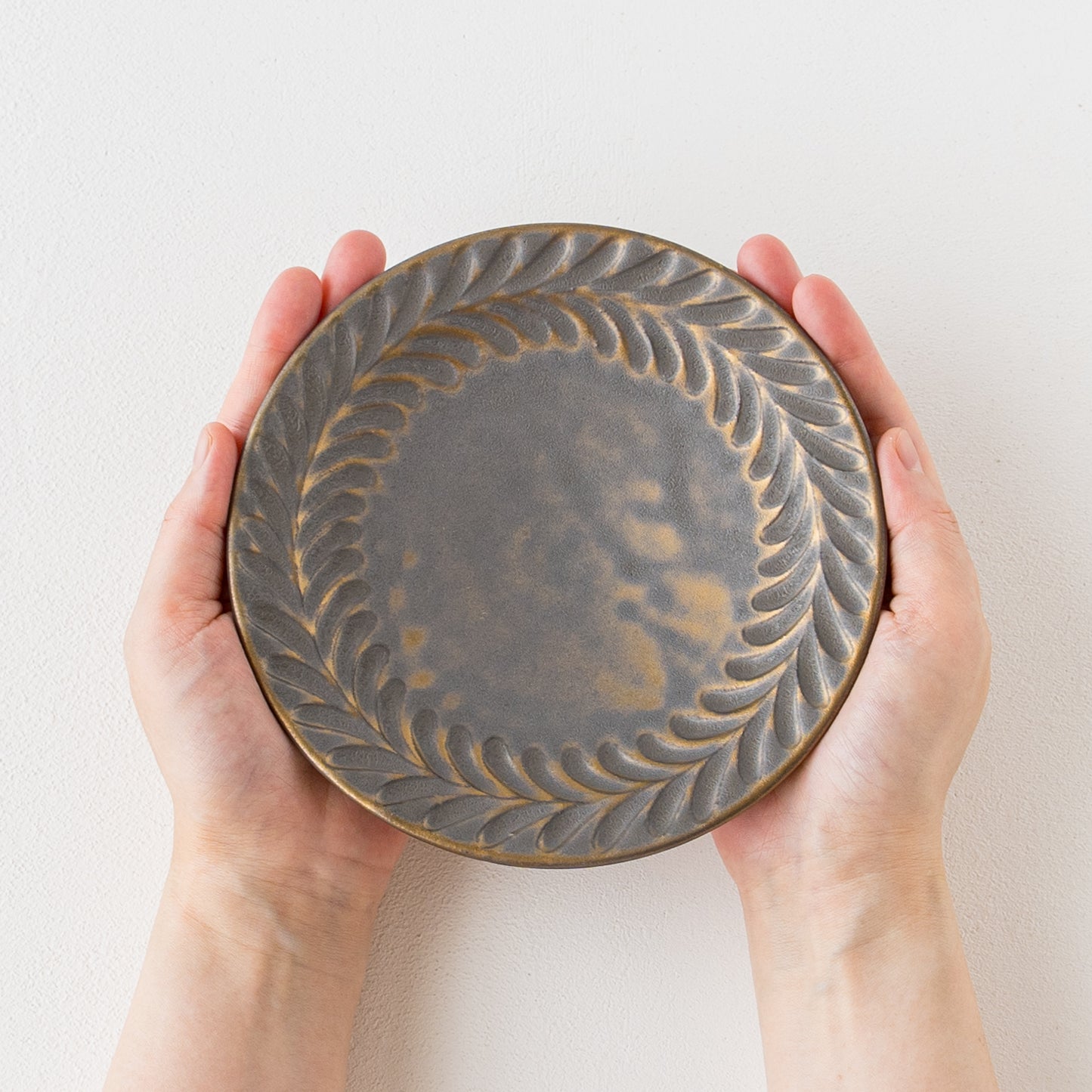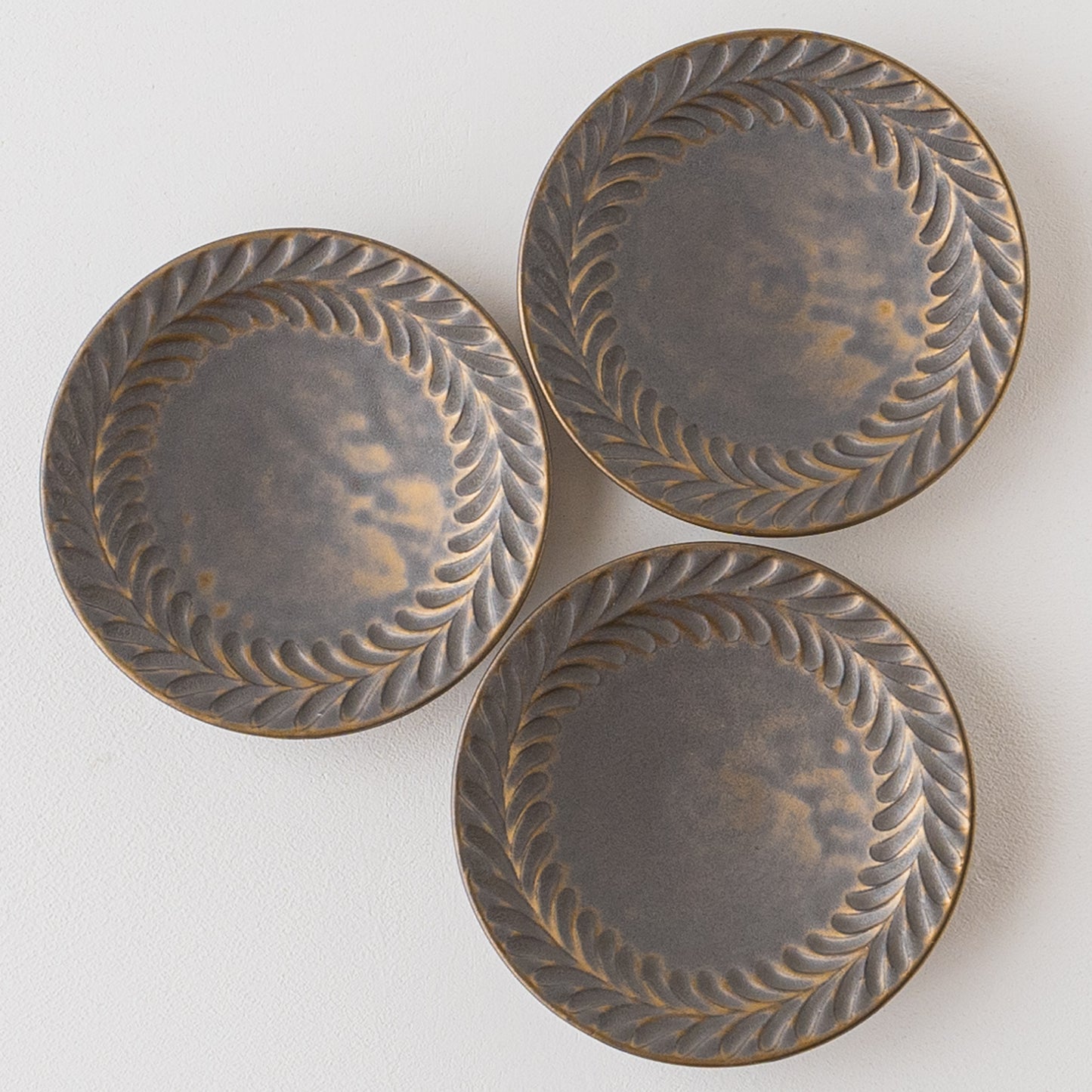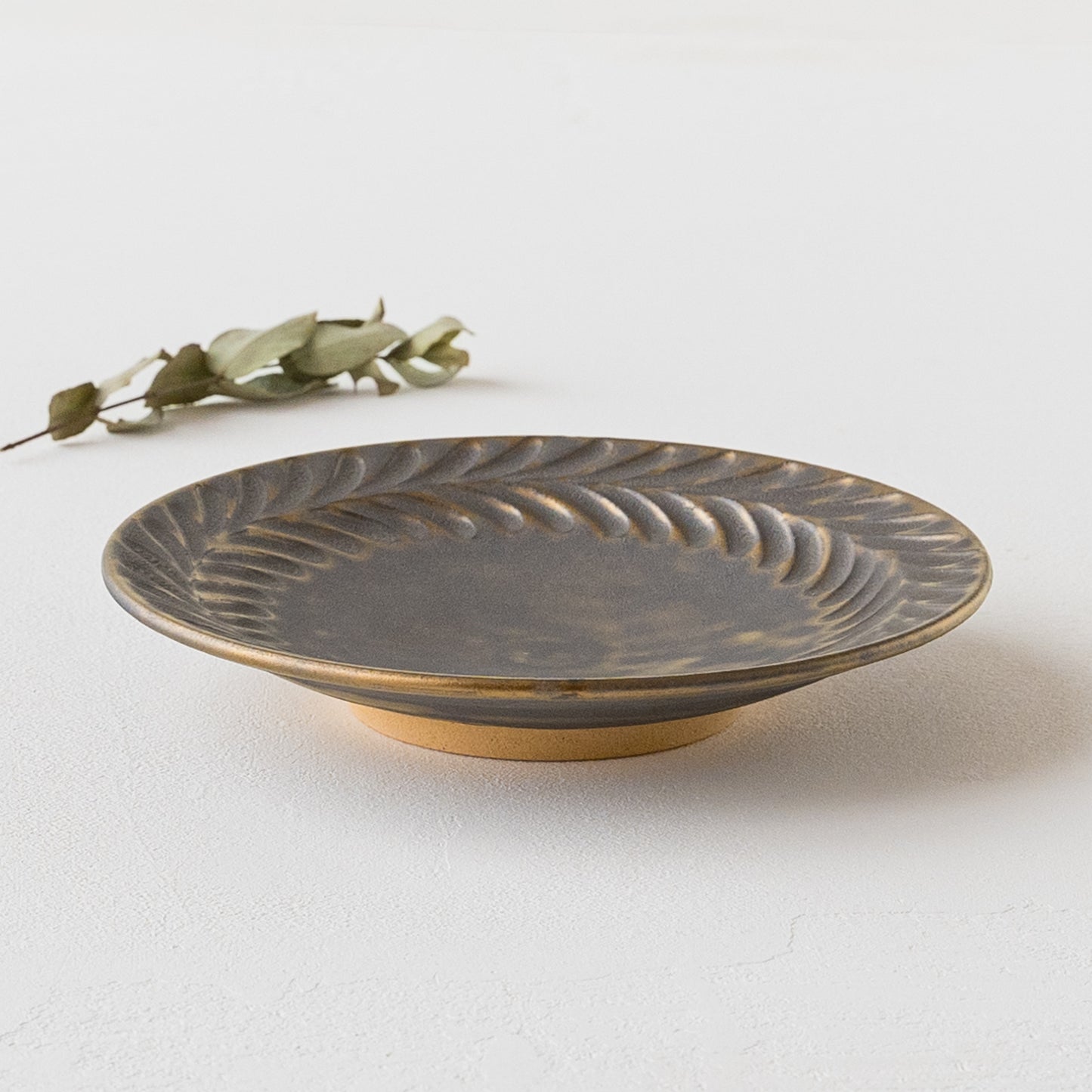 リムに流れるように施された葉っぱ模様。鈍く光る金色とマット調のブロンズの表情が美しいマンガン釉。釉薬が織りなす多彩な表情が葉紋模様を際立たせています。