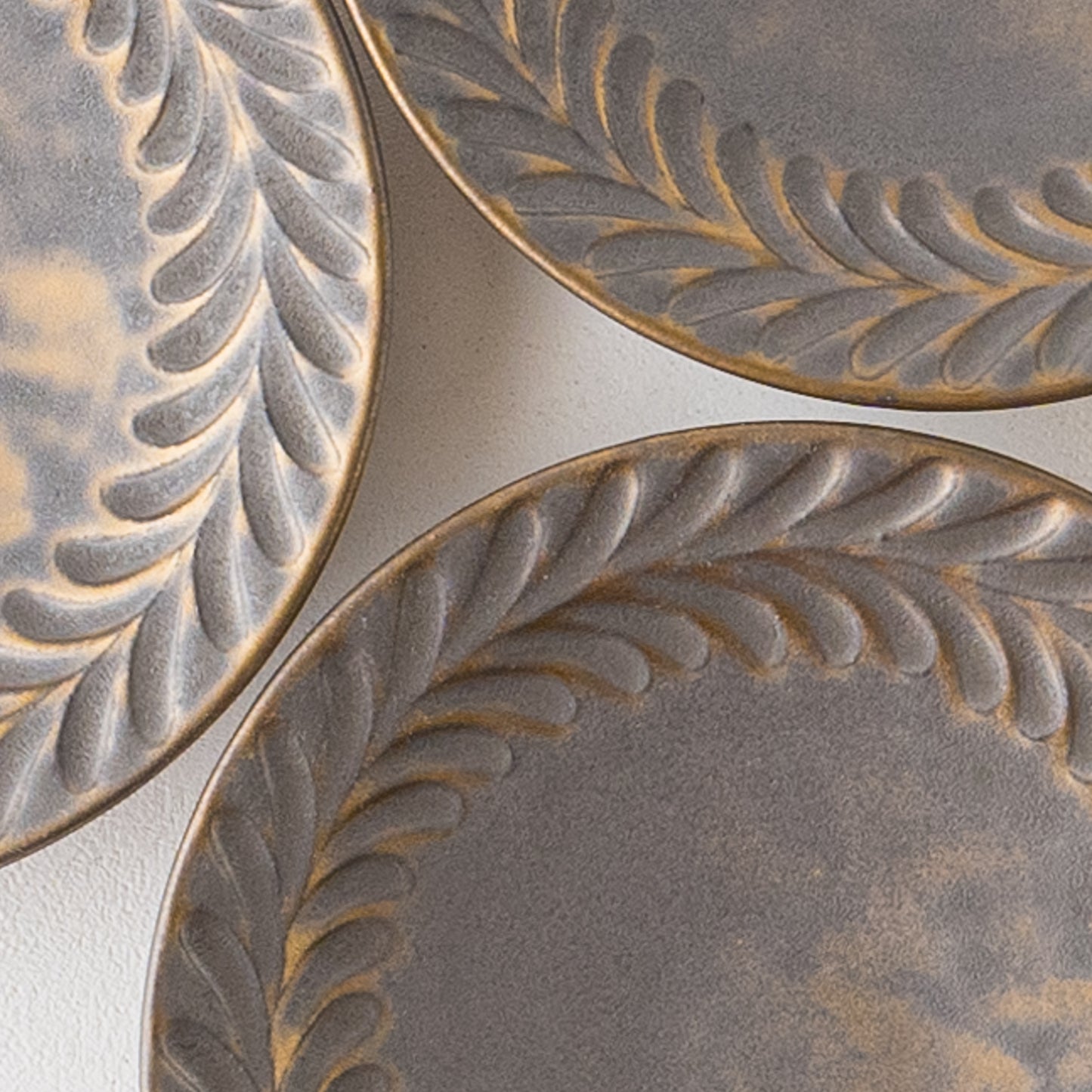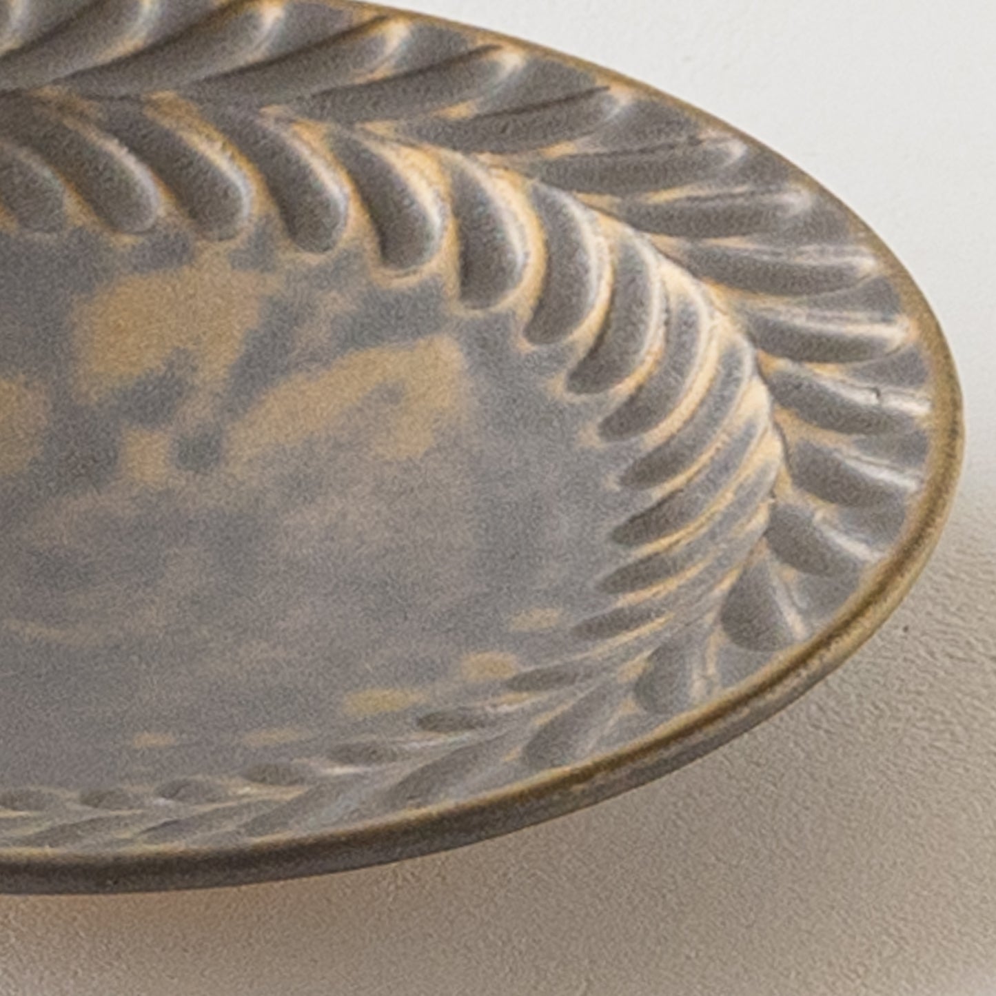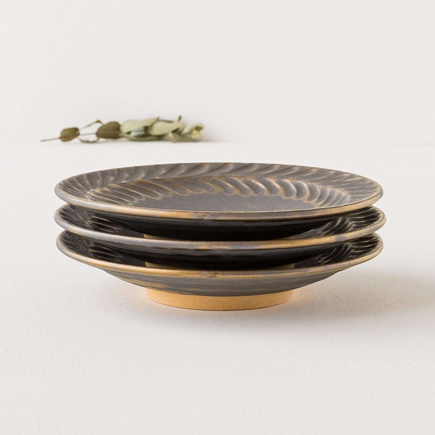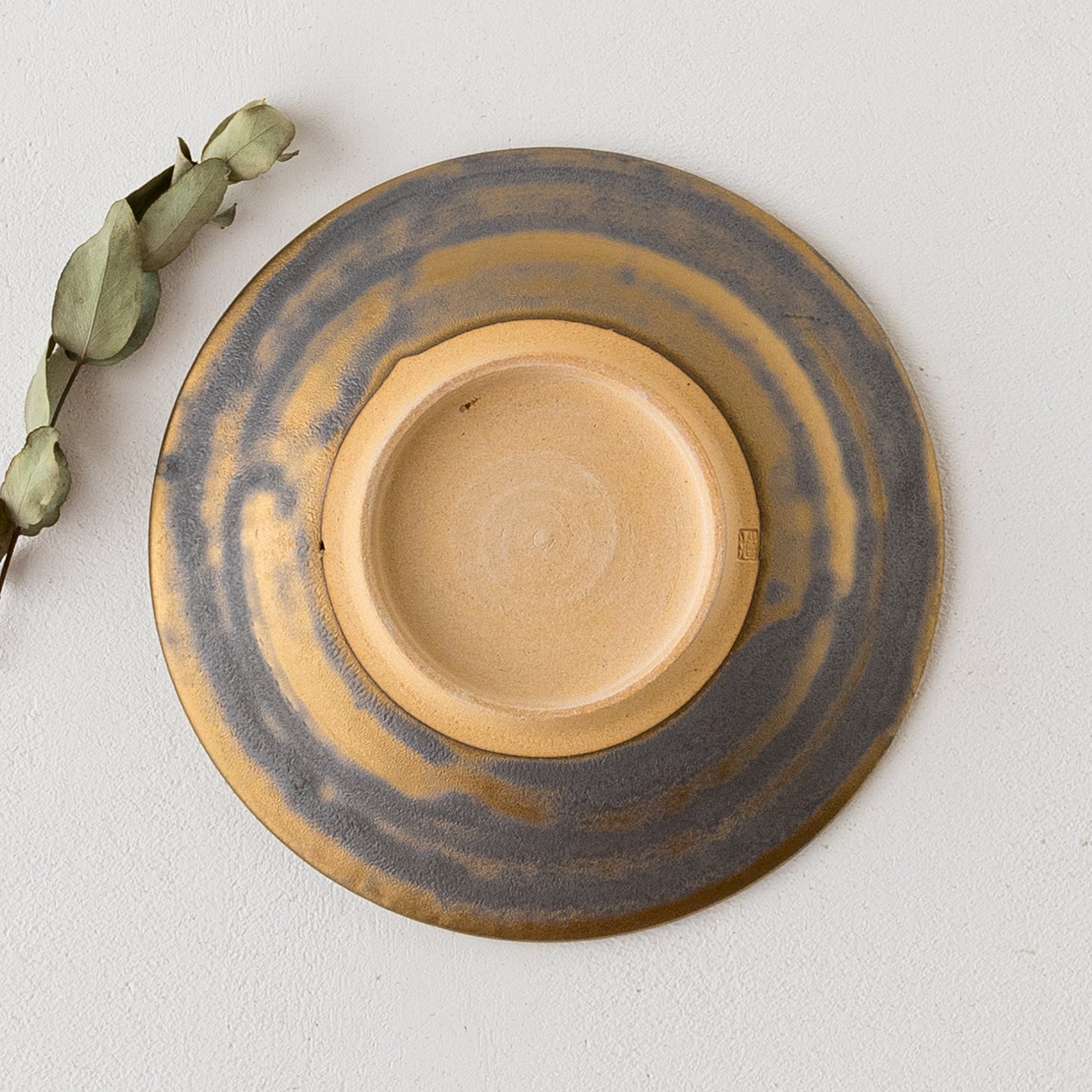 リムに流れるように施された葉っぱ模様。鈍く光る金色とマット調のブロンズの表情が美しいマンガン釉。釉薬が織りなす多彩な表情が葉紋模様を際立たせています。