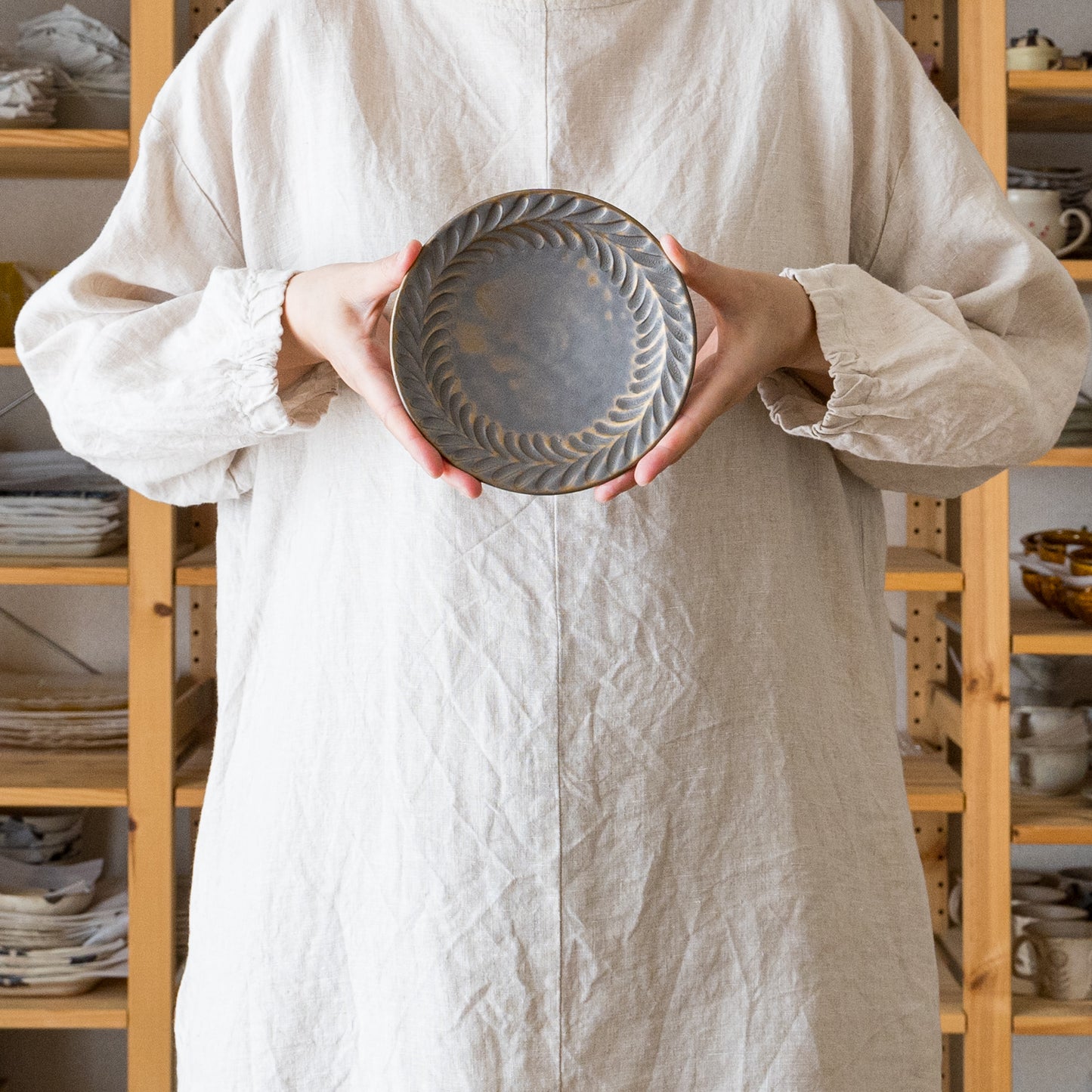 洗練された佇まいと和の趣を感じる表情を併せ持ったなんとも素敵なお皿。目を奪われる色味と葉紋模様がお料理を素敵に引き立ててくれます。