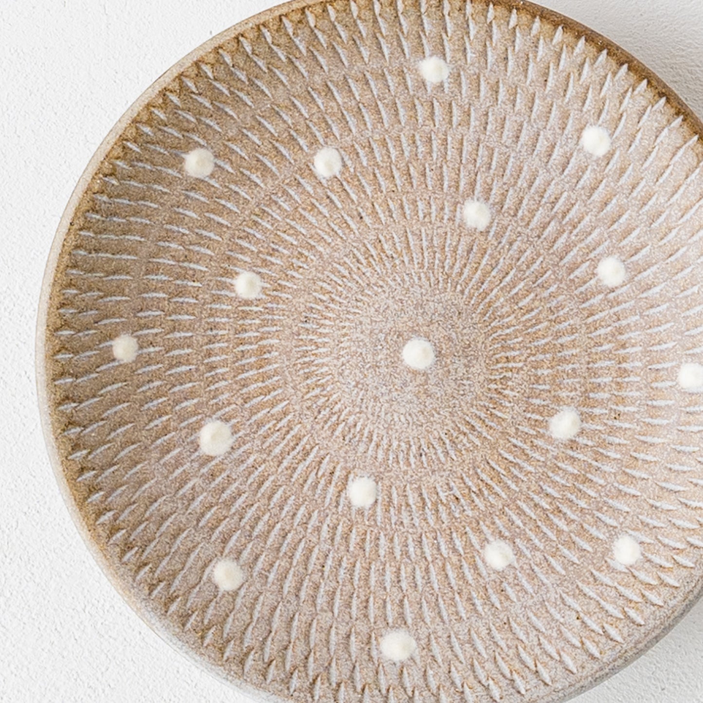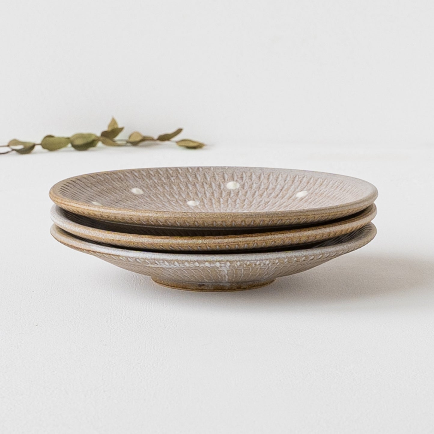 小石原の山で採れる良質な土と藁や木など灰、長石などの天然原料を独自で配合した釉薬でつくられるうつわ。白化粧土で施されたかわいいドット。落ち着いたグレーに雪が舞い降りたような優し気な白が素敵にマッチしています。