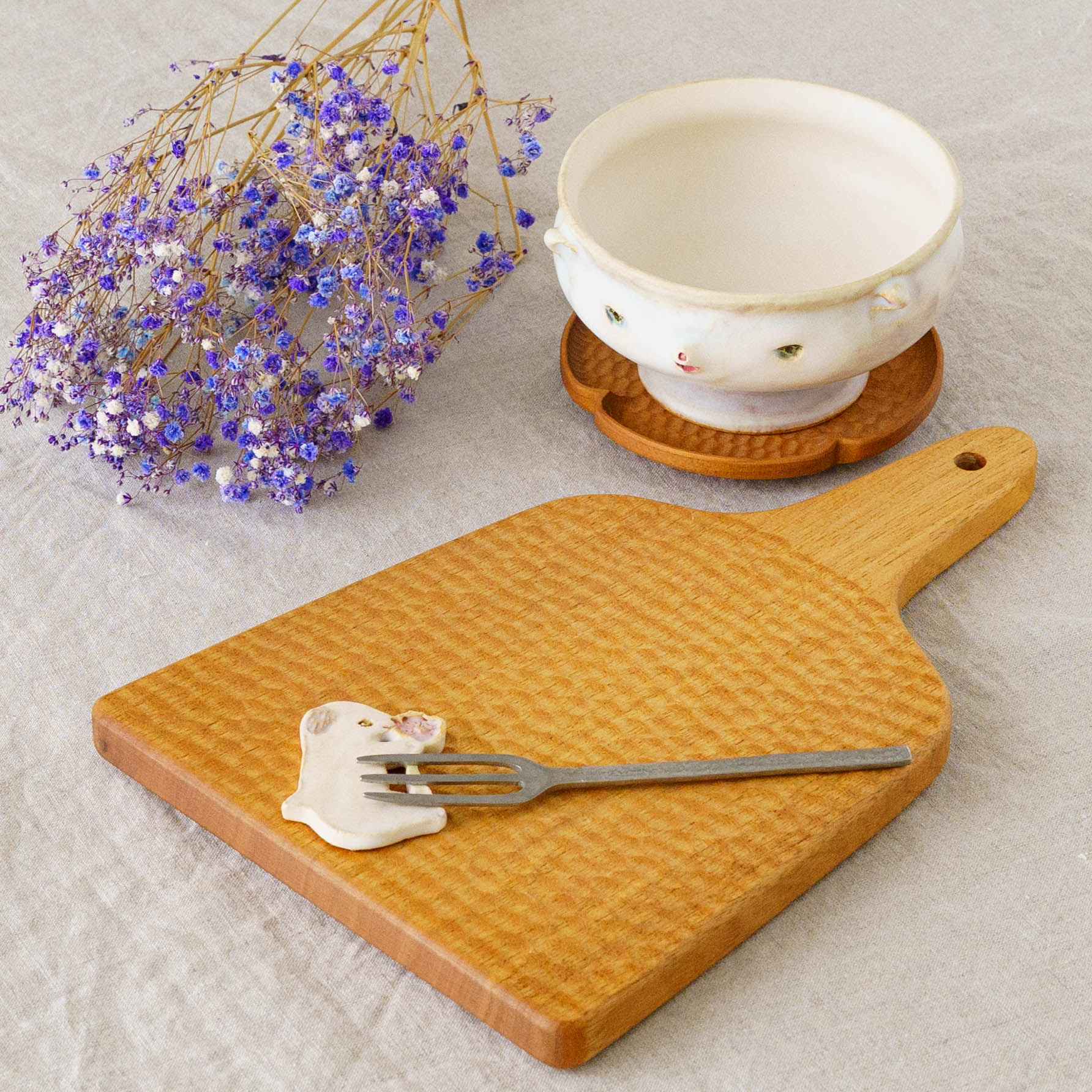 いつも見えるわけではない、どこかで息づいていそうな小さないきものたち。思わず話しかけたくなるような愛らしさがうつわやオブジェのかたちに宿り、ふんわりとした空気感とともに不思議な世界へ静かに誘ってくれます。