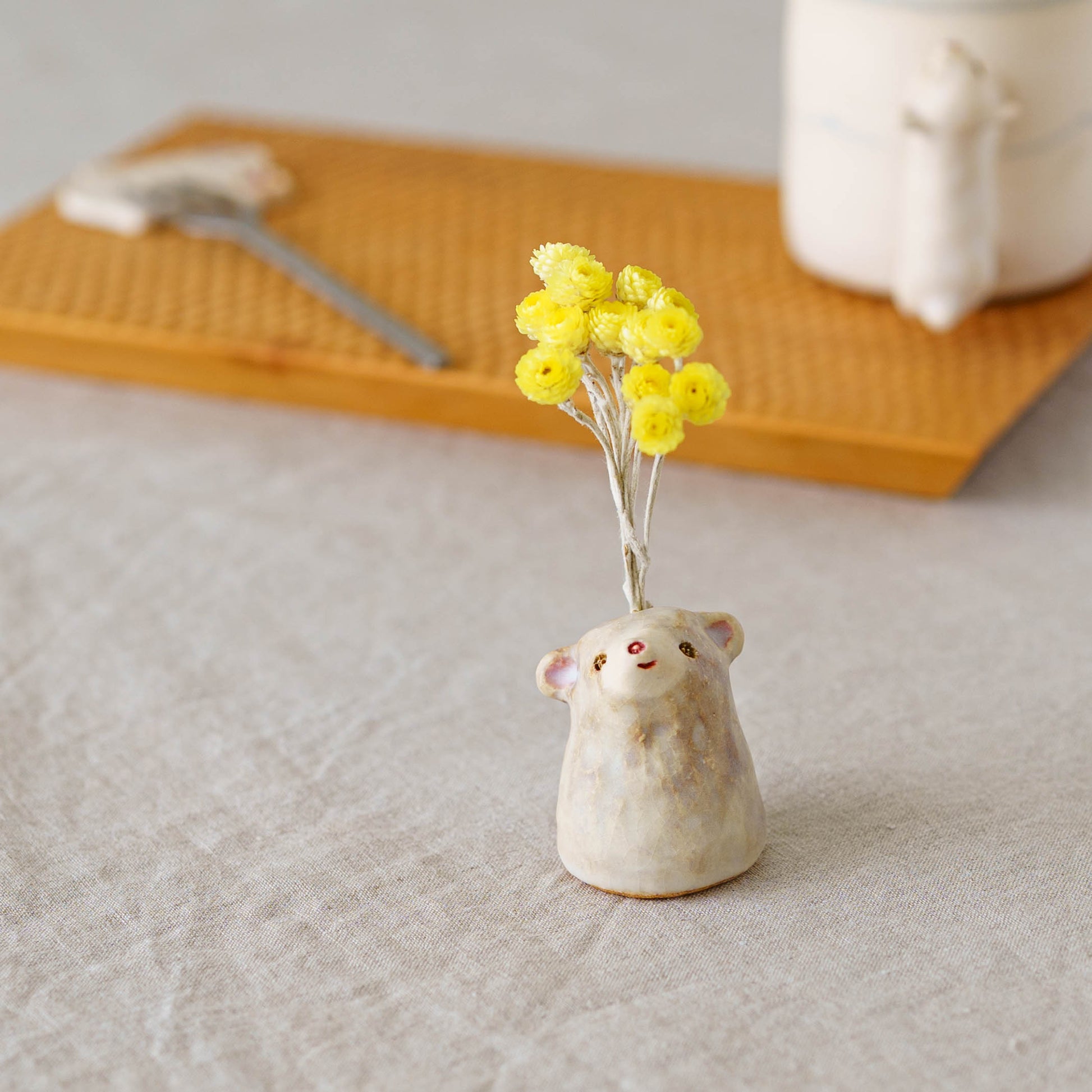 いつも見えるわけではない、どこかで息づいていそうな小さないきものたち。思わず話しかけたくなるような愛らしさがうつわやオブジェのかたちに宿り、ふんわりとした空気感とともに不思議な世界へ静かに誘ってくれます。