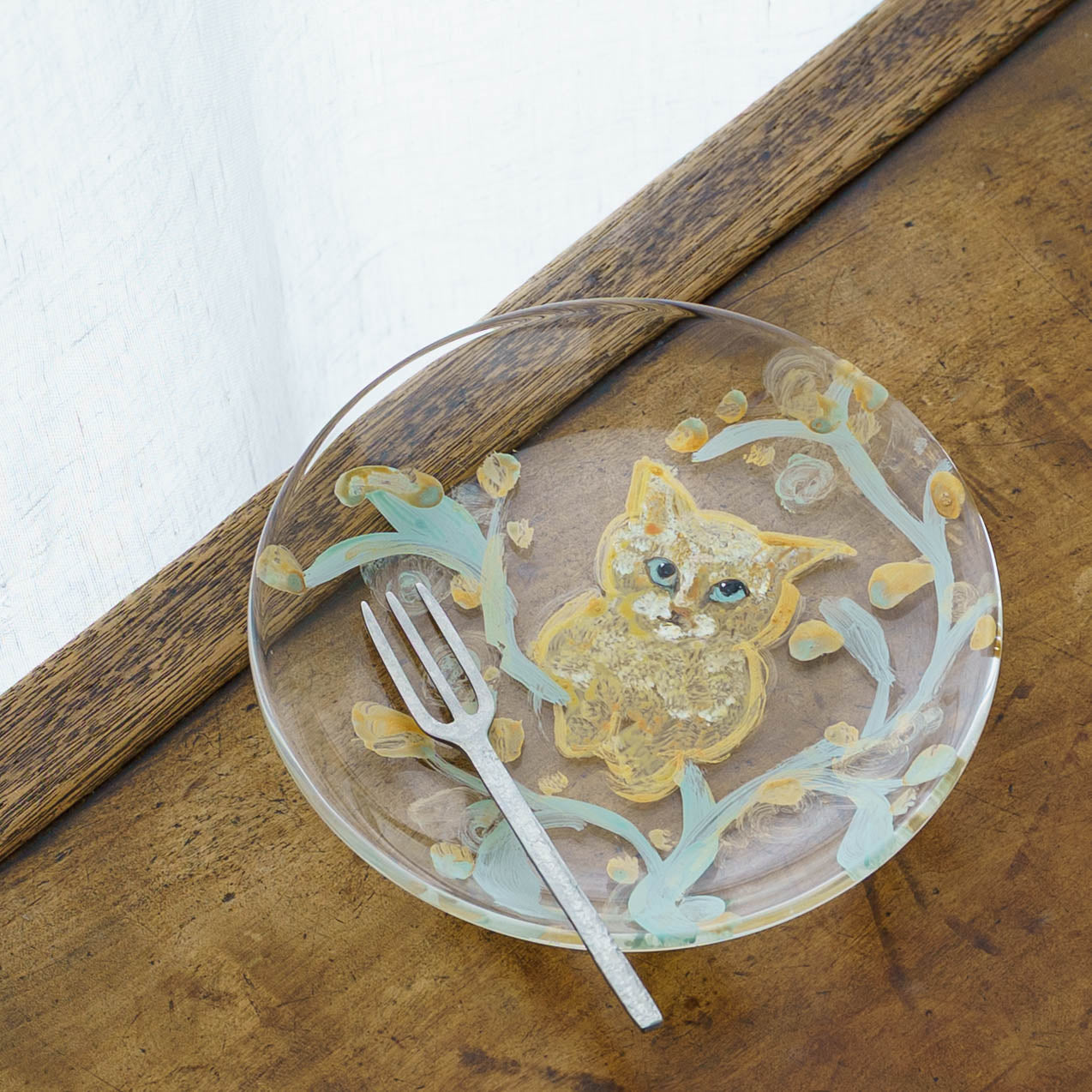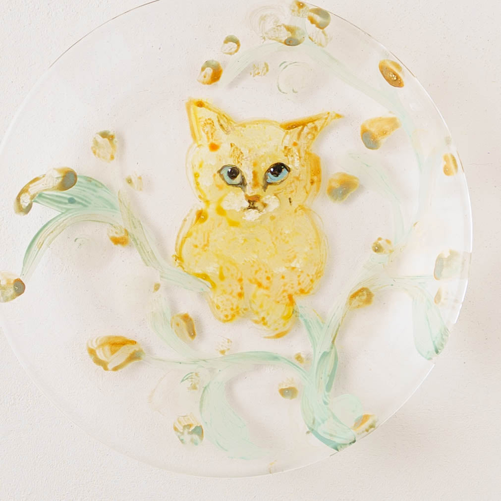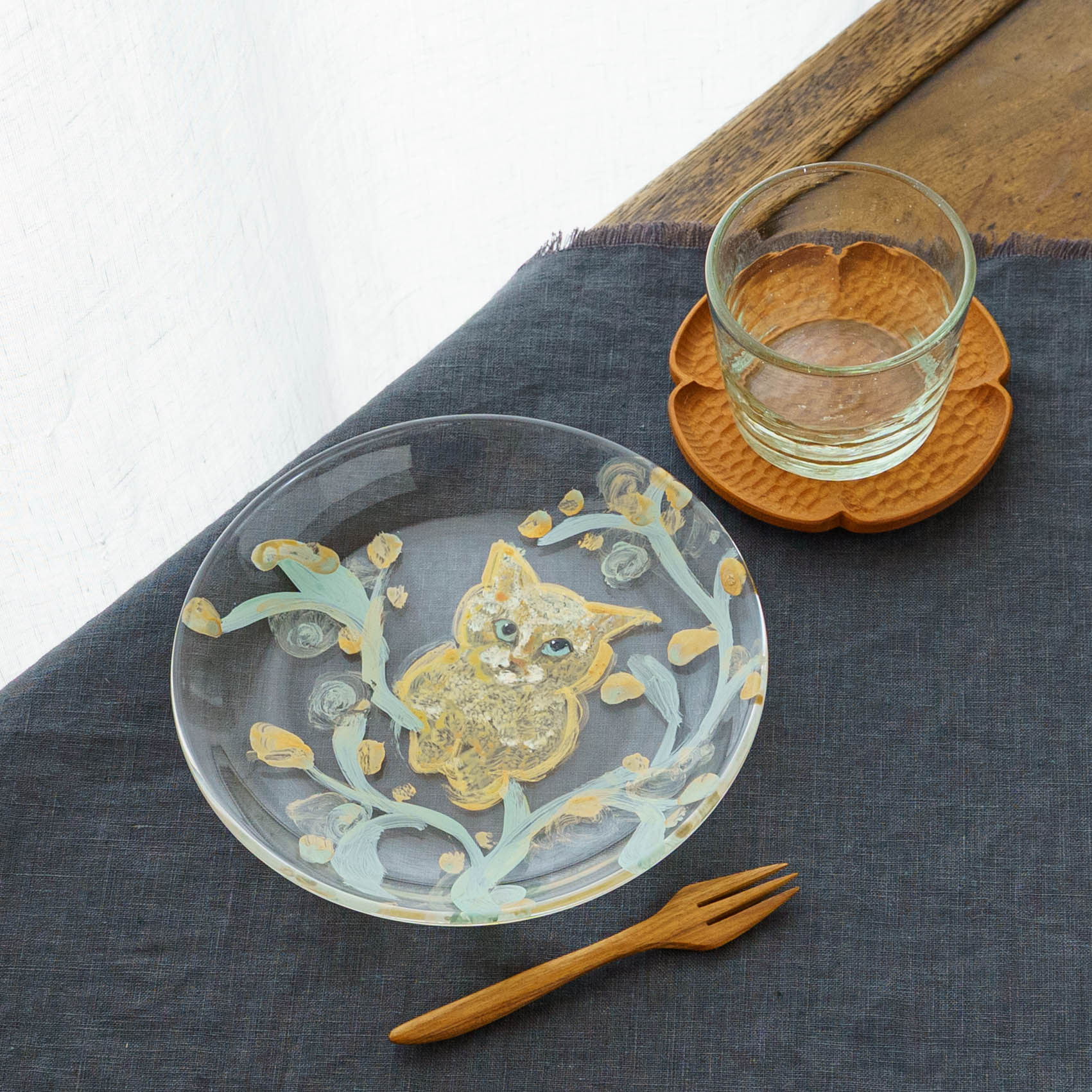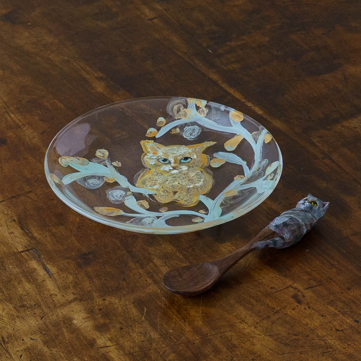 表情豊かな木彫りの猫から、のびやかな猫のポーズやふわふわの毛並みが軽やかに描かれたうつわやガラスへの絵付け。木彫りと絵付け、行き来する制作の中で、互いに刺激を受けながら猫の世界は少しずつ広がっています。