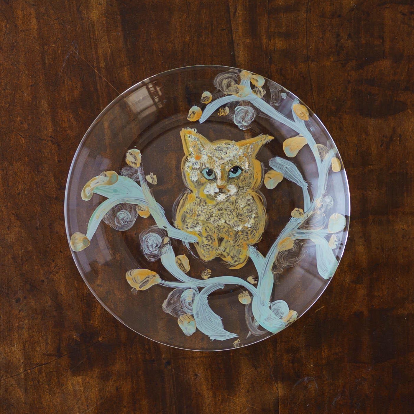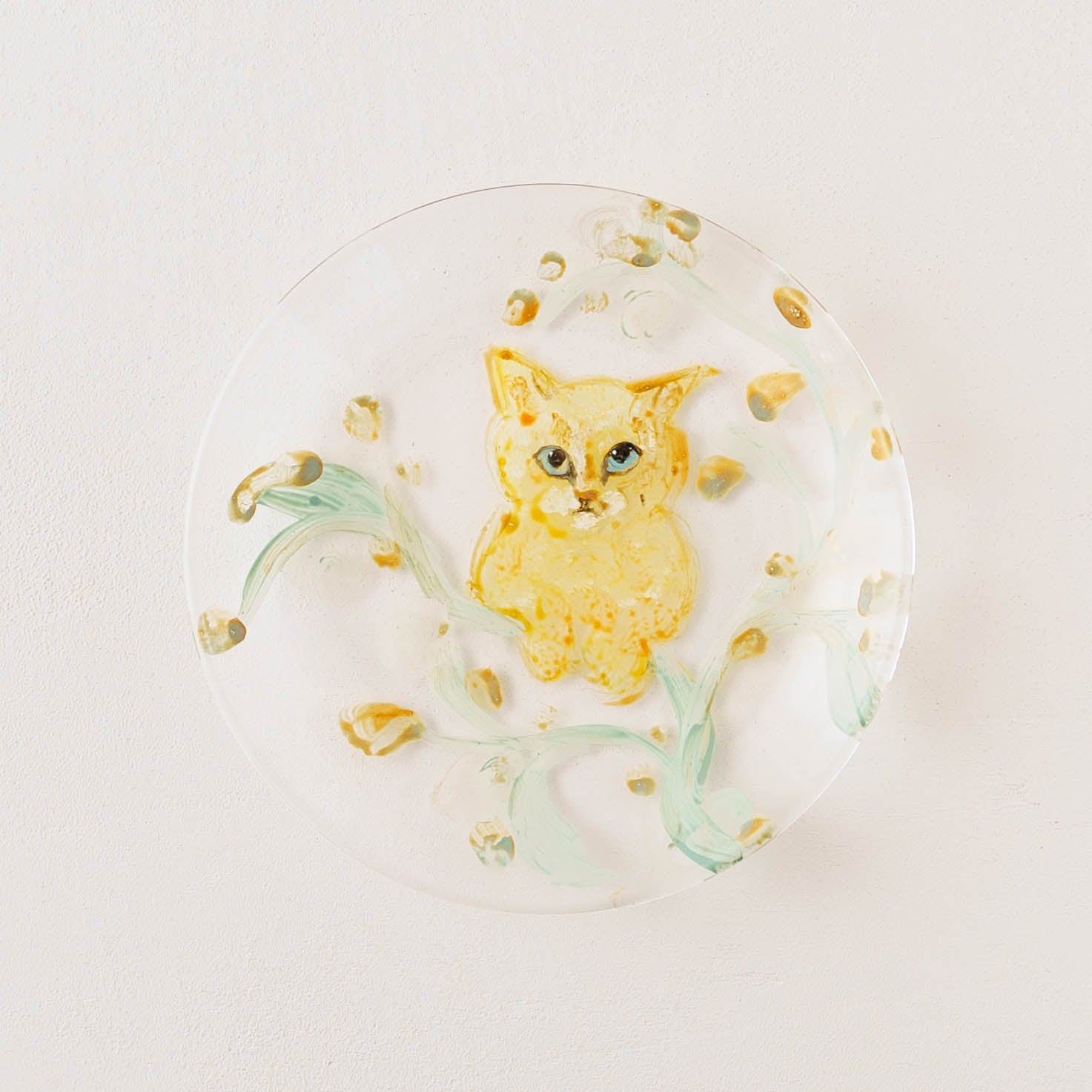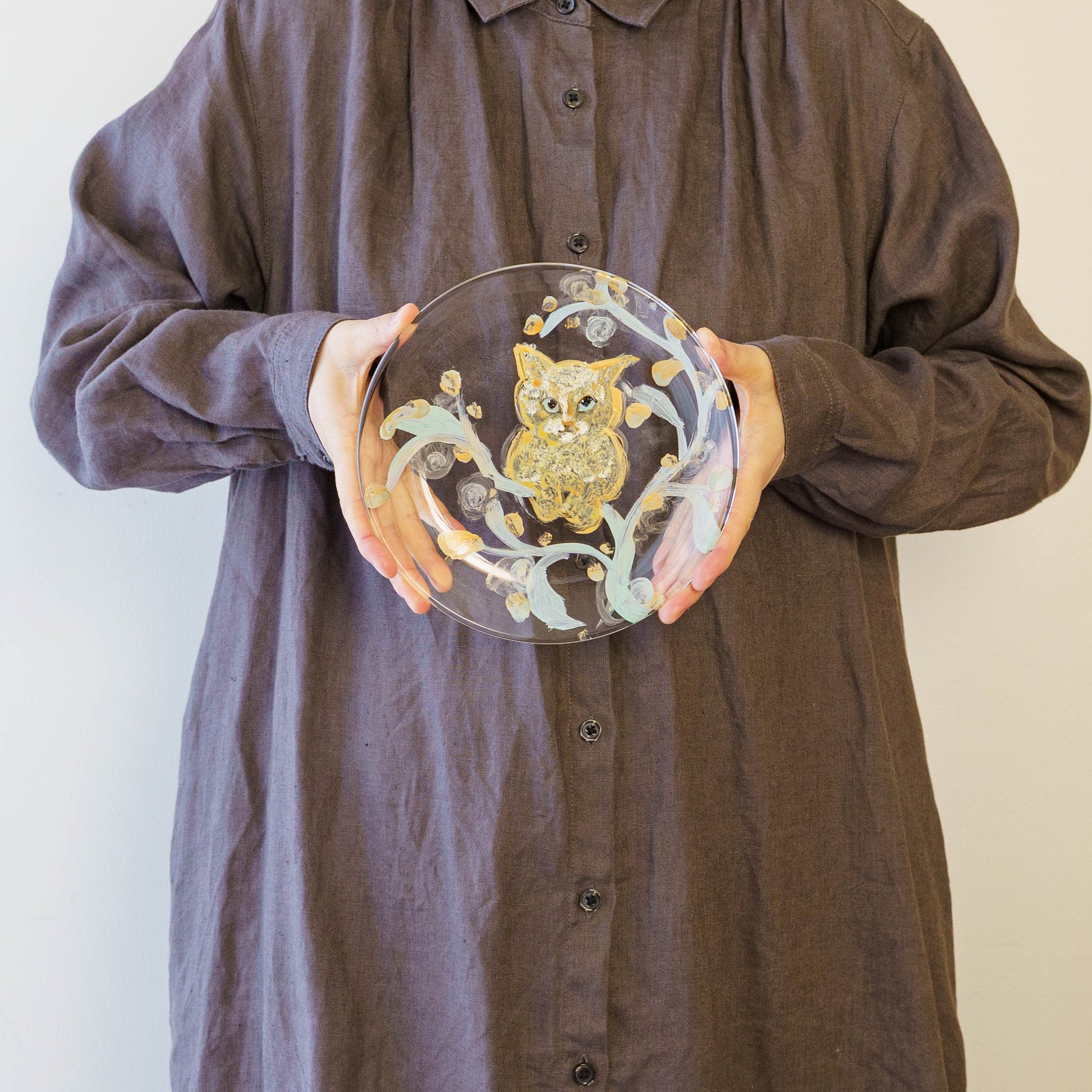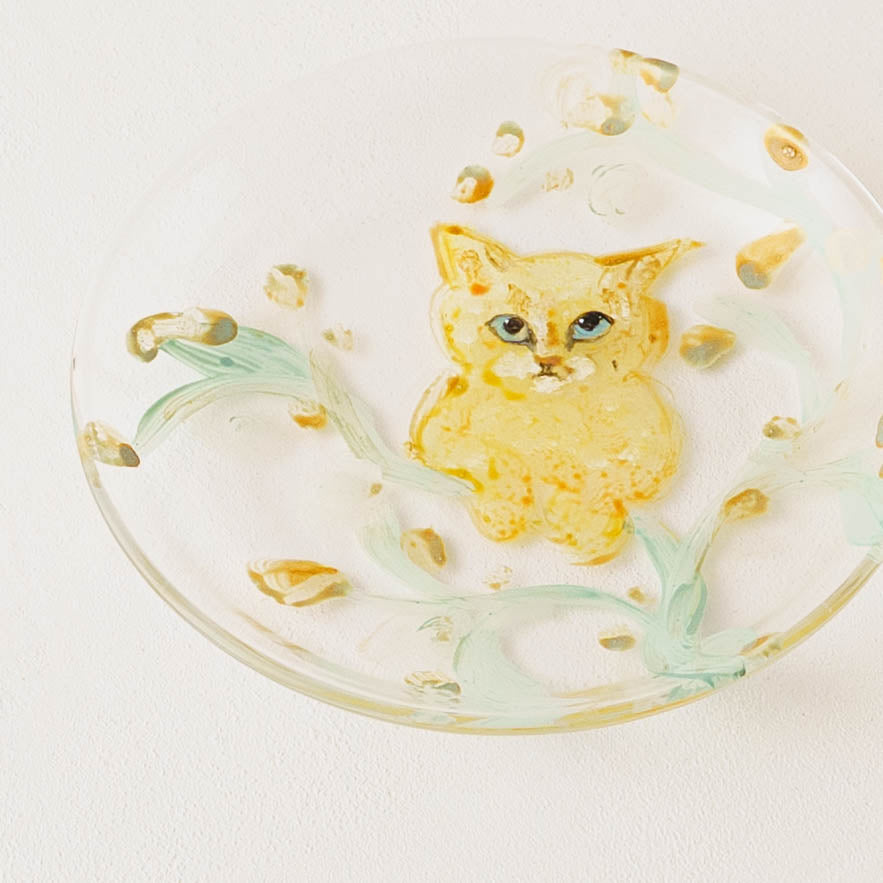表情豊かな木彫りの猫から、のびやかな猫のポーズやふわふわの毛並みが軽やかに描かれたうつわやガラスへの絵付け。木彫りと絵付け、行き来する制作の中で、互いに刺激を受けながら猫の世界は少しずつ広がっています。