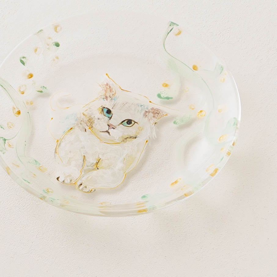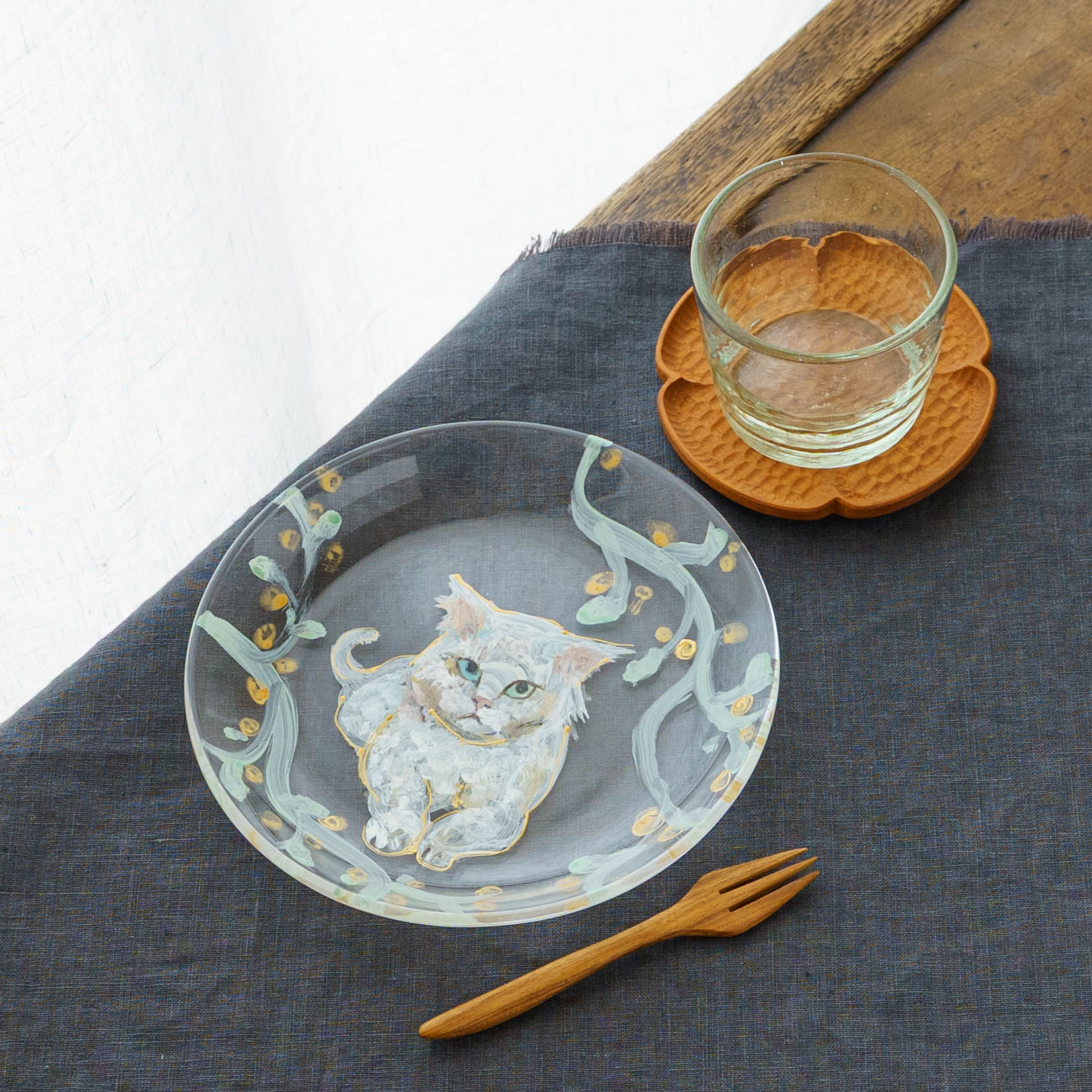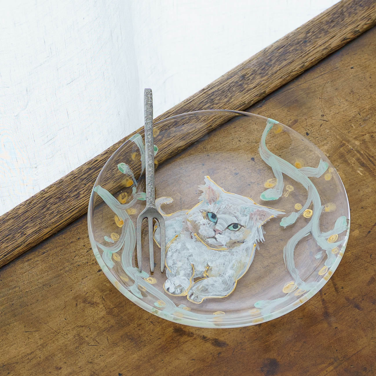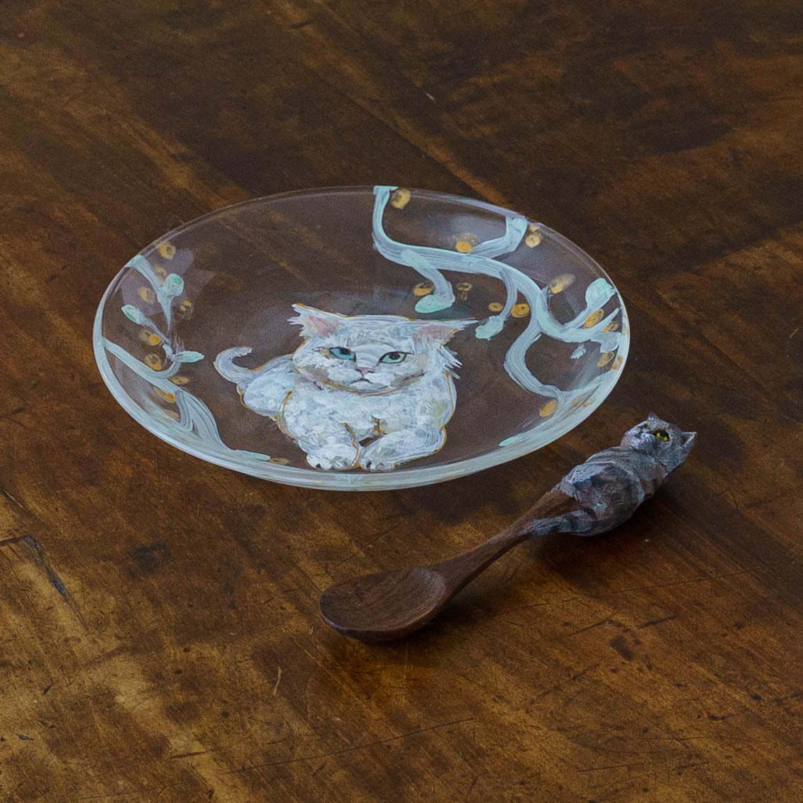 表情豊かな木彫りの猫から、のびやかな猫のポーズやふわふわの毛並みが軽やかに描かれたうつわやガラスへの絵付け。木彫りと絵付け、行き来する制作の中で、互いに刺激を受けながら猫の世界は少しずつ広がっています。