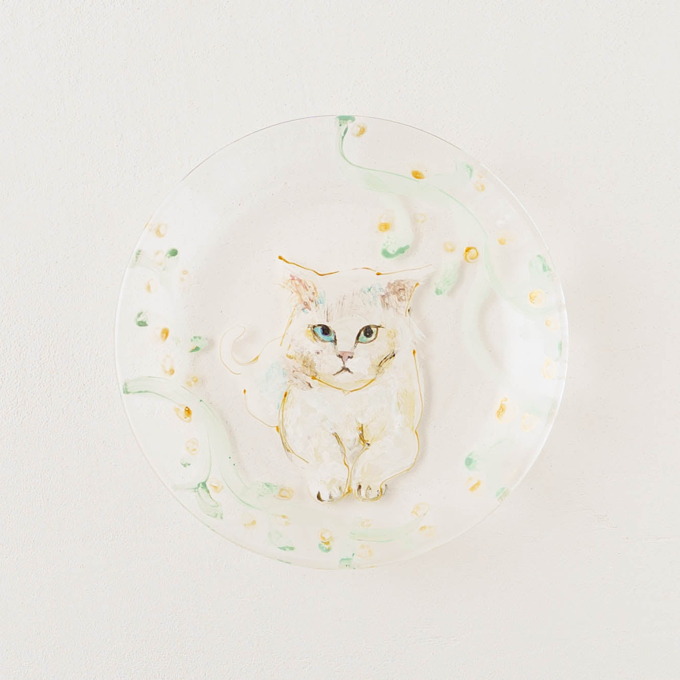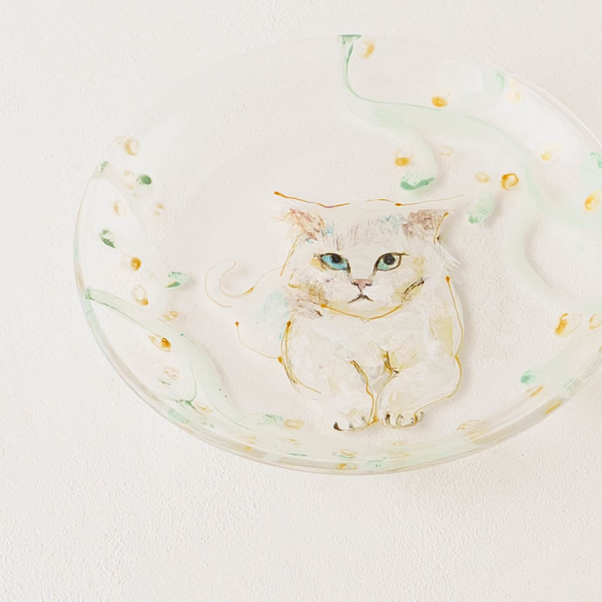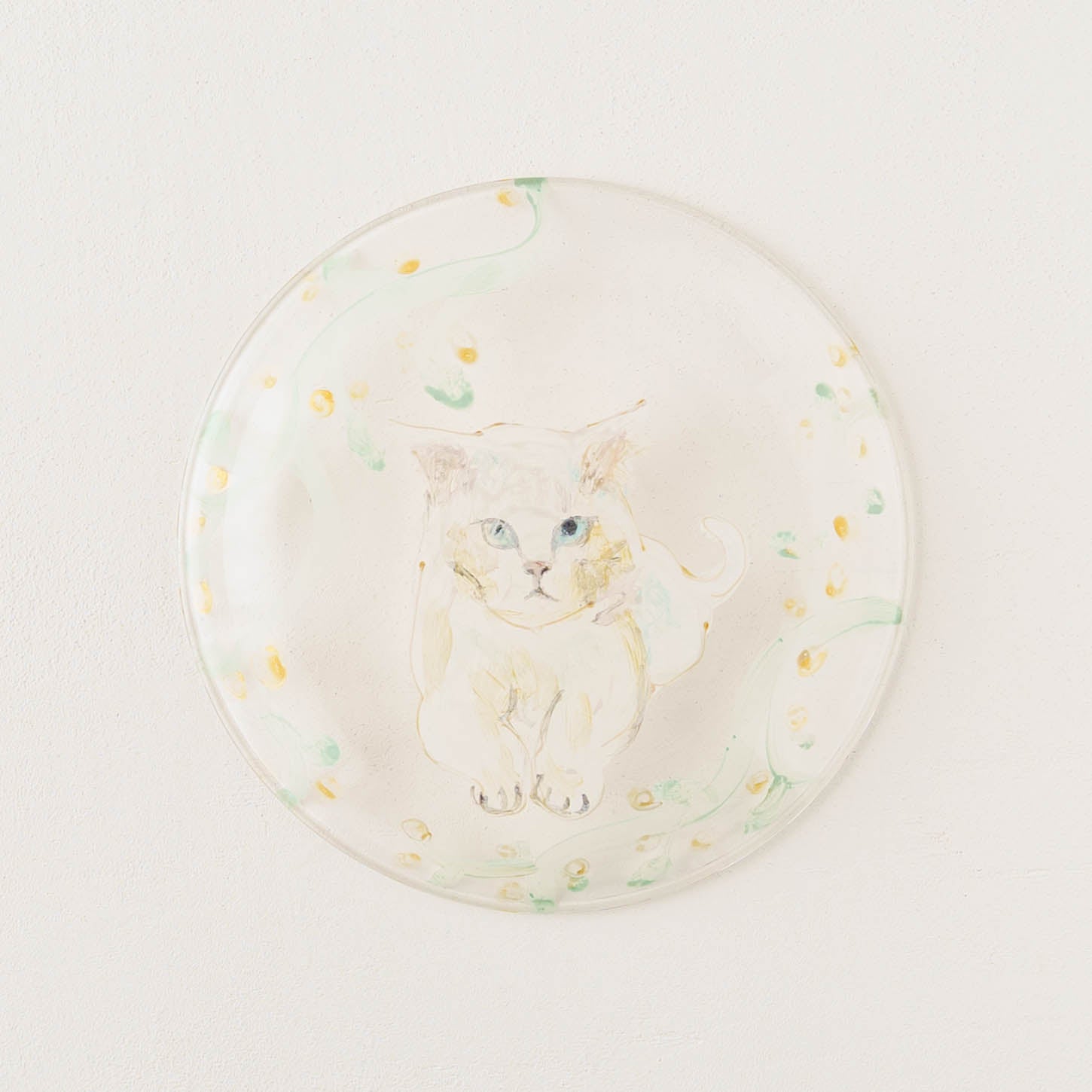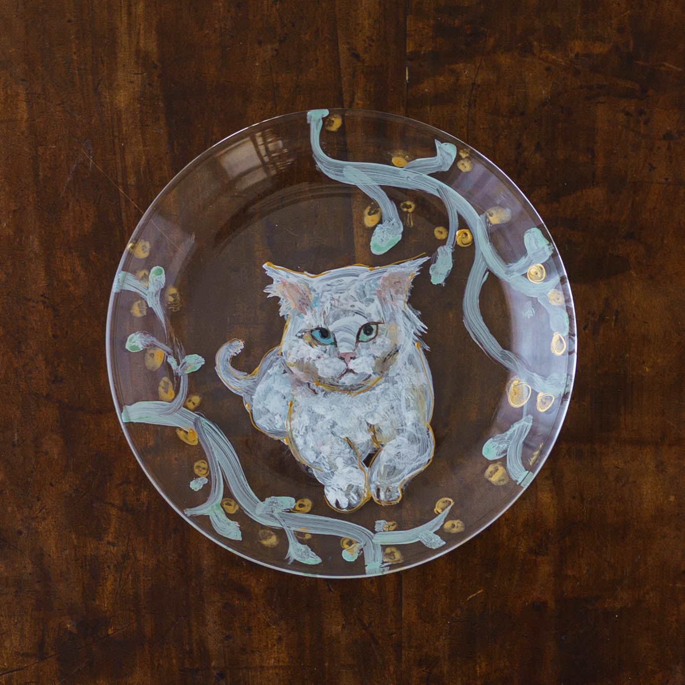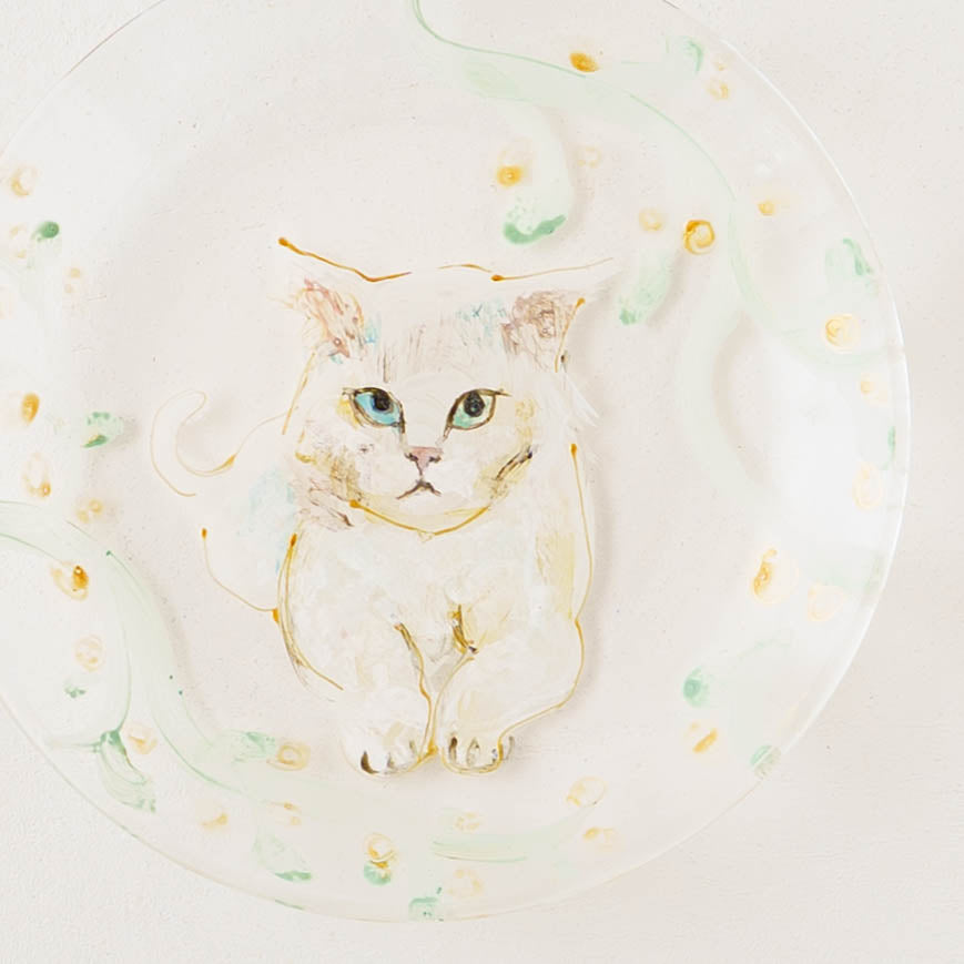 表情豊かな木彫りの猫から、のびやかな猫のポーズやふわふわの毛並みが軽やかに描かれたうつわやガラスへの絵付け。木彫りと絵付け、行き来する制作の中で、互いに刺激を受けながら猫の世界は少しずつ広がっています。