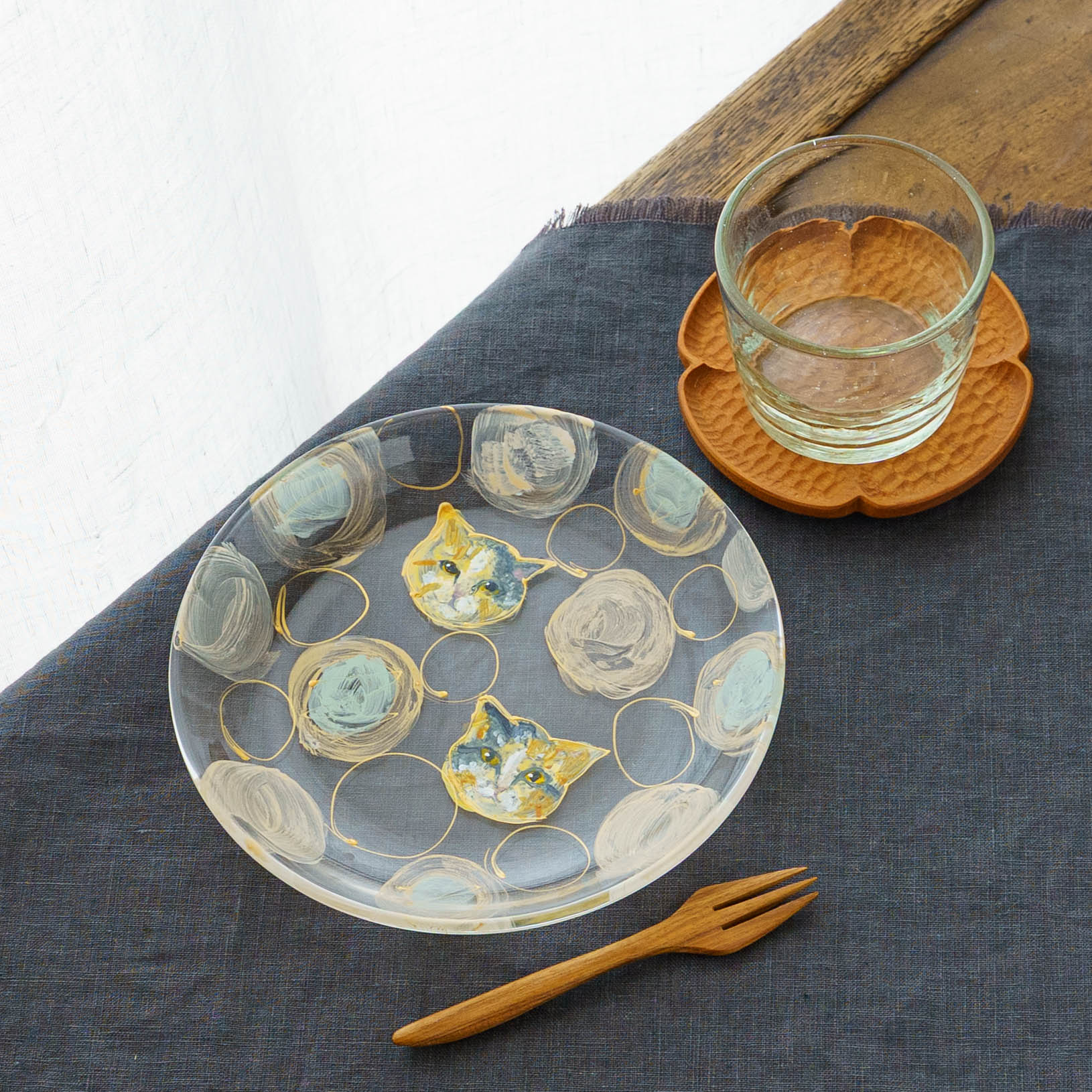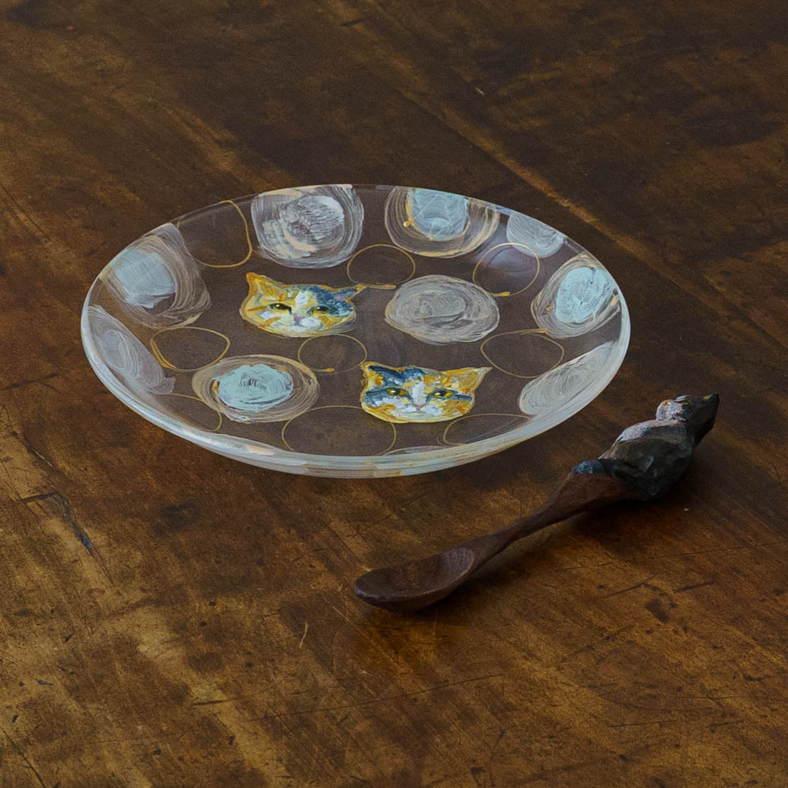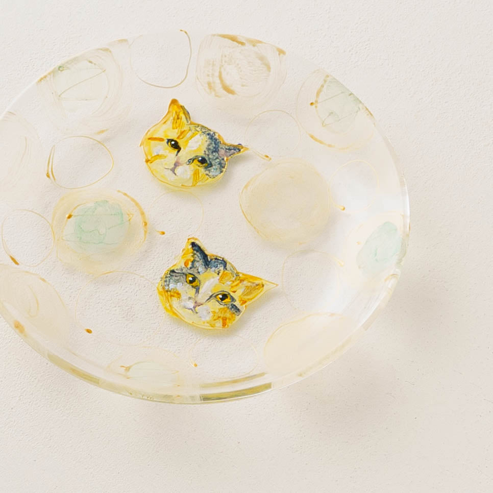 表情豊かな木彫りの猫から、のびやかな猫のポーズやふわふわの毛並みが軽やかに描かれたうつわやガラスへの絵付け。木彫りと絵付け、行き来する制作の中で、互いに刺激を受けながら猫の世界は少しずつ広がっています。