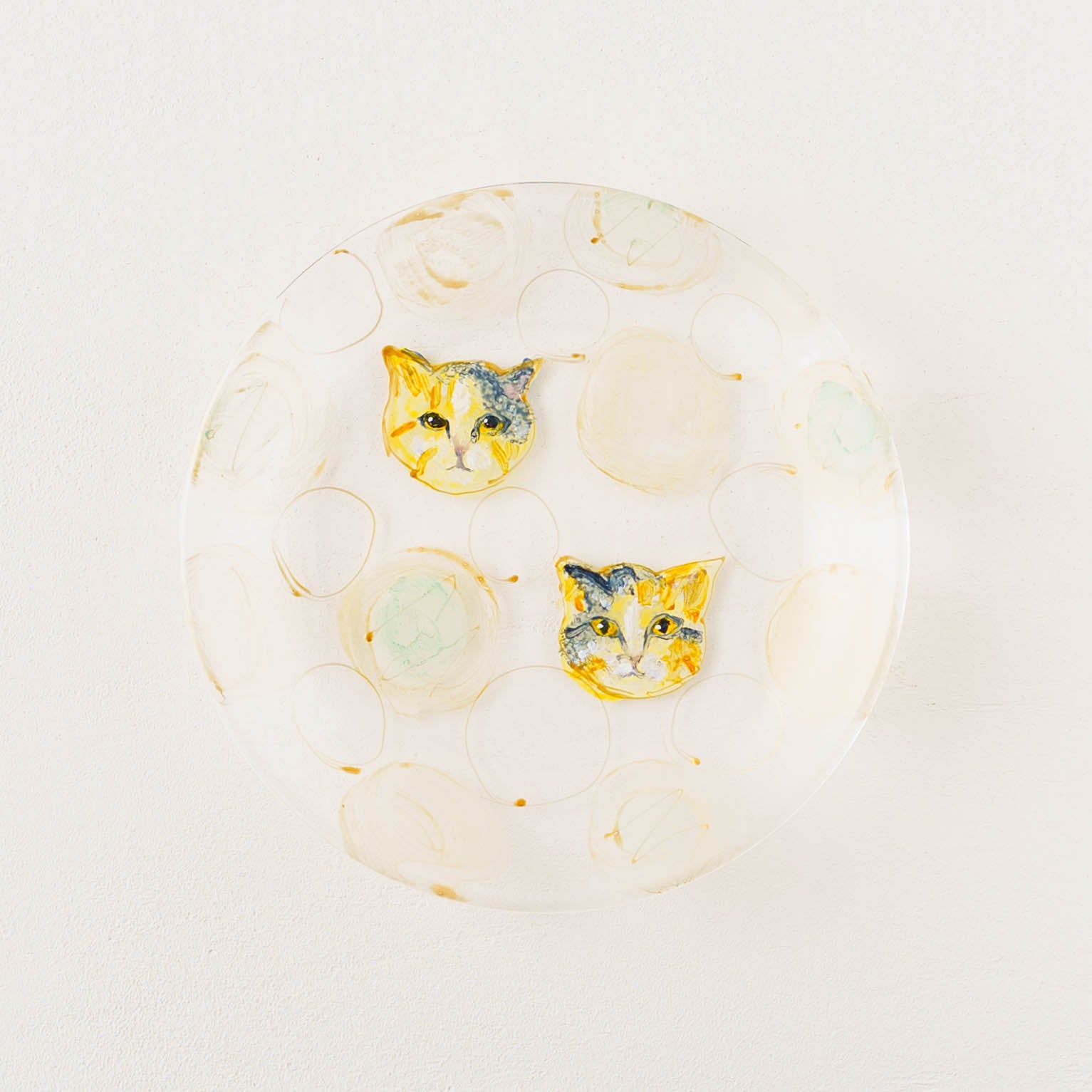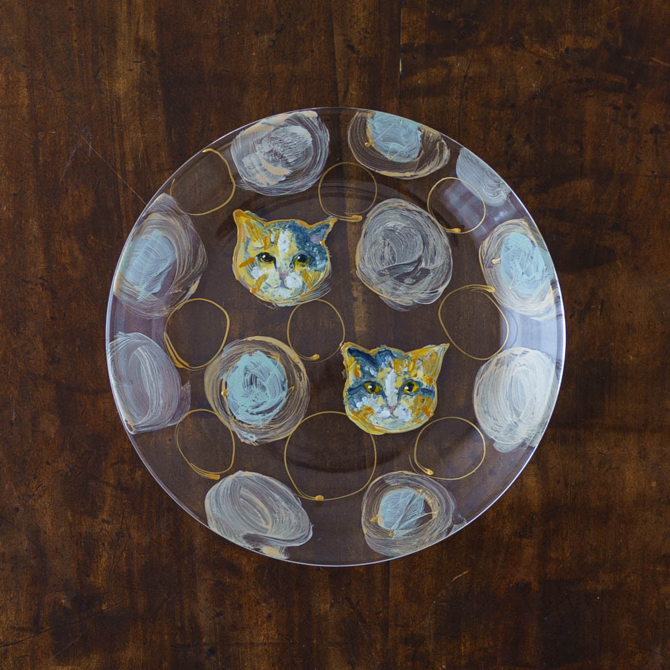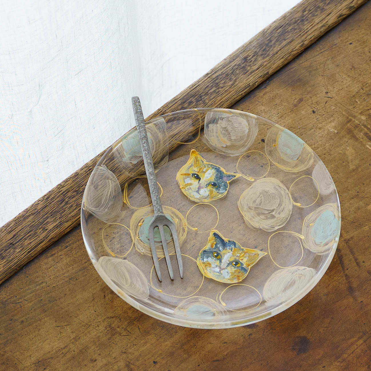 表情豊かな木彫りの猫から、のびやかな猫のポーズやふわふわの毛並みが軽やかに描かれたうつわやガラスへの絵付け。木彫りと絵付け、行き来する制作の中で、互いに刺激を受けながら猫の世界は少しずつ広がっています。