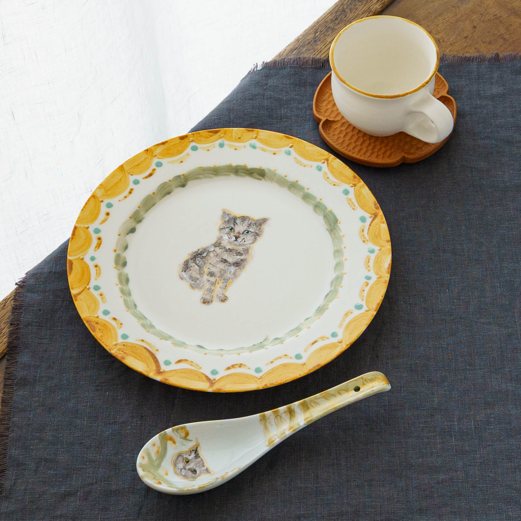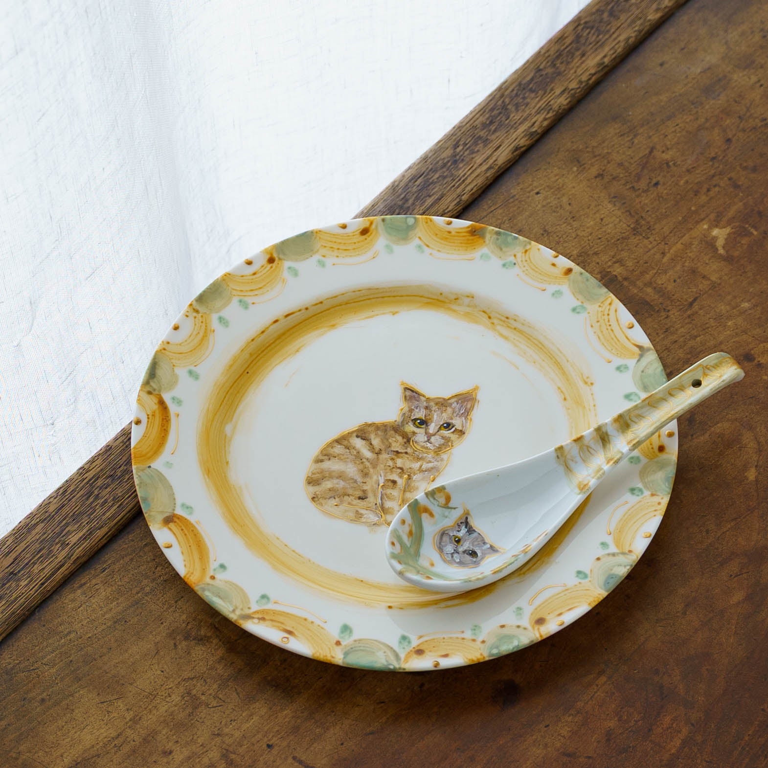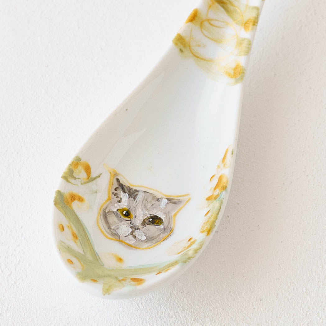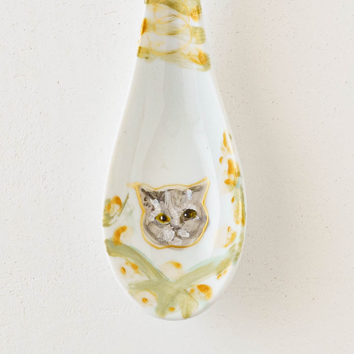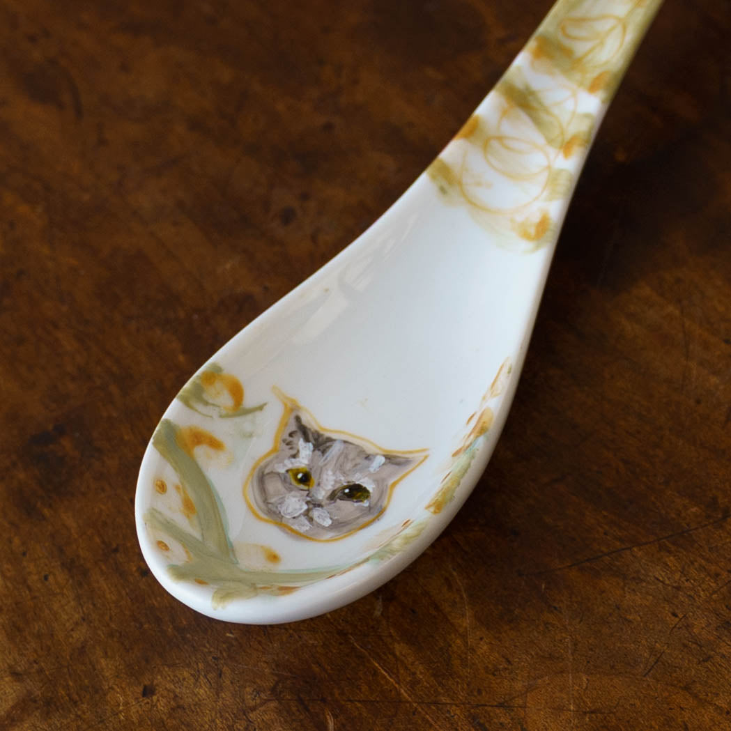 表情豊かな木彫りの猫から、のびやかな猫のポーズやふわふわの毛並みが軽やかに描かれたうつわやガラスへの絵付け。木彫りと絵付け、行き来する制作の中で、互いに刺激を受けながら猫の世界は少しずつ広がっています。