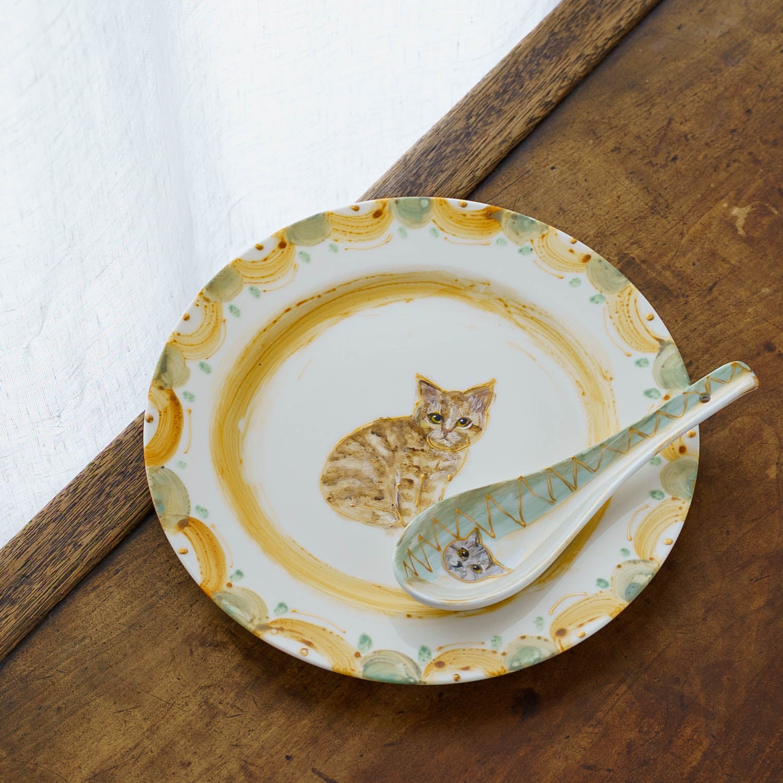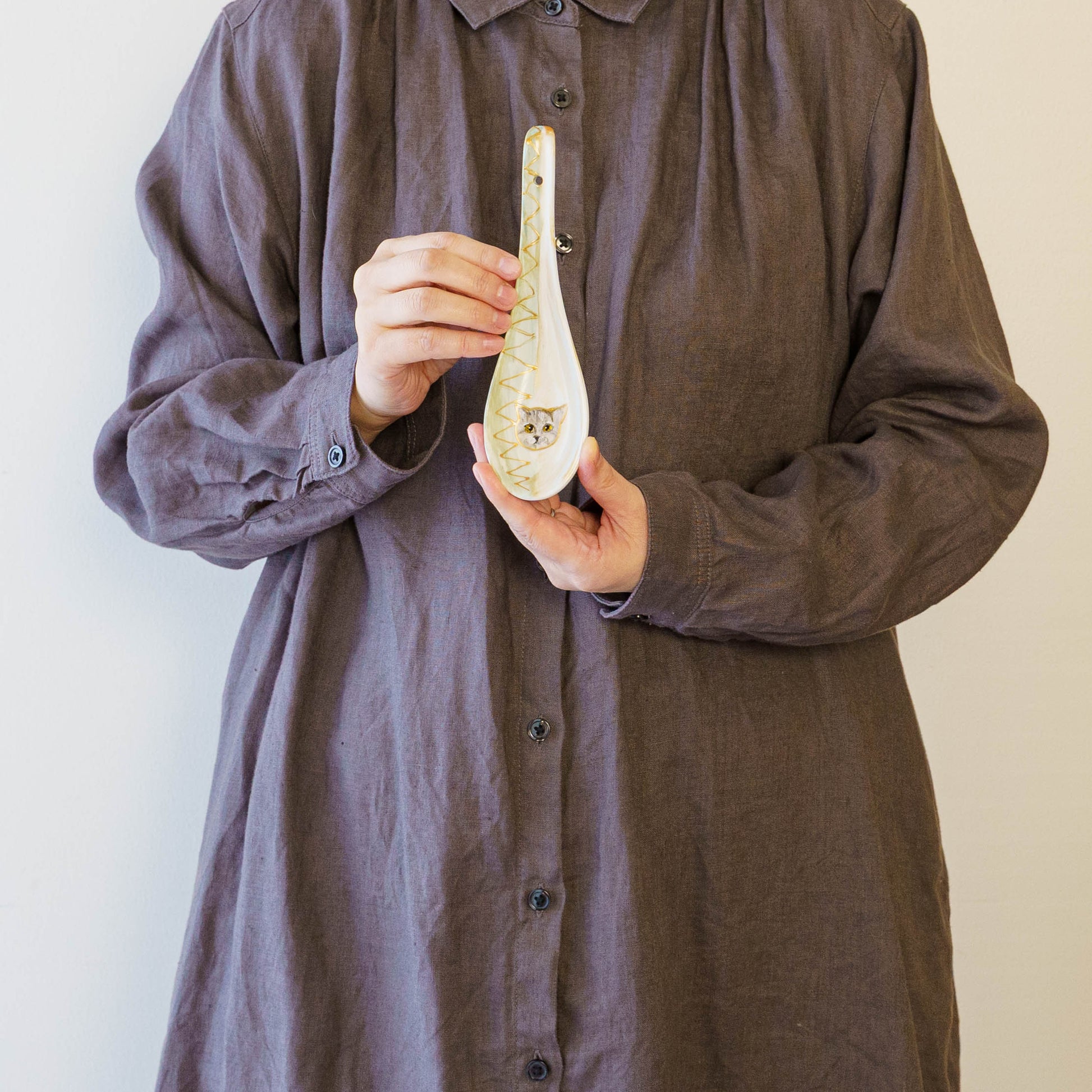 表情豊かな木彫りの猫から、のびやかな猫のポーズやふわふわの毛並みが軽やかに描かれたうつわやガラスへの絵付け。木彫りと絵付け、行き来する制作の中で、互いに刺激を受けながら猫の世界は少しずつ広がっています。
