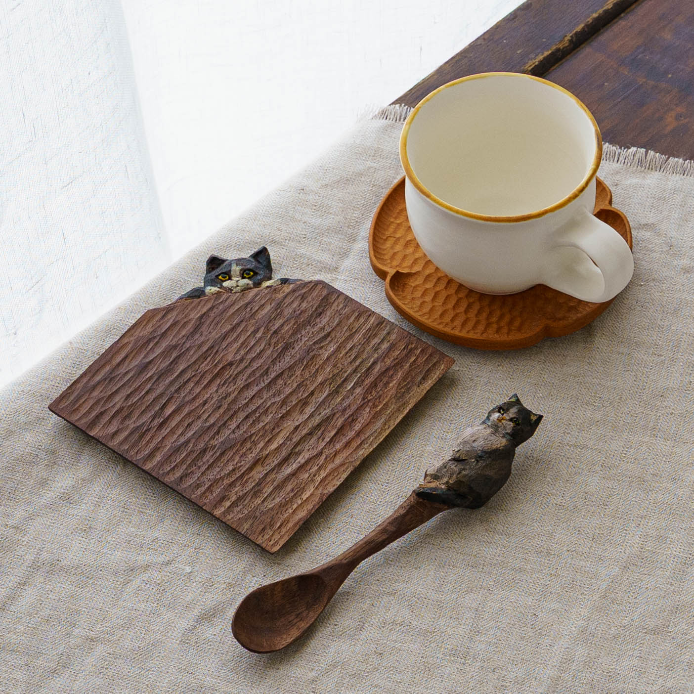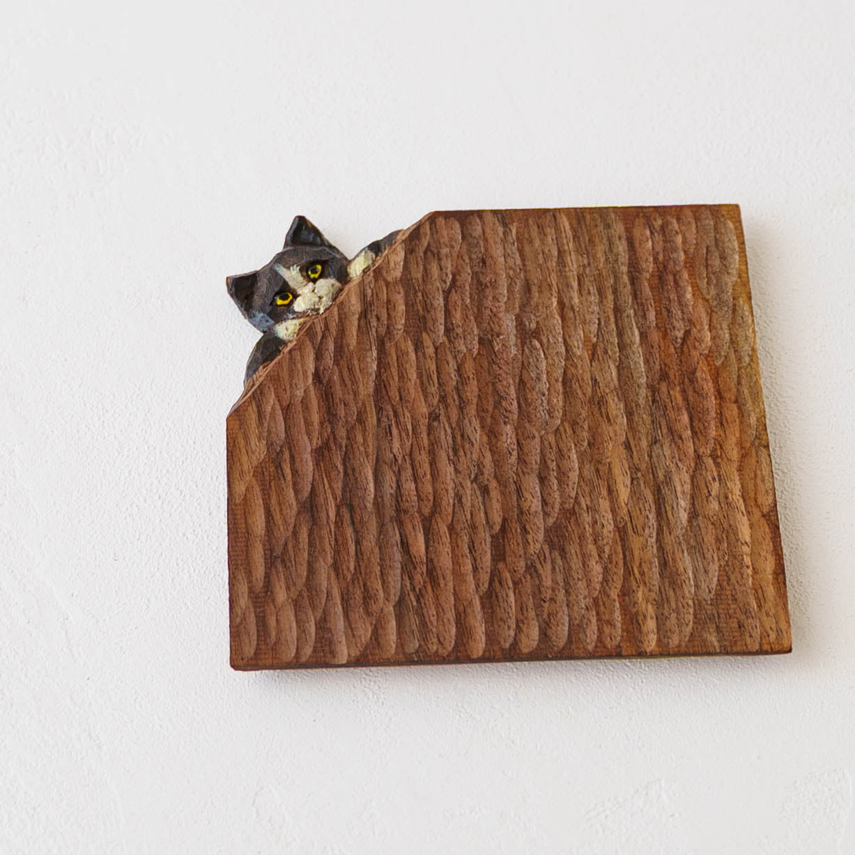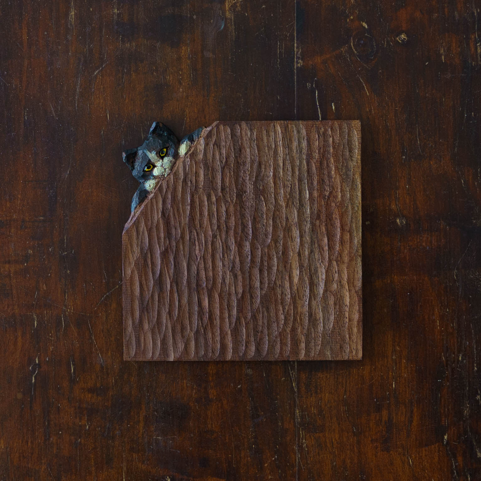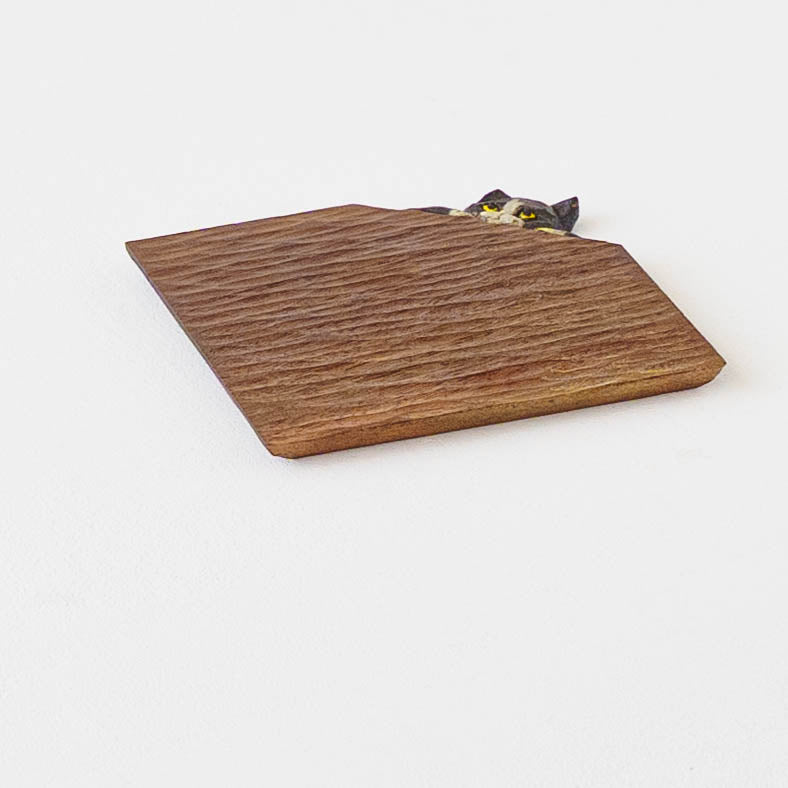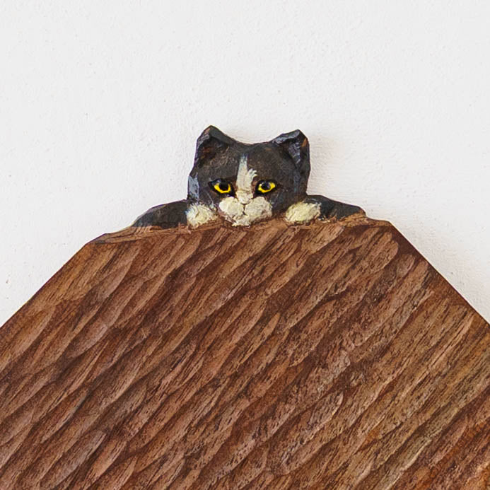 表情豊かな木彫りの猫から、のびやかな猫のポーズやふわふわの毛並みが軽やかに描かれたうつわやガラスへの絵付け。木彫りと絵付け、行き来する制作の中で、互いに刺激を受けながら猫の世界は少しずつ広がっています。