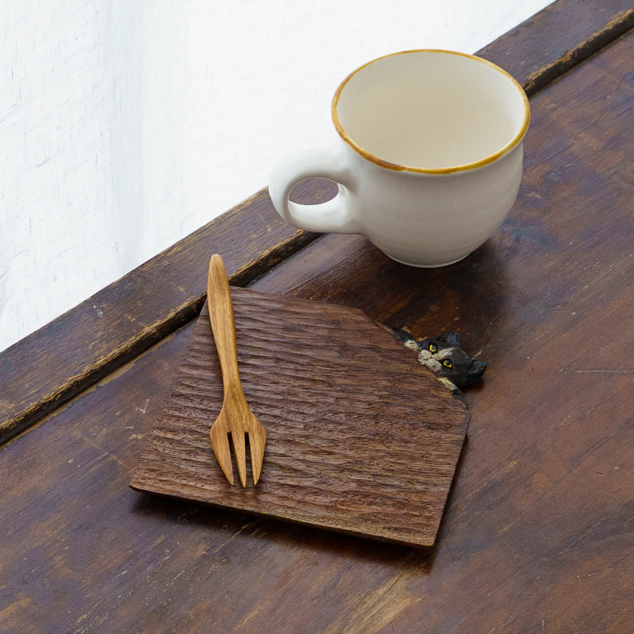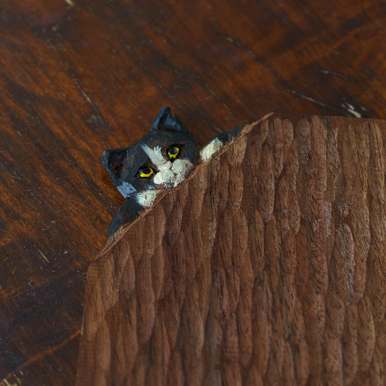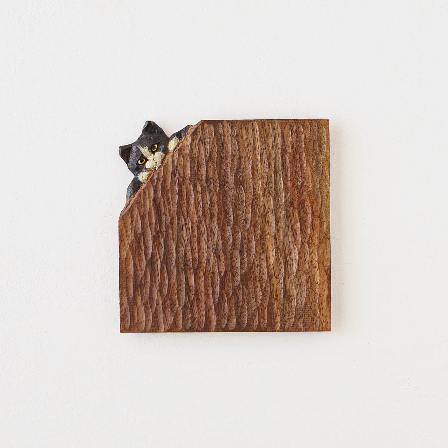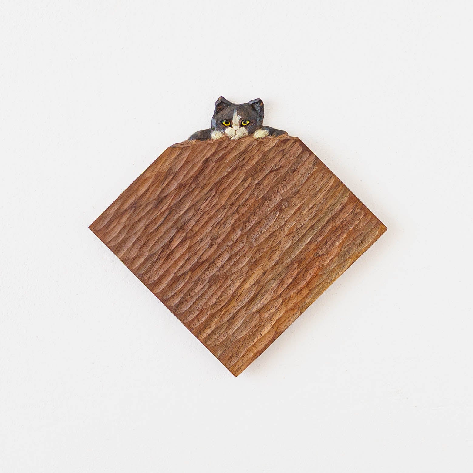表情豊かな木彫りの猫から、のびやかな猫のポーズやふわふわの毛並みが軽やかに描かれたうつわやガラスへの絵付け。木彫りと絵付け、行き来する制作の中で、互いに刺激を受けながら猫の世界は少しずつ広がっています。